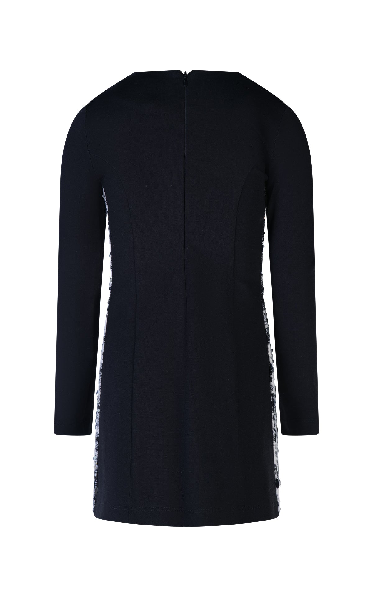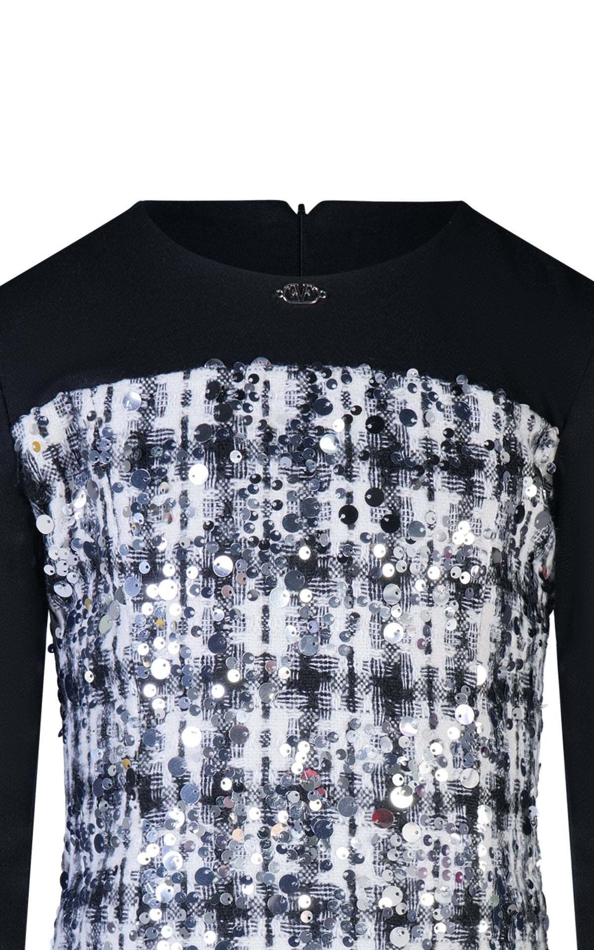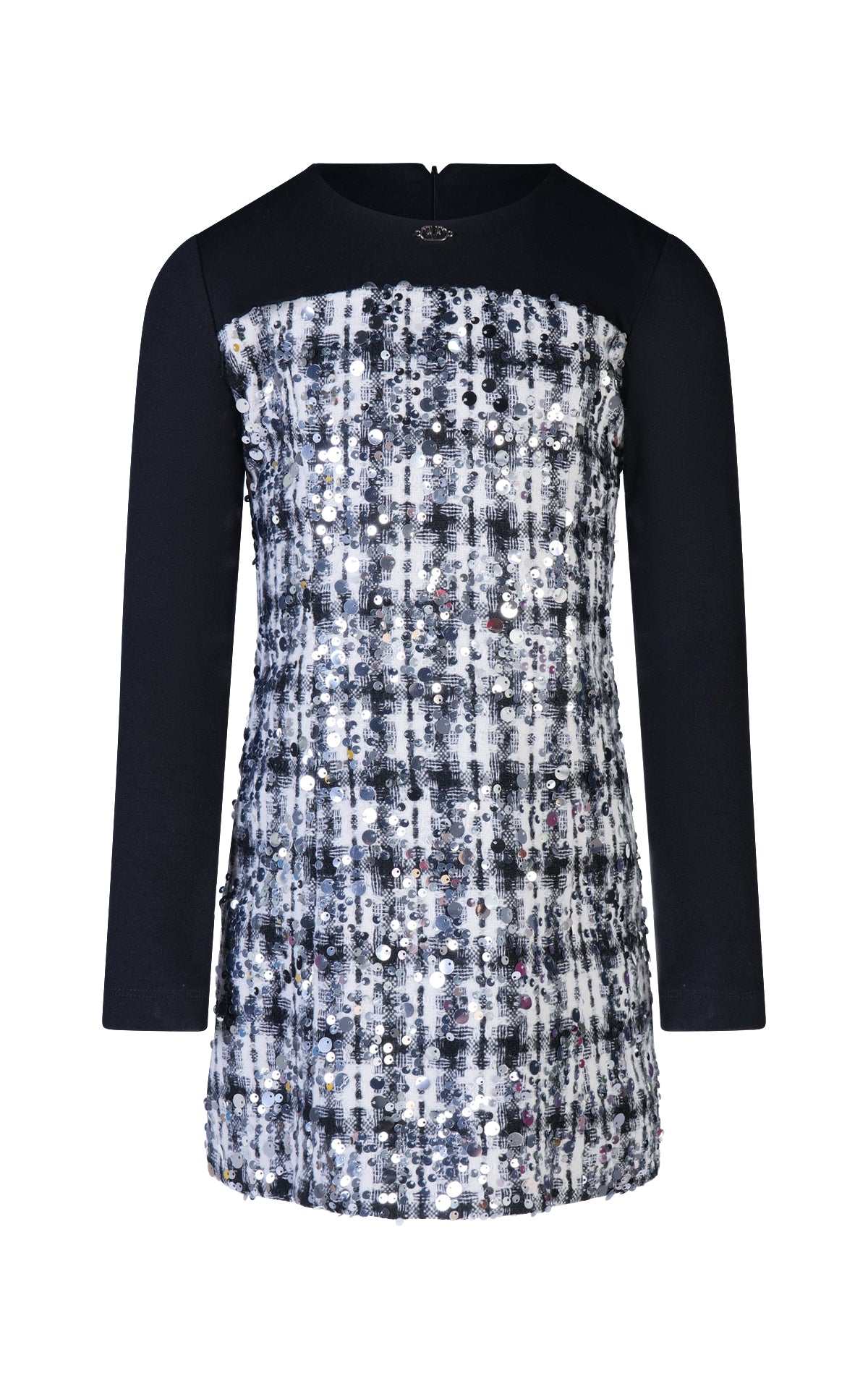 Elegante vestito a manica lunga con linea leggermente svasata sul fondo, realizzato in pregiato tessuto Punto Milano abbinato a inserti in tessuto operato con paillettes per un effetto luminoso e sofisticato. La chiusura posteriore con zip tono su tono garantisce una vestibilità pratica e raffinata, mentre il dettaglio logo frontale firma il capo con un tocco iconico. Ideale per occasioni speciali o look chic, perfetto per bambine e ragazze che amano distinguersi con stile. Pensato per clienti in Italia e nel mondo.