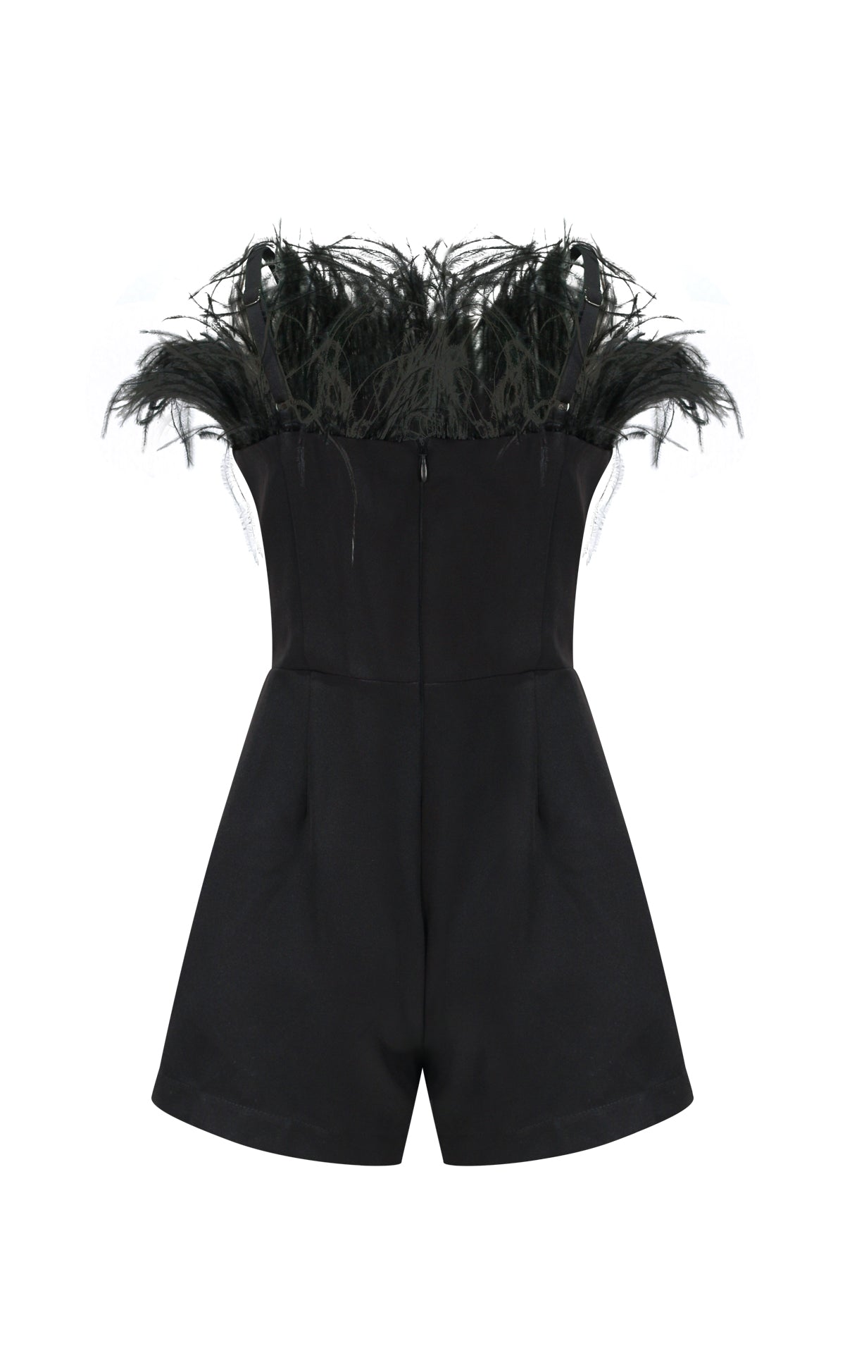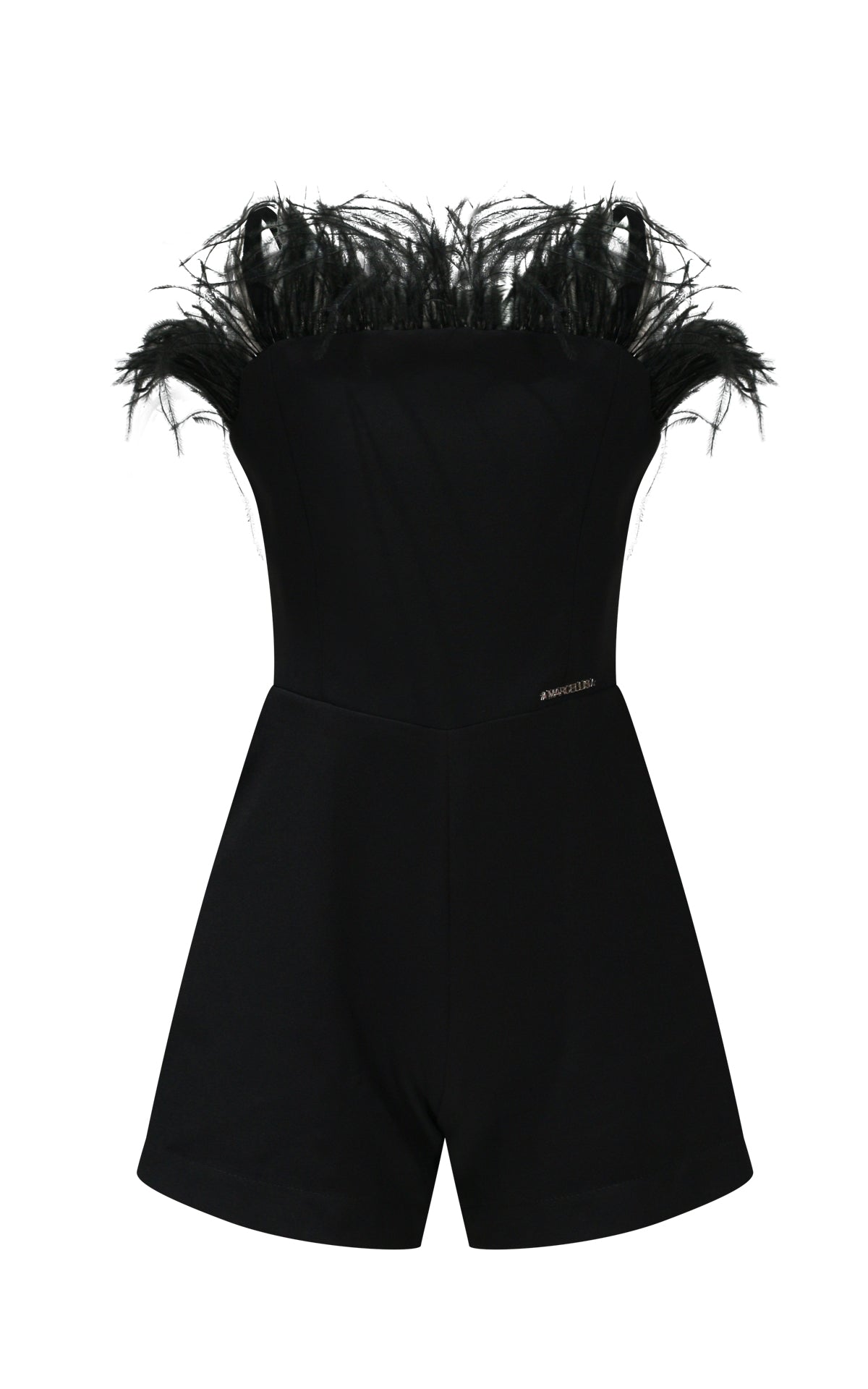 Tutina Corta in Tessuto Tecnico con Bretelle Regolabili e Scollo con Piume – Placchetta Logo
