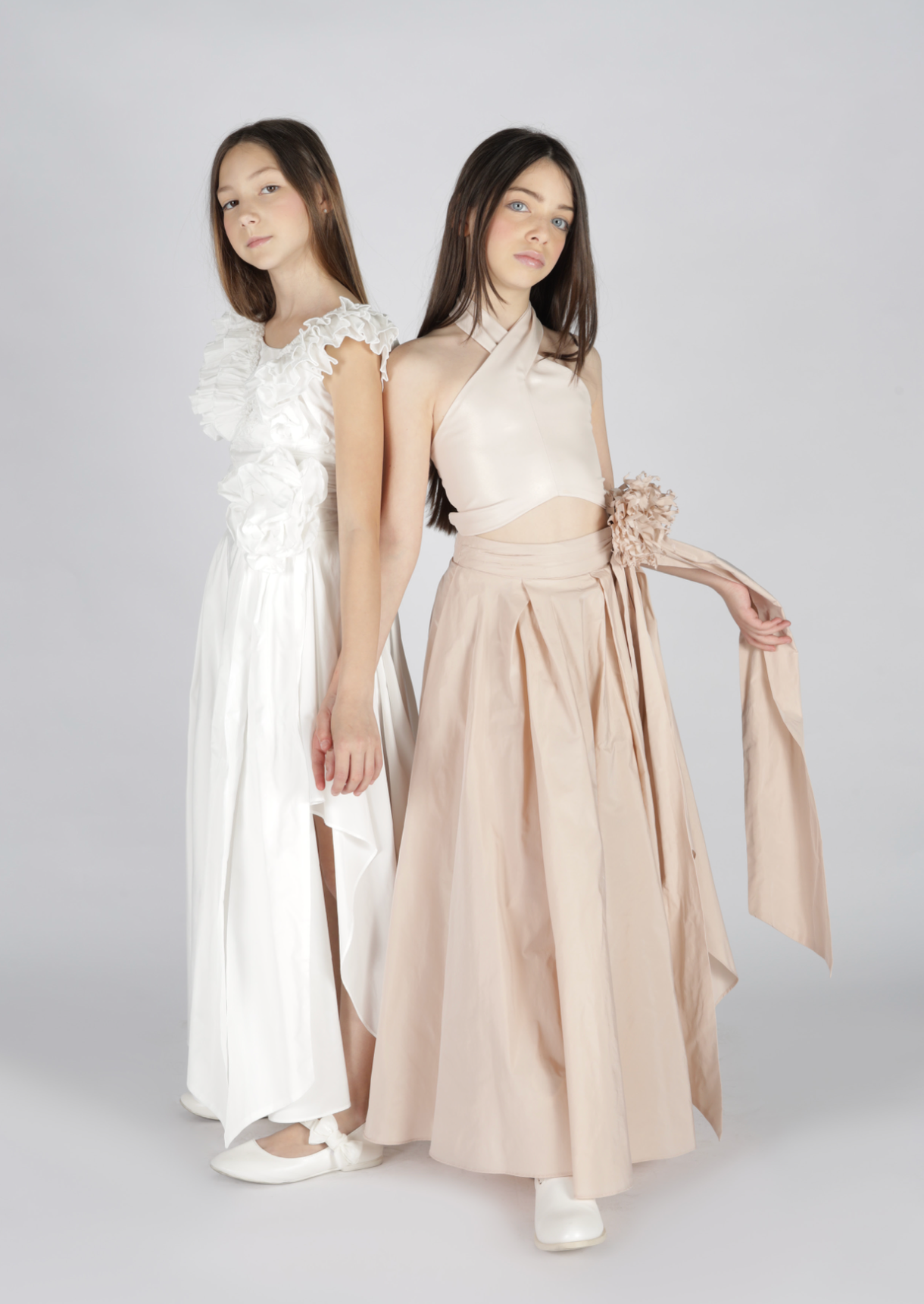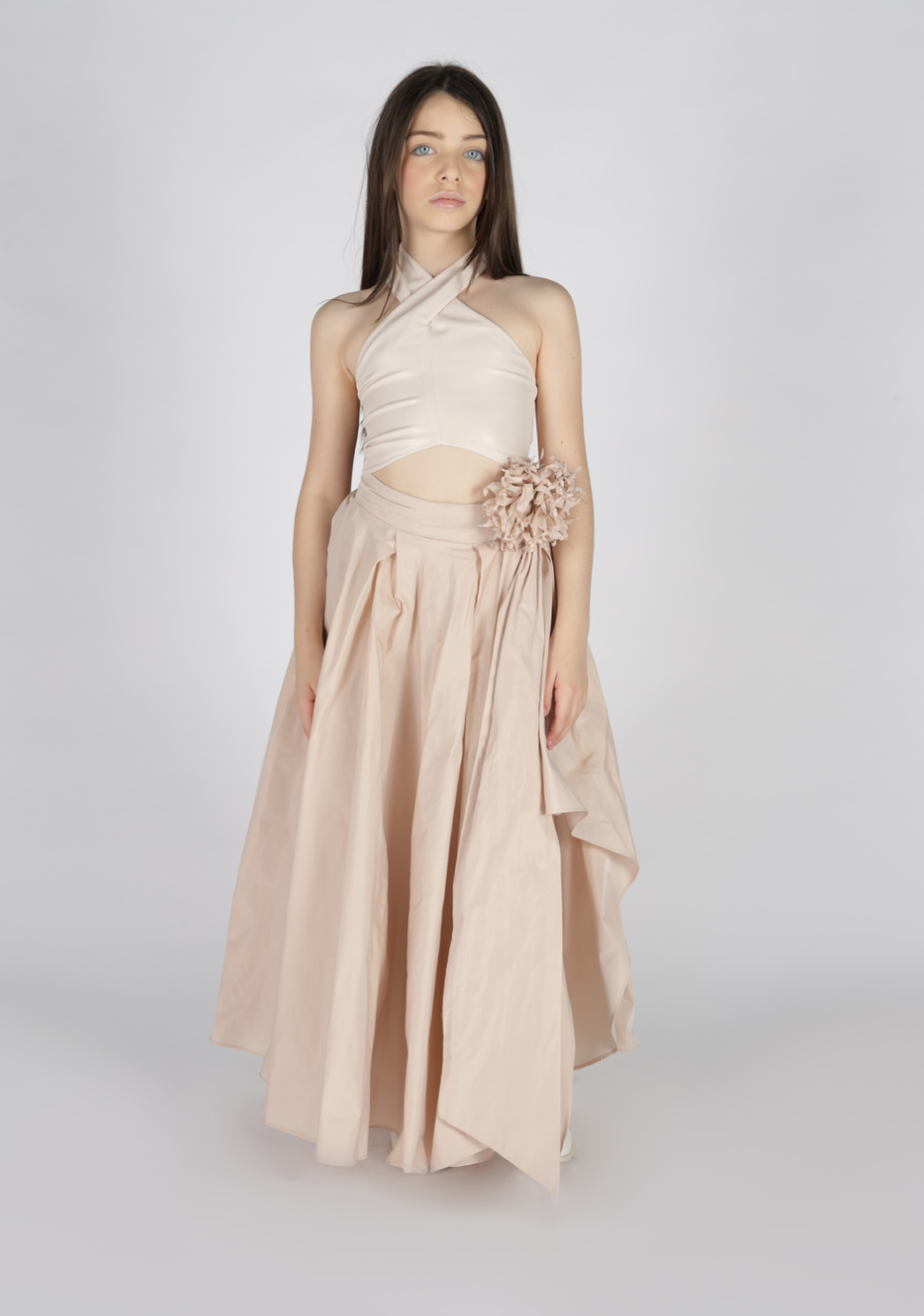This long skirt in taffeta fabric is a masterpiece of elegance and comfort. With a matching internal short, it is perfect for a fluid and dynamic silhouette. The wide side slit adds a touch of boldness to the design, while the zip closure on the back guarantees a perfect fit. A sophisticated and versatile look for special occasions.