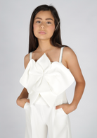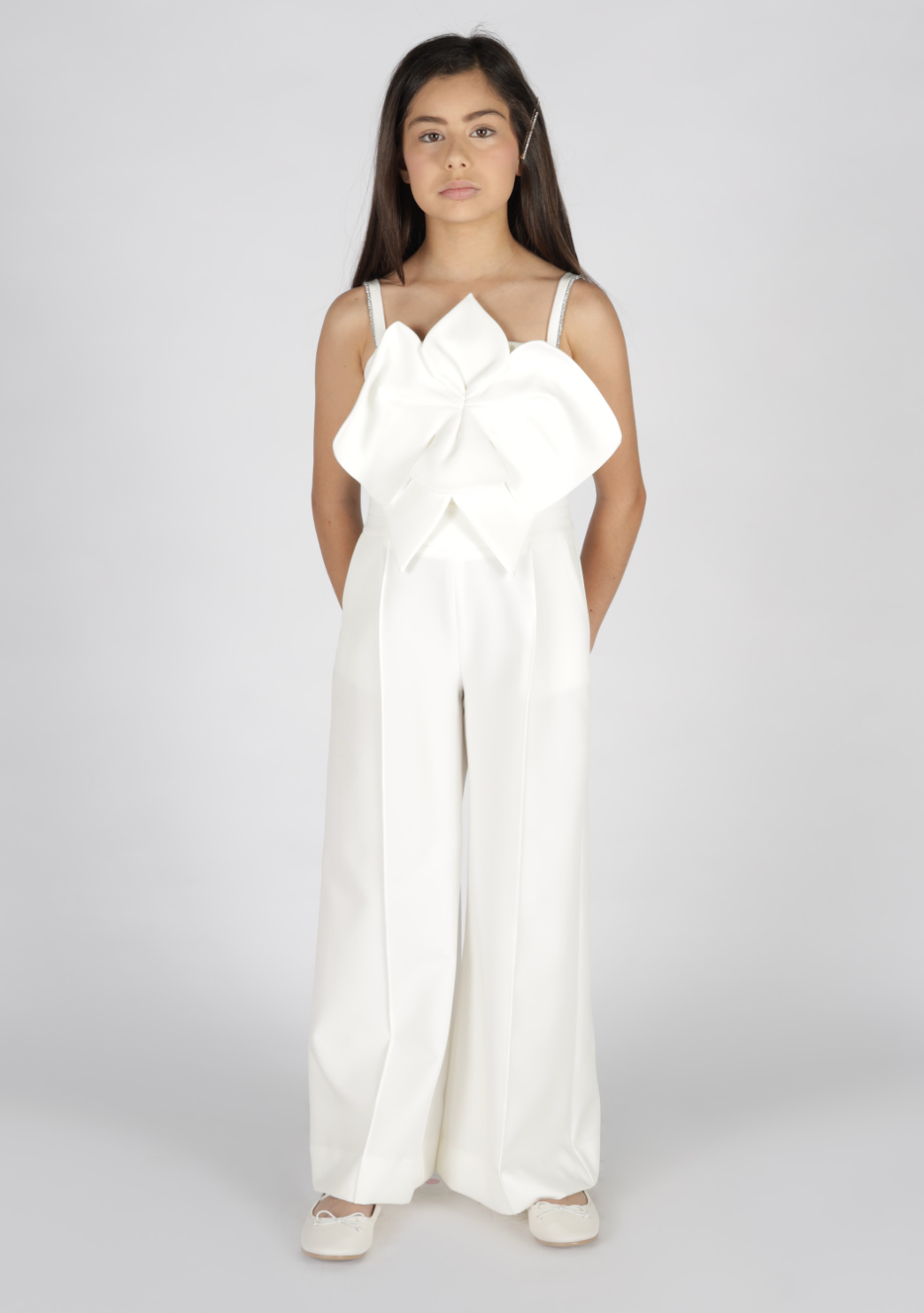 Elegant long jumpsuit in technical fabric from the Fun&Fun Couture line, featuring a straight neckline and sleeveless for a modern and sophisticated look. The front detail with a flower applied in tone-on-tone fabric adds a touch of refinement, while the adjustable straps embellished with rhinestones guarantee a perfect fit and an illuminating note of luxury. The back zip closure ensures practicality and comfort. An ideal garment for special occasions or elegant evenings.