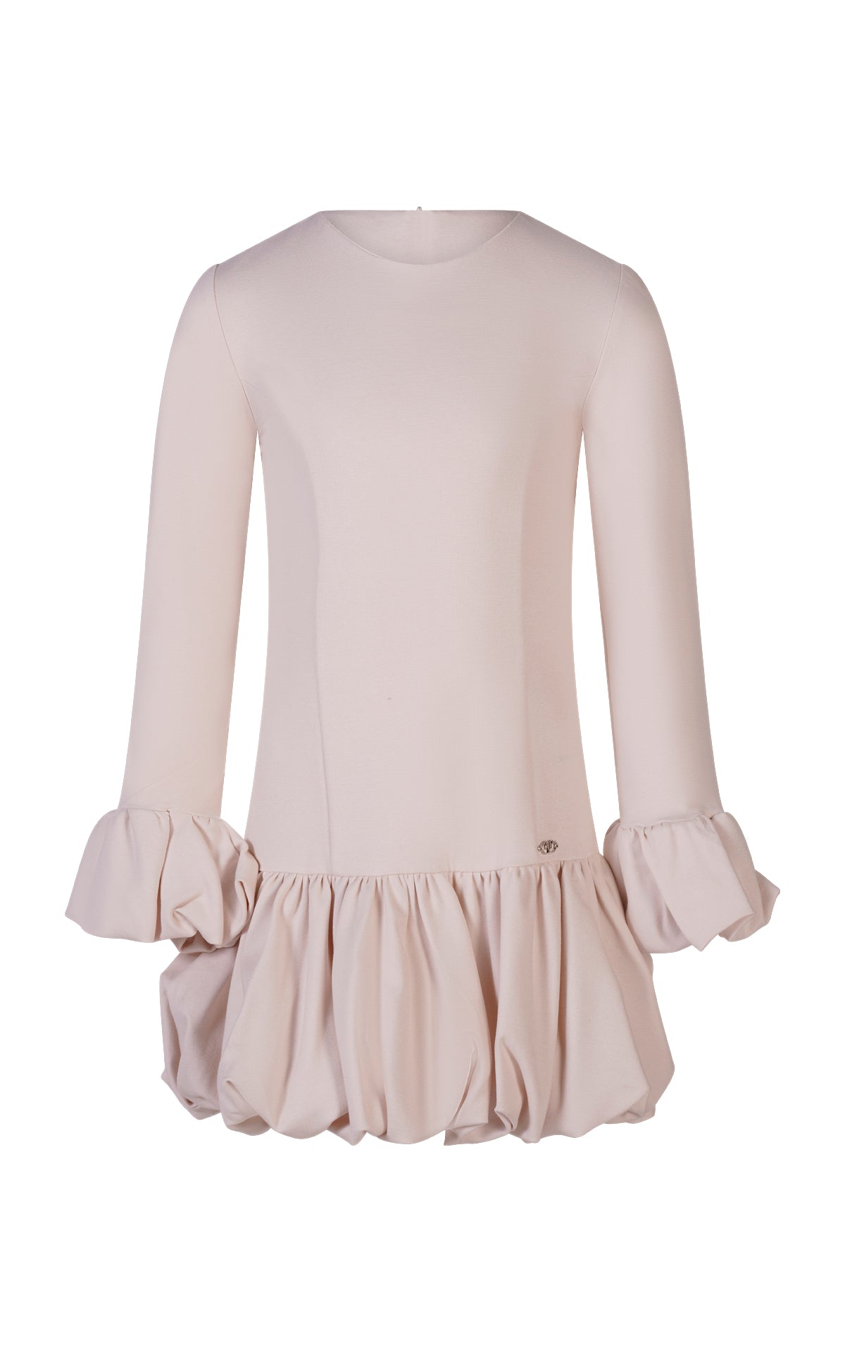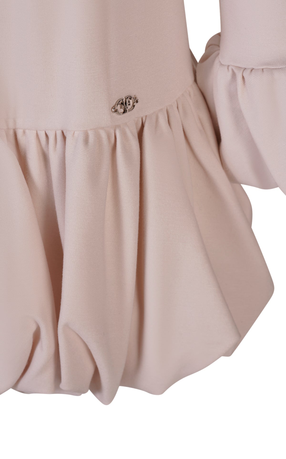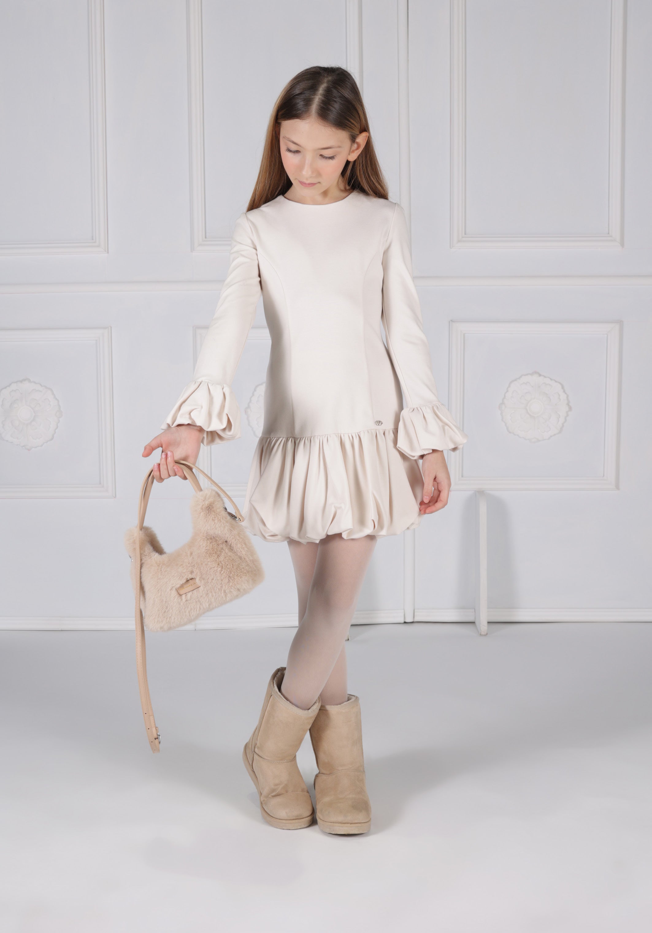 A comfortable and structured dress in Milano stitch fabric, featuring long sleeves and a puffed hem for a modern, voluminous look. Matching puffed sleeve cuffs. Embroidered logo detail on the front side adds an iconic touch. Convenient back zip closure with a matching color. An elegant yet versatile dress, perfect for girls and teenagers. Made in Italy, ships worldwide.