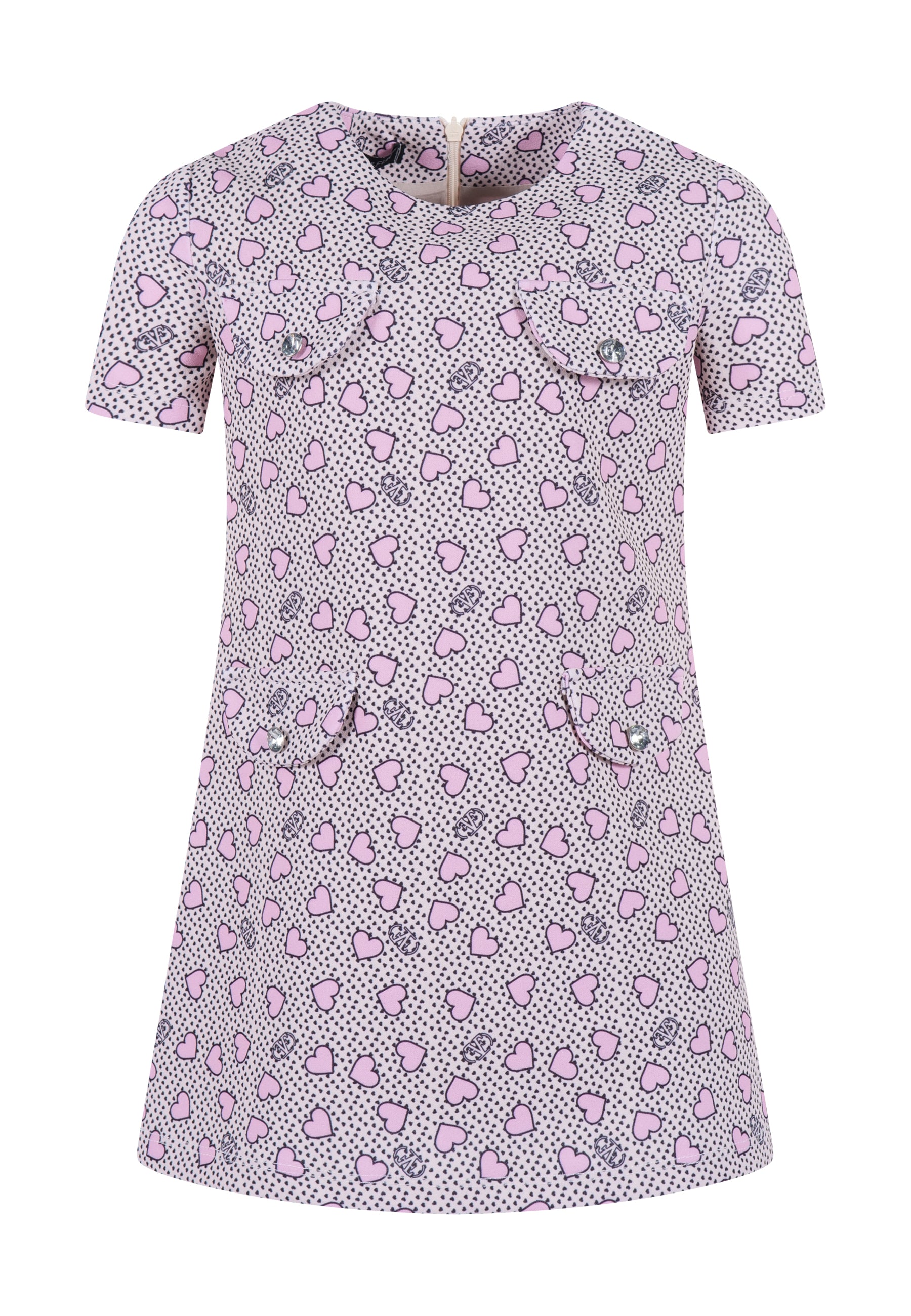 DRESS IN ELASTIC CREPE FABRIC WITH ALLOVER HEARTS AND LOGO PRINT. FLARED MODEL AT THE BOTTOM WITH CREW NECK AND SHORT SLEEVES. BACK CLOSURE WITH MATCHING ZIP. DECORATIVE FLAP WITH JEWEL BUTTON.