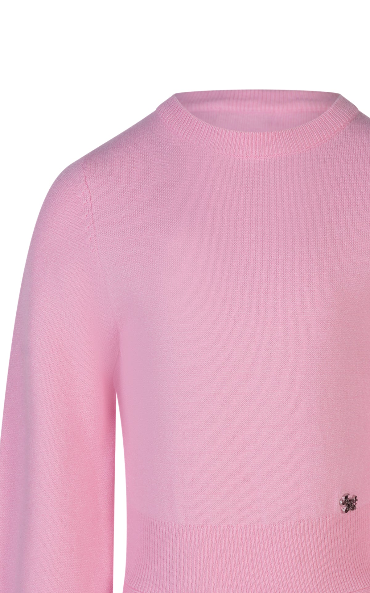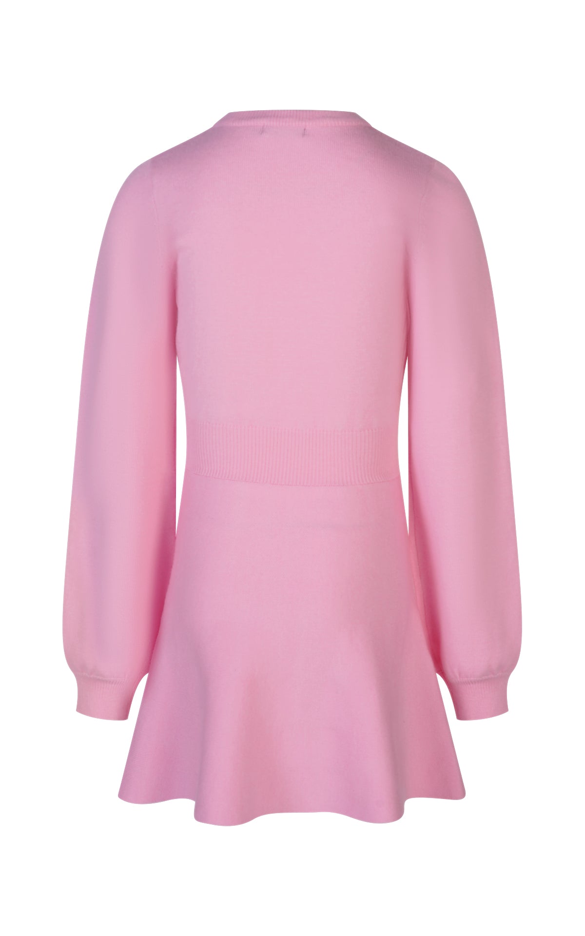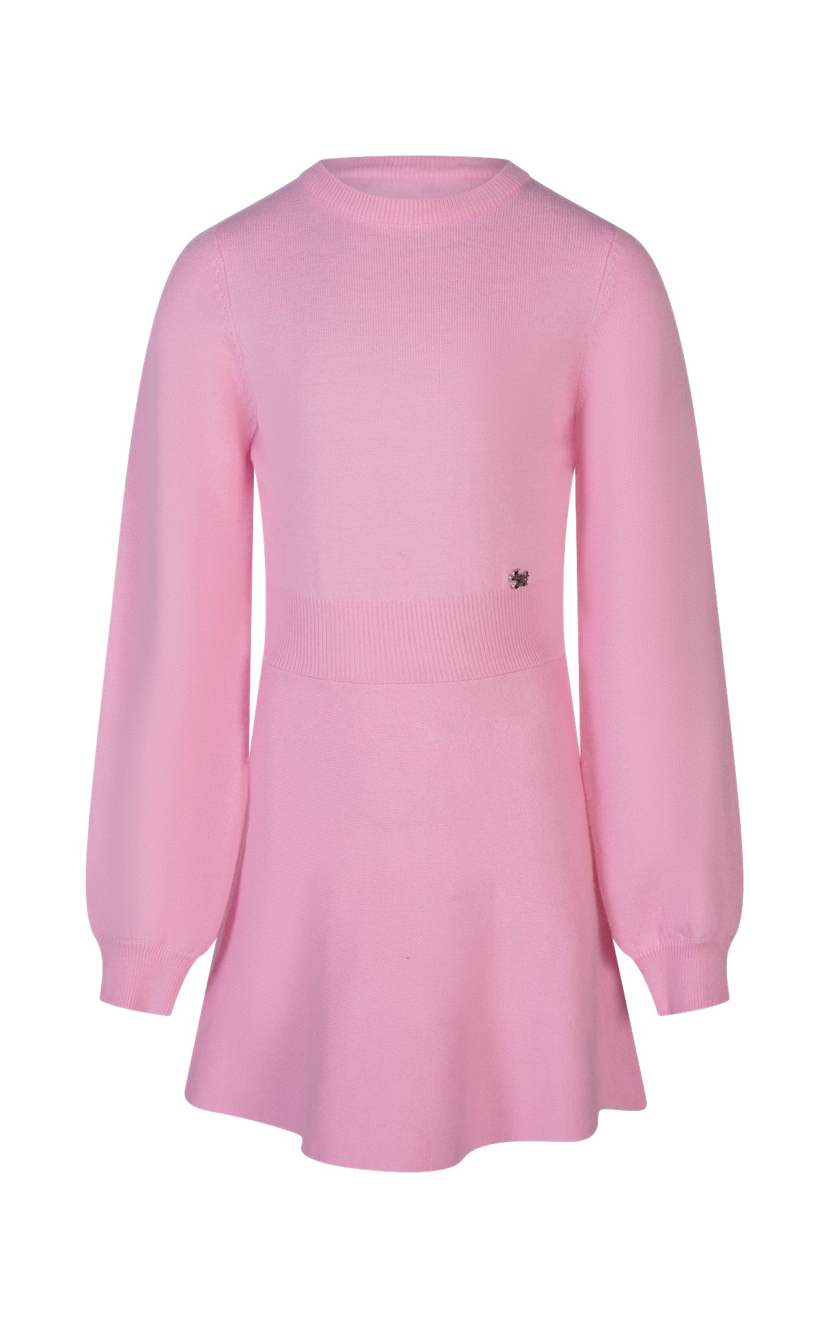 WOOL DRESS WITH A RIBBED WAISTBAND AND A LOGO PLATE, ROUND NECK AND LONG WIDE SLEEVES AND A FLARED GODET BOTTOM