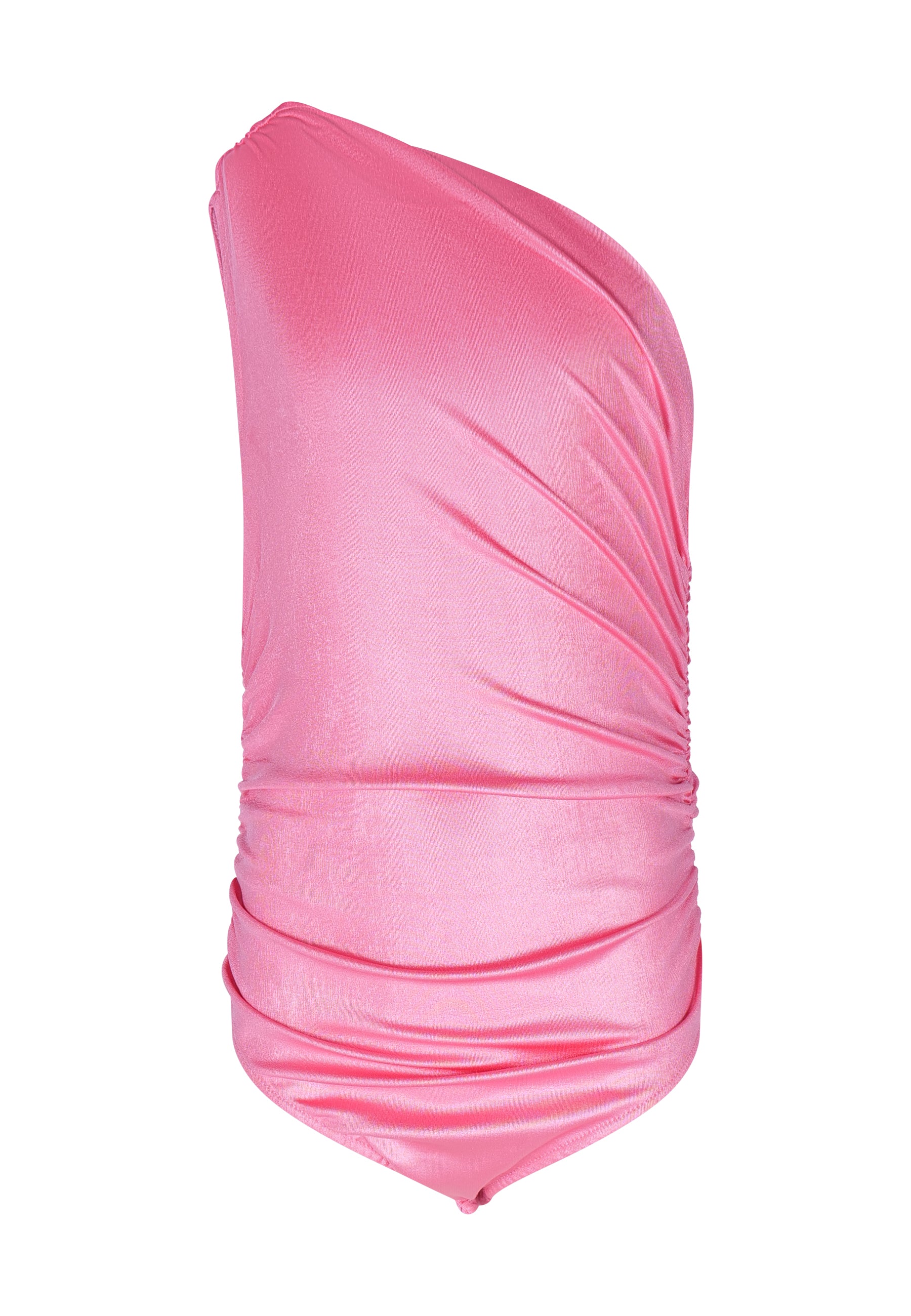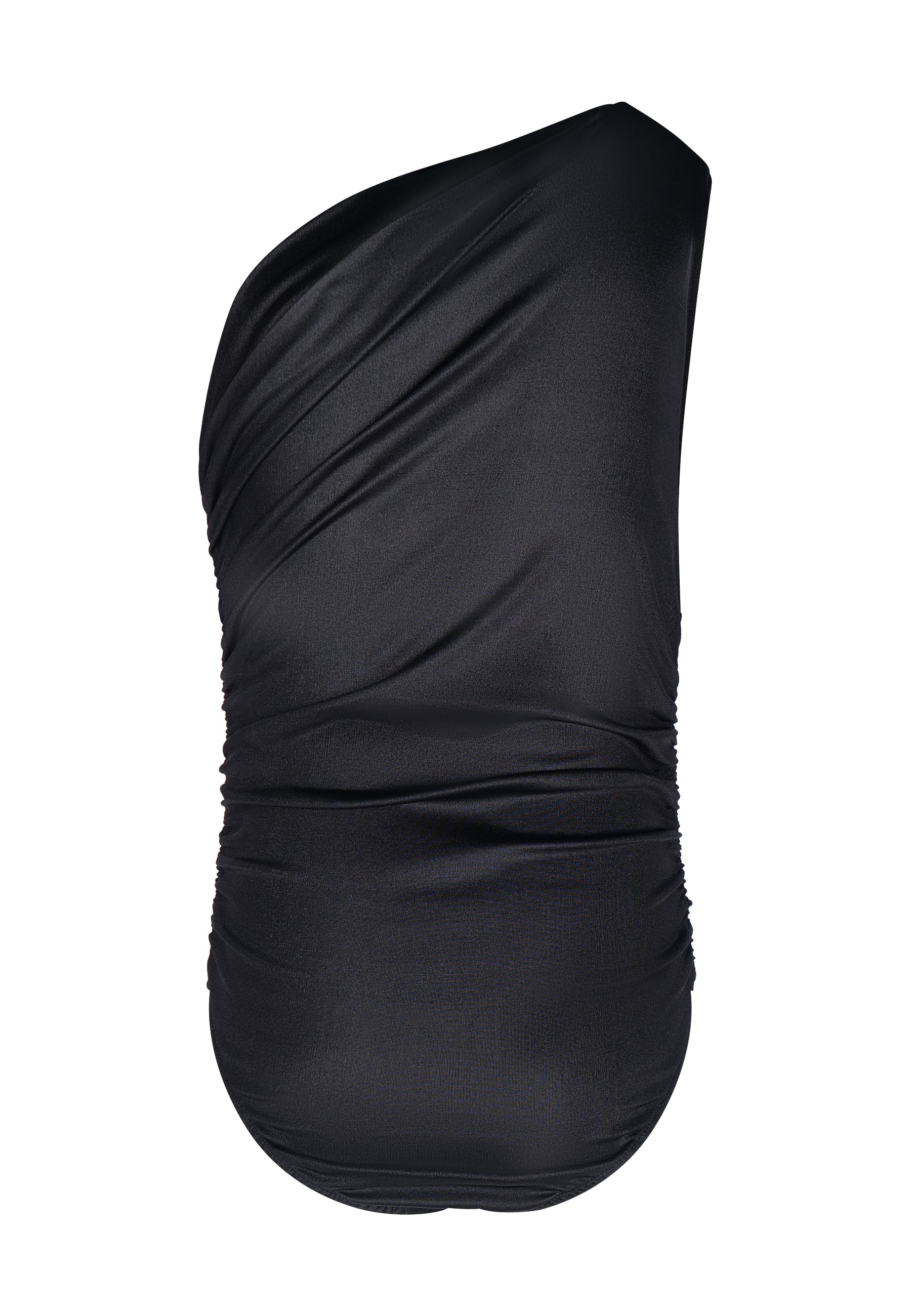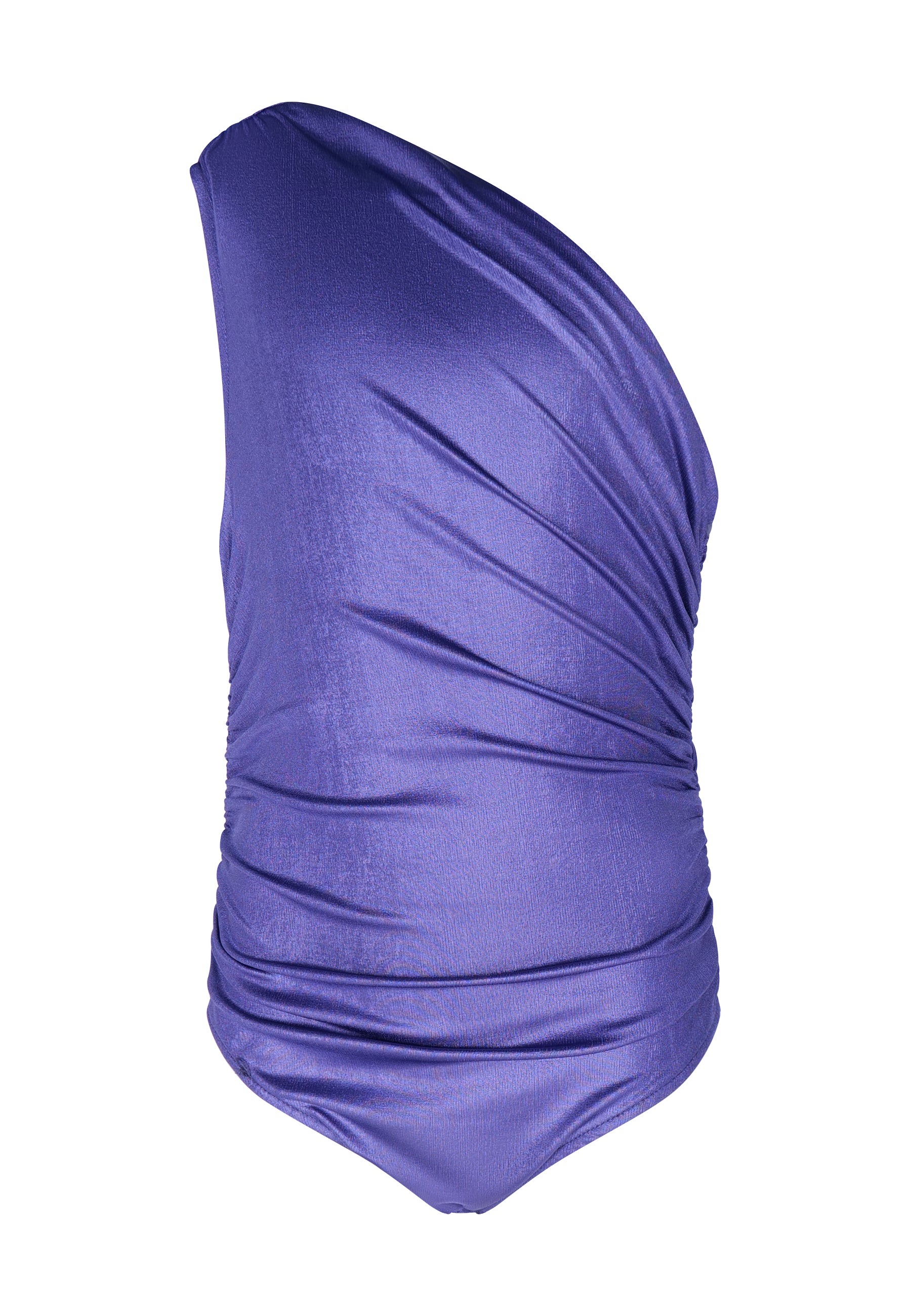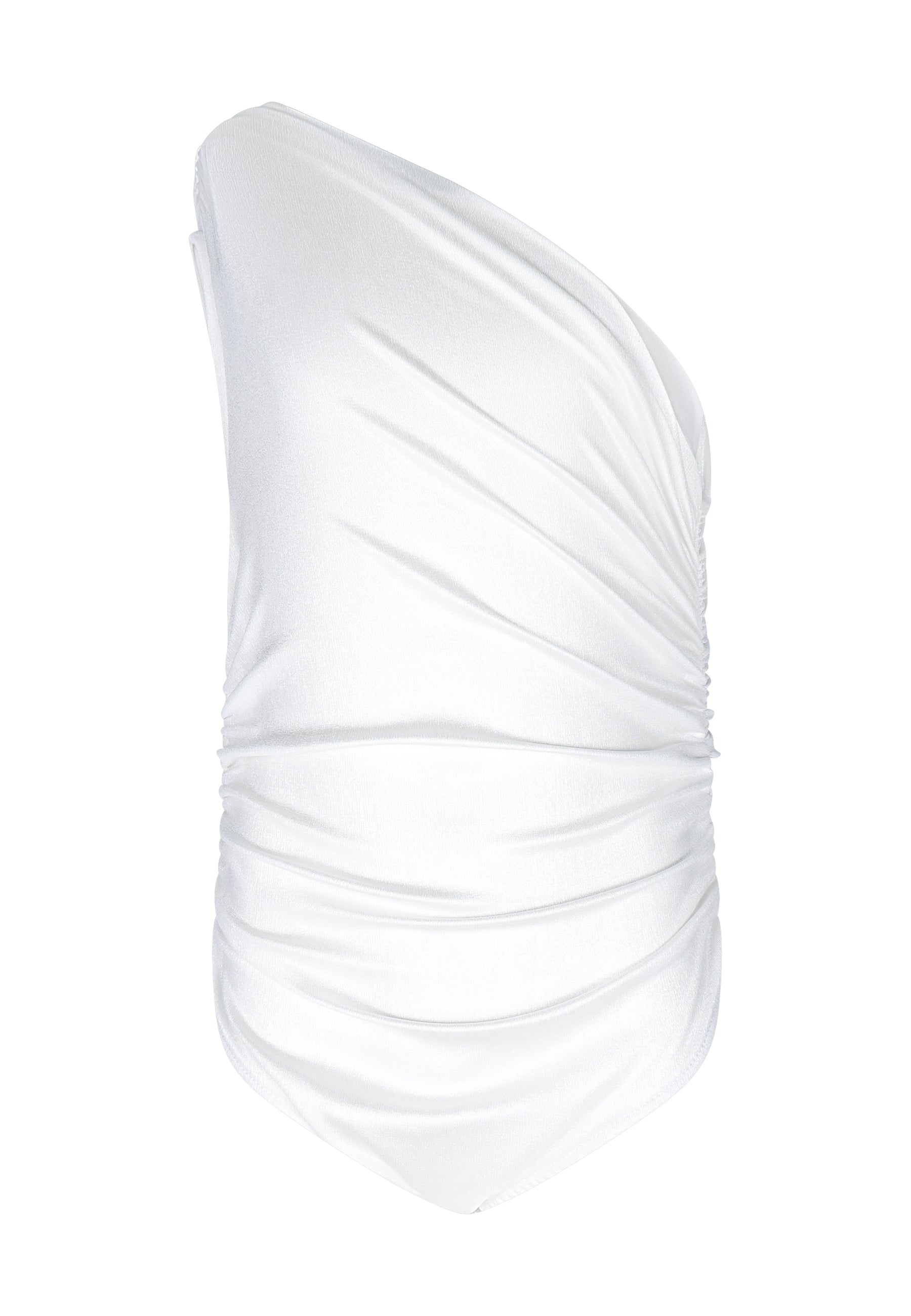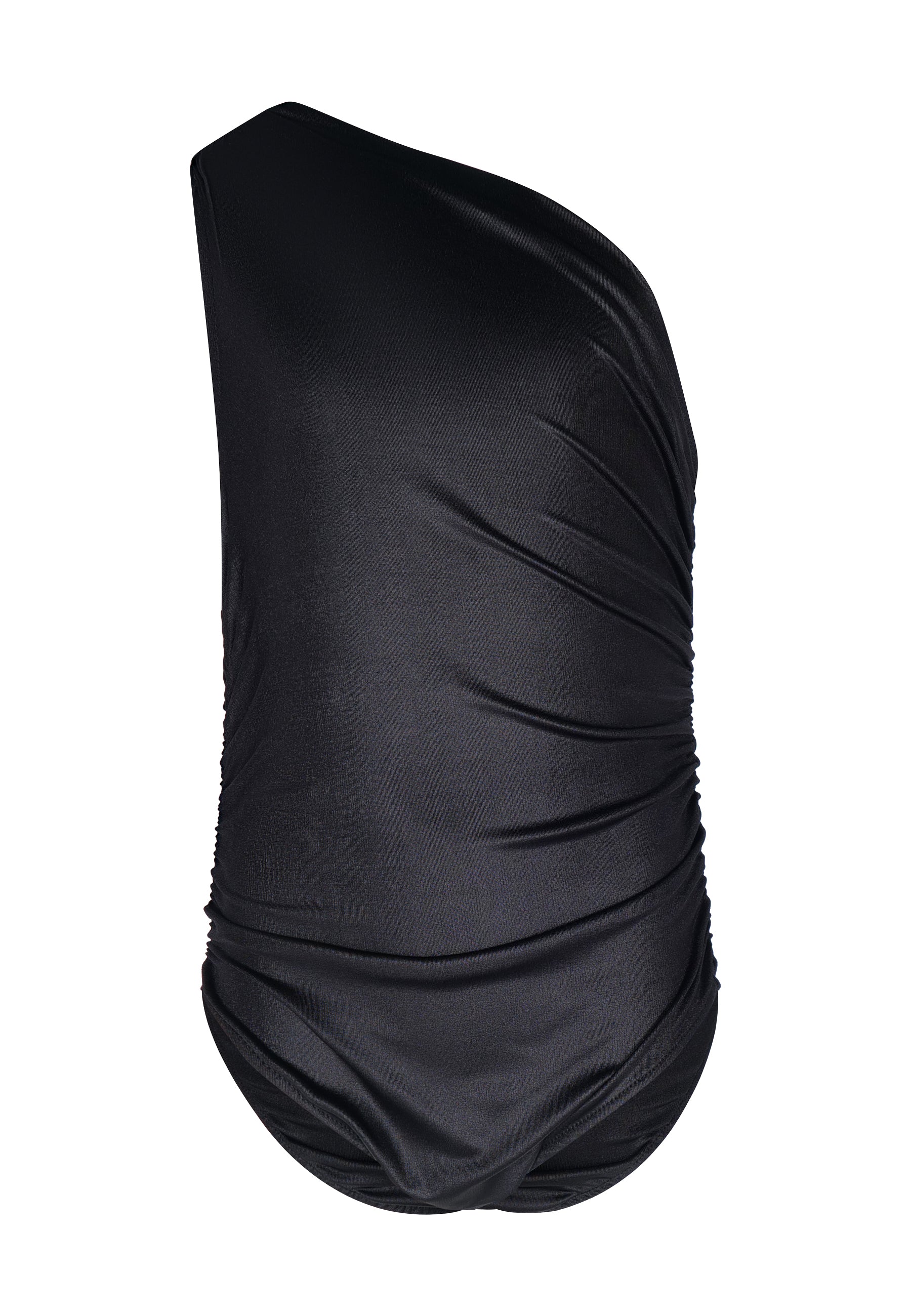 Asymmetrical draped bodysuit. One-shoulder bodysuit with ruching. Closure at the bottom with automatic buttons.