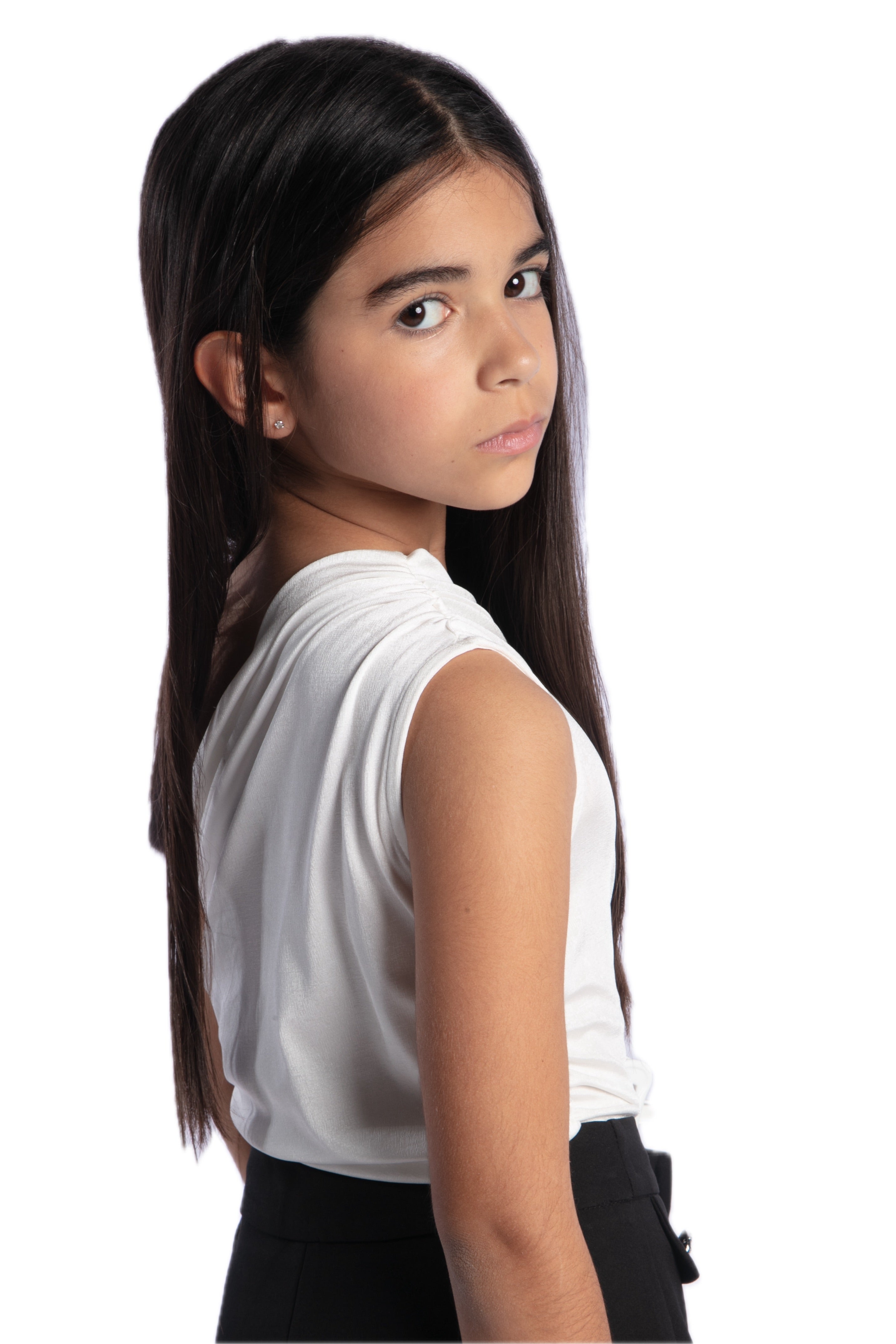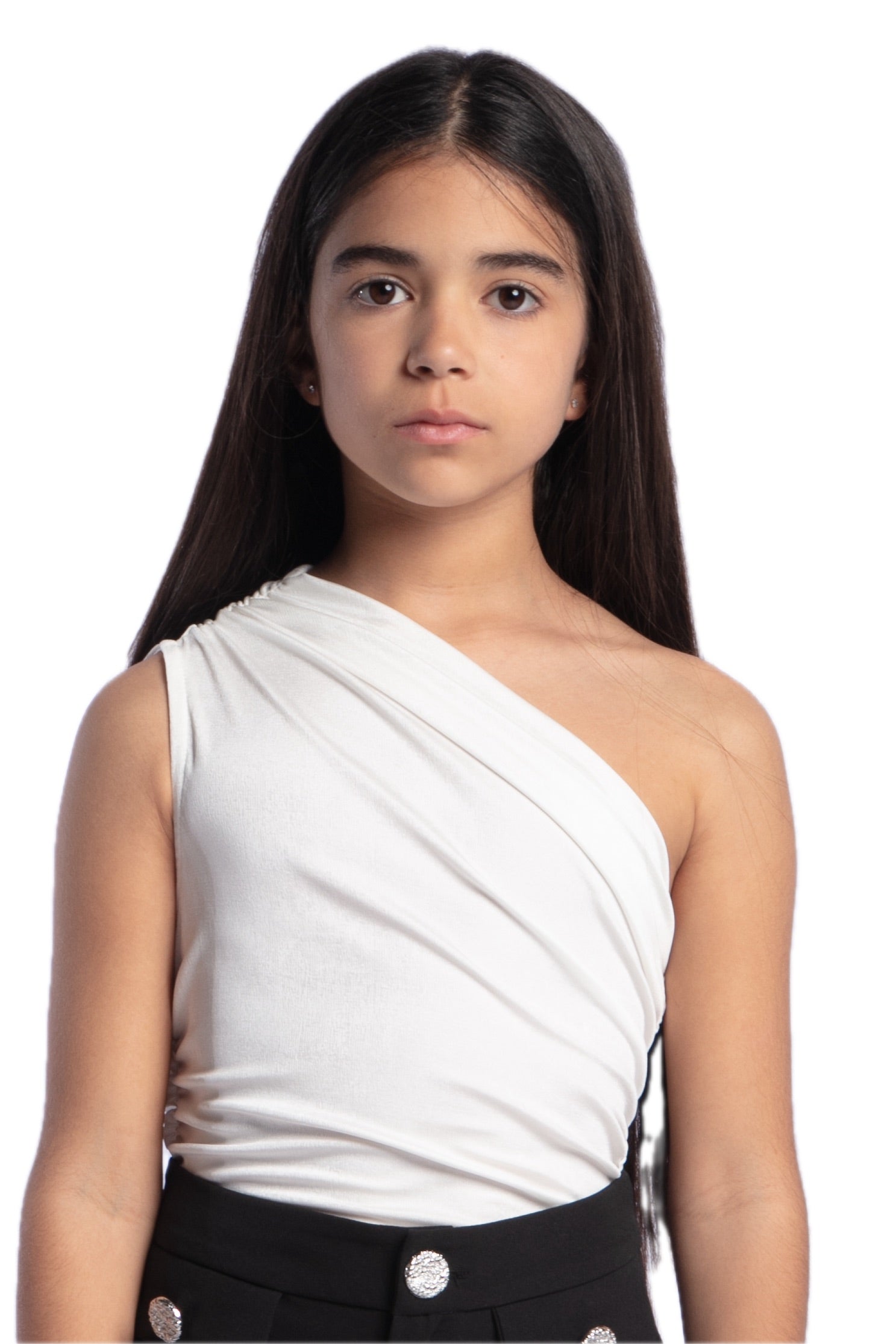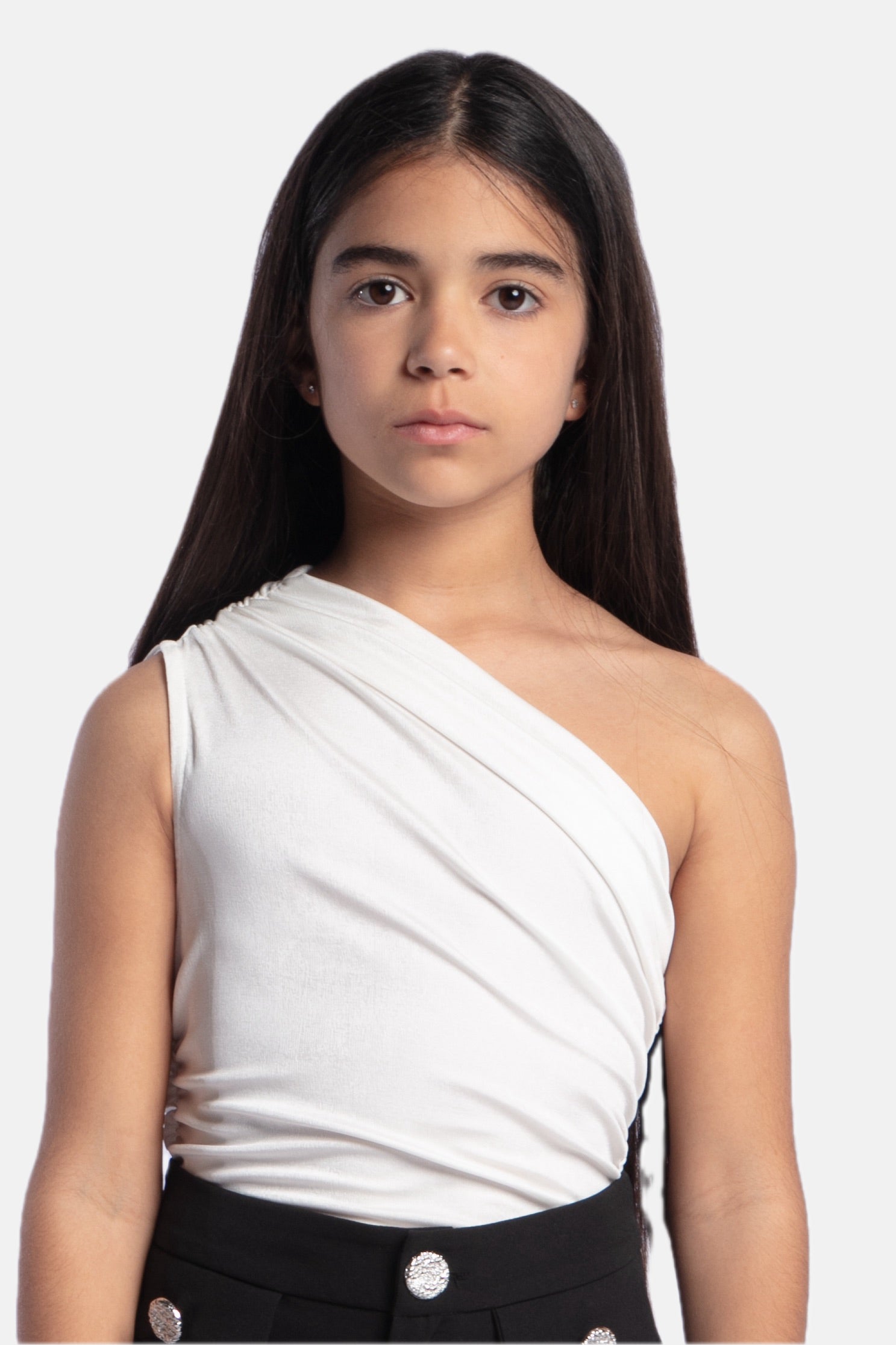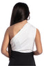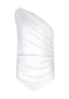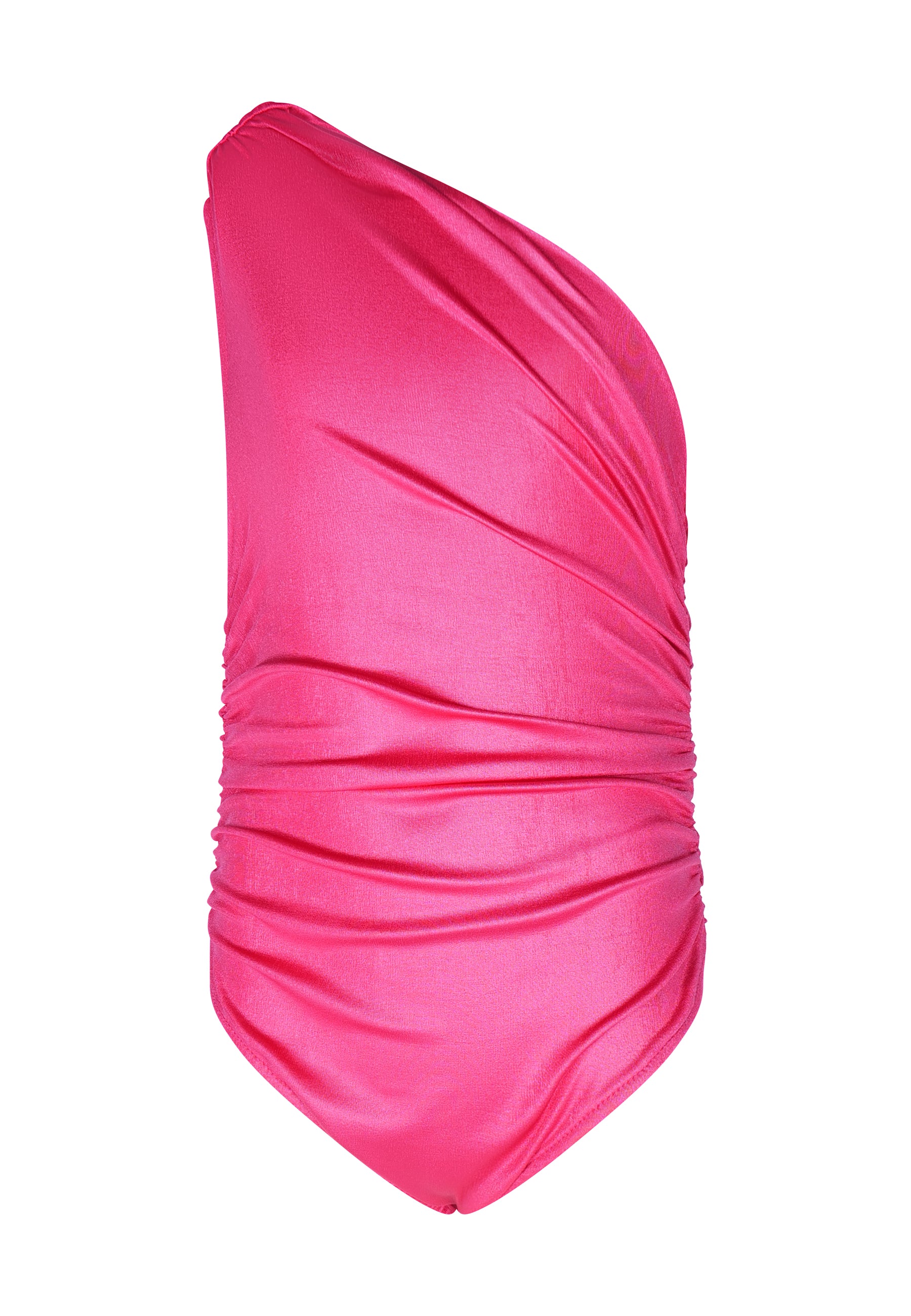 Asymmetrical draped bodysuit. One-shoulder bodysuit with ruching. Closure at the bottom with automatic buttons.