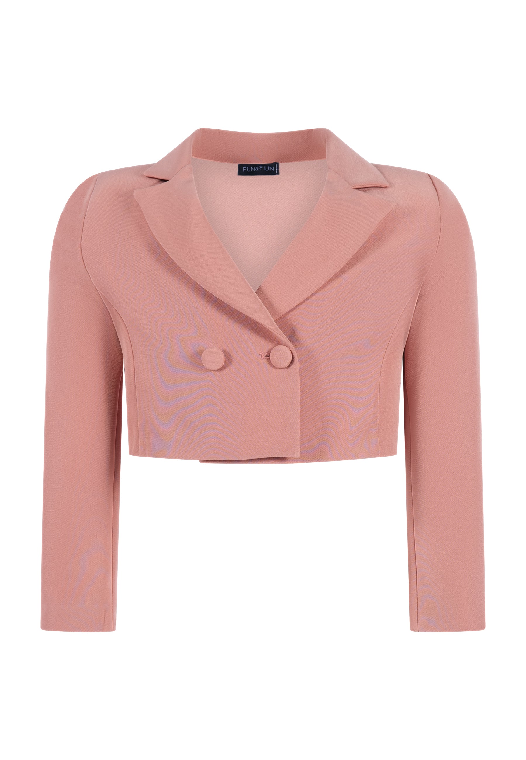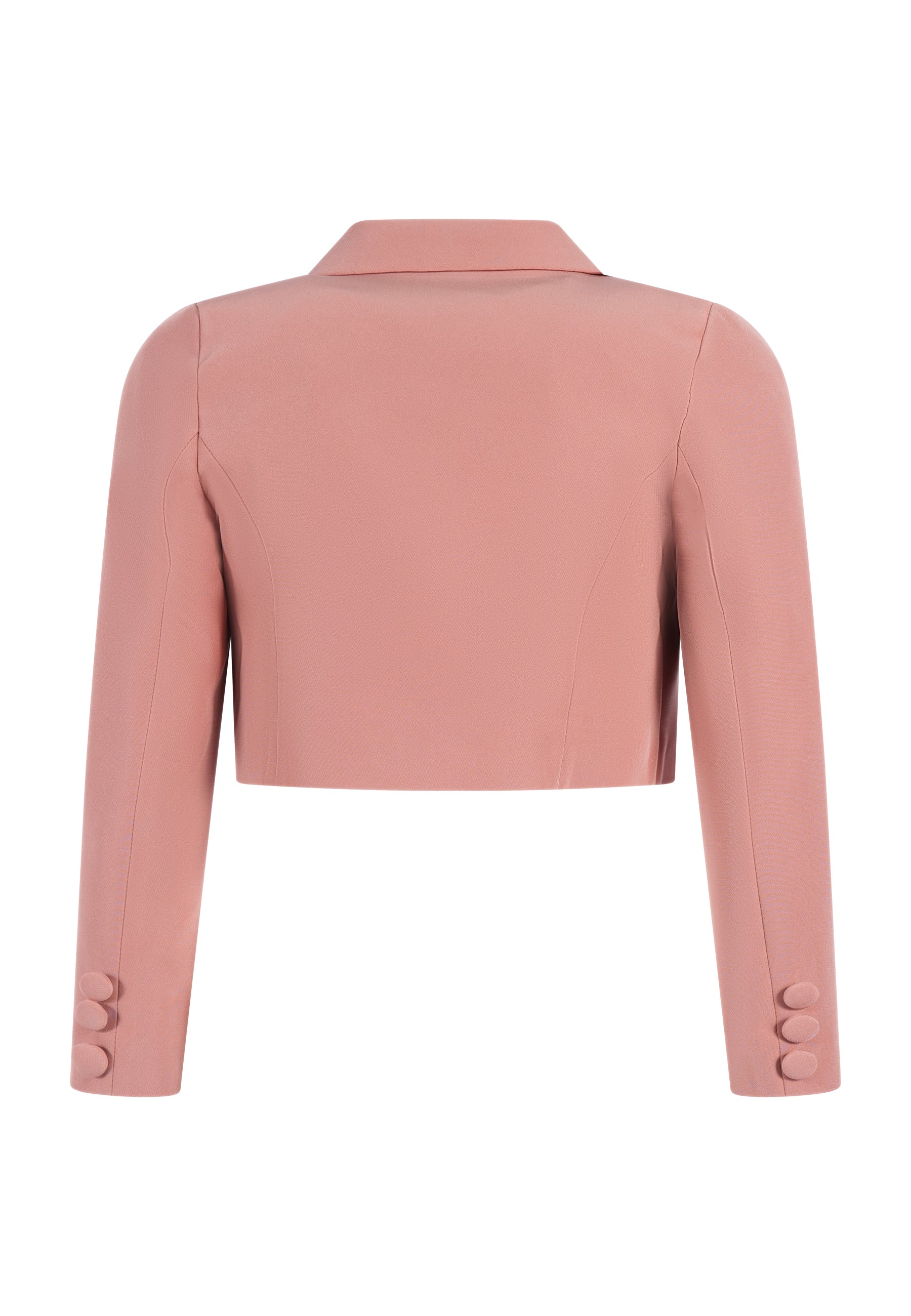SHORT MODEL JACKET WITH LAPEL AND LONG SLEEVES. DOUBLE-BREASTED CLOSURE WITH MATCHING FABRIC COVERED BUTTONS. SLEEVE BOTTOM ON THE BACK WITH BUTTONS COVERED IN MATCHING FABRIC.