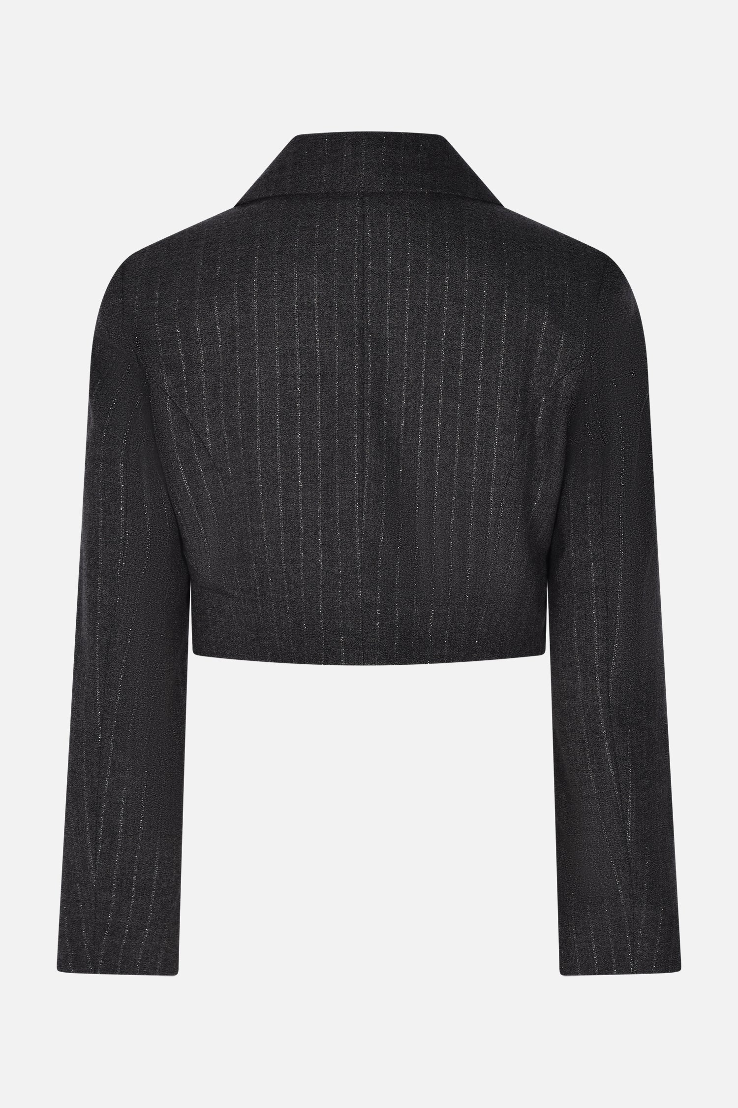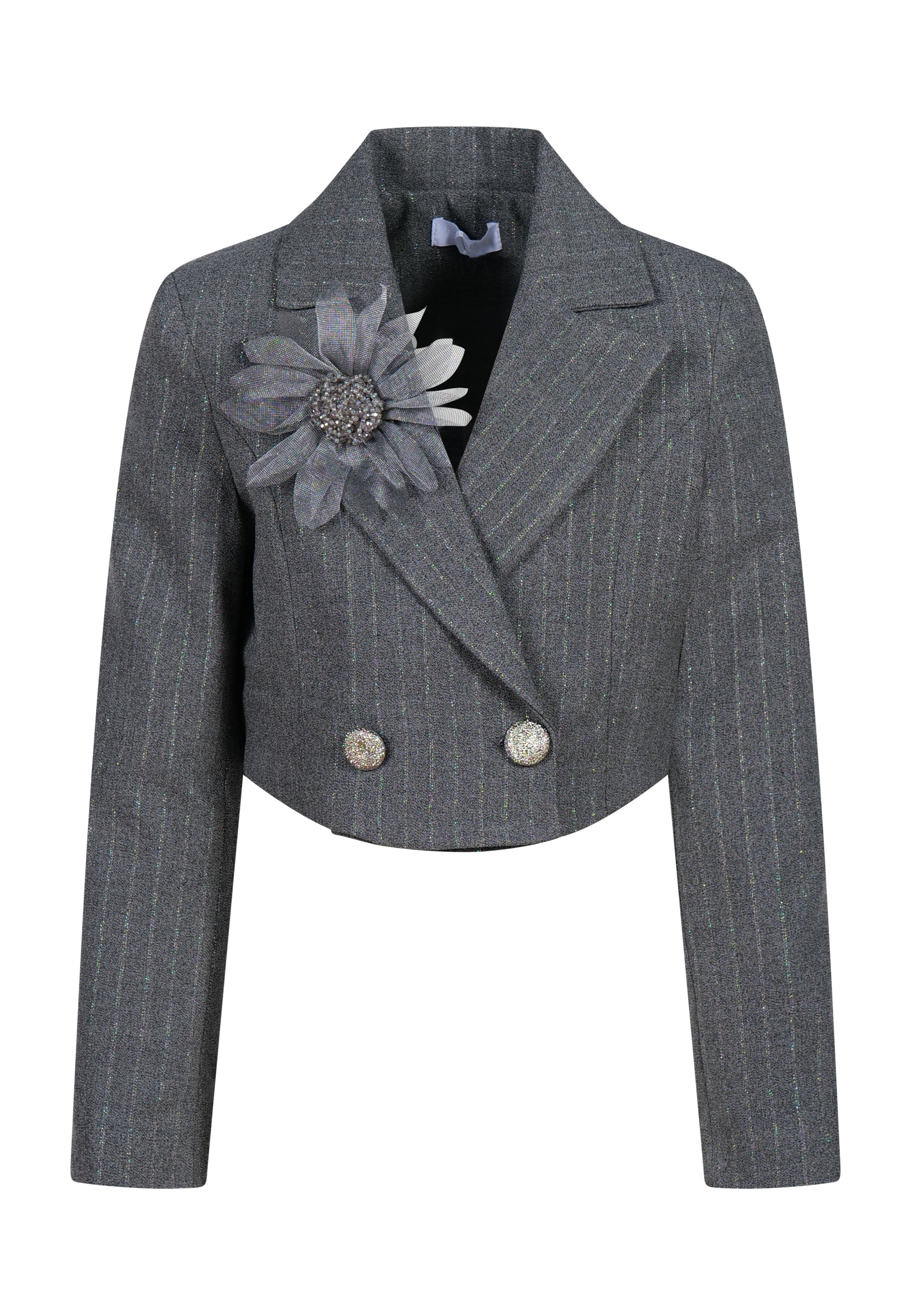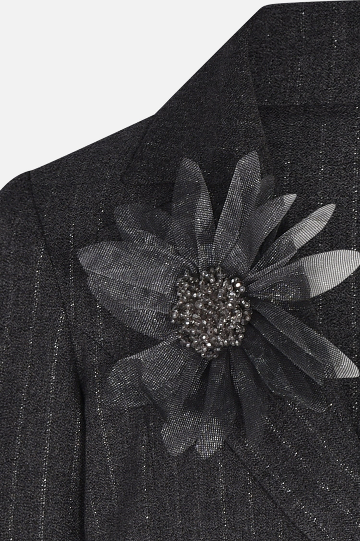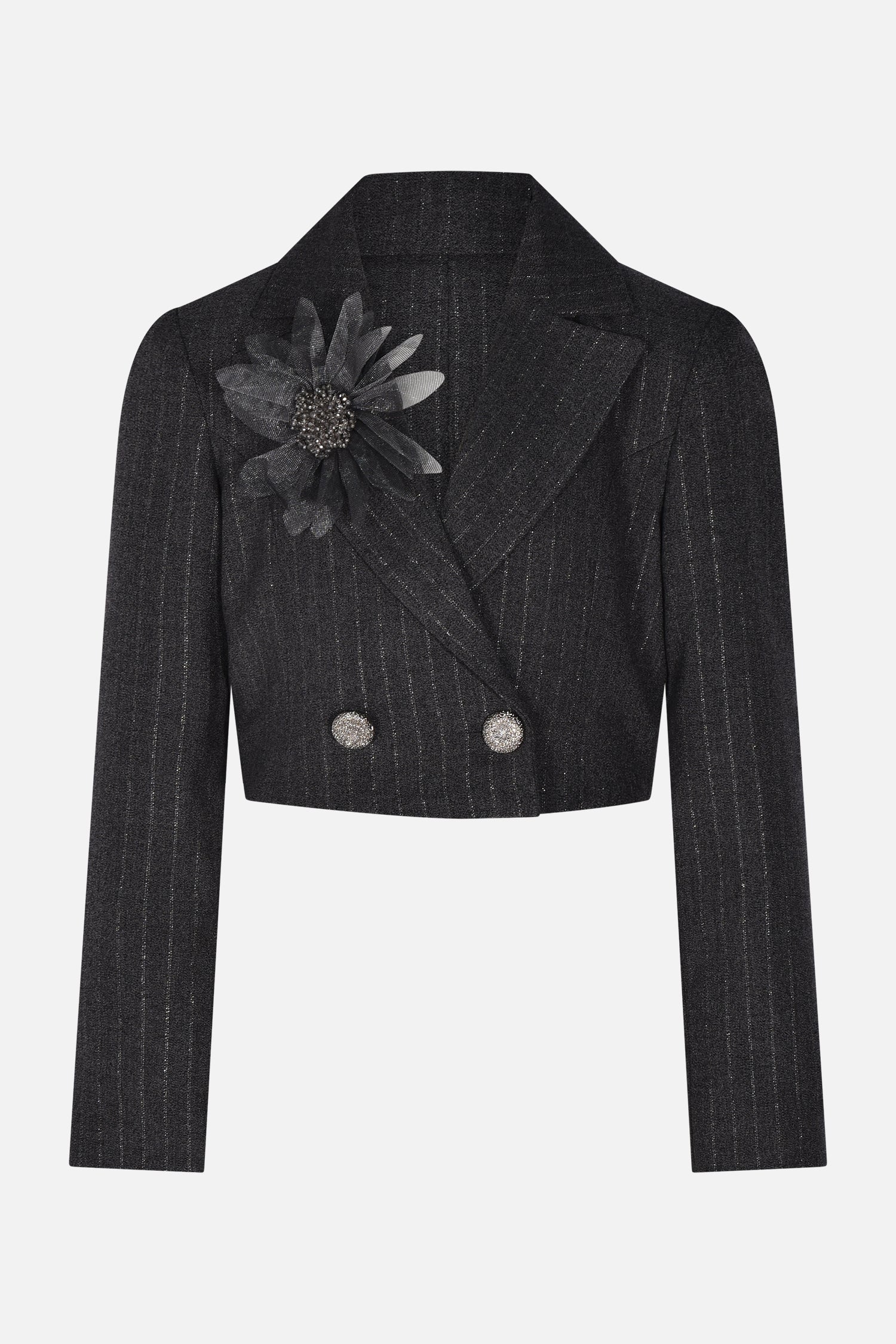 DOUBLE BREASTED CROPPED BLAZER WITH SILVER BUTTONS IN SILVER LUREX PINSTRIPE FABRIC, FLOWER BROOCH AS MATCHING ACCESSORY.