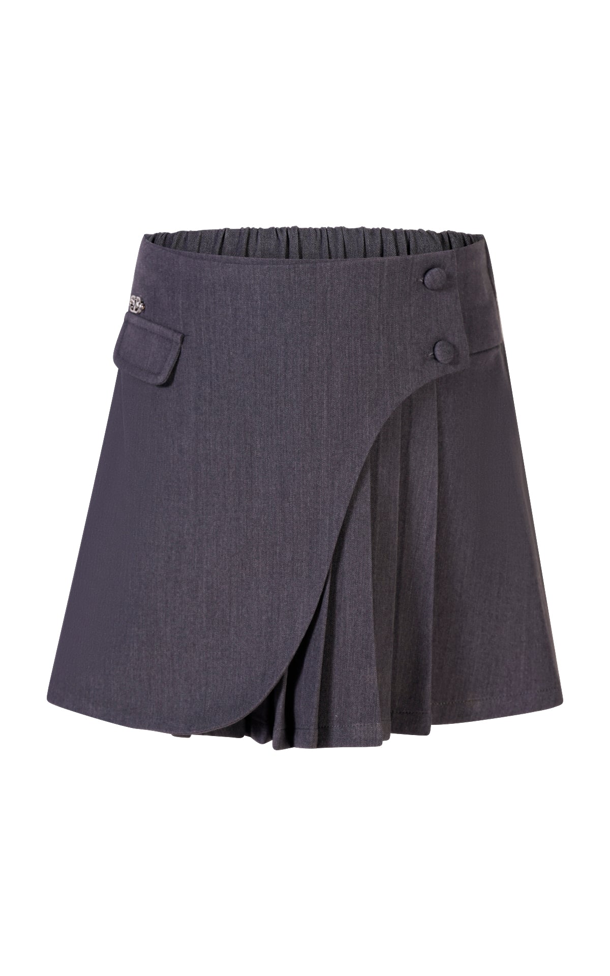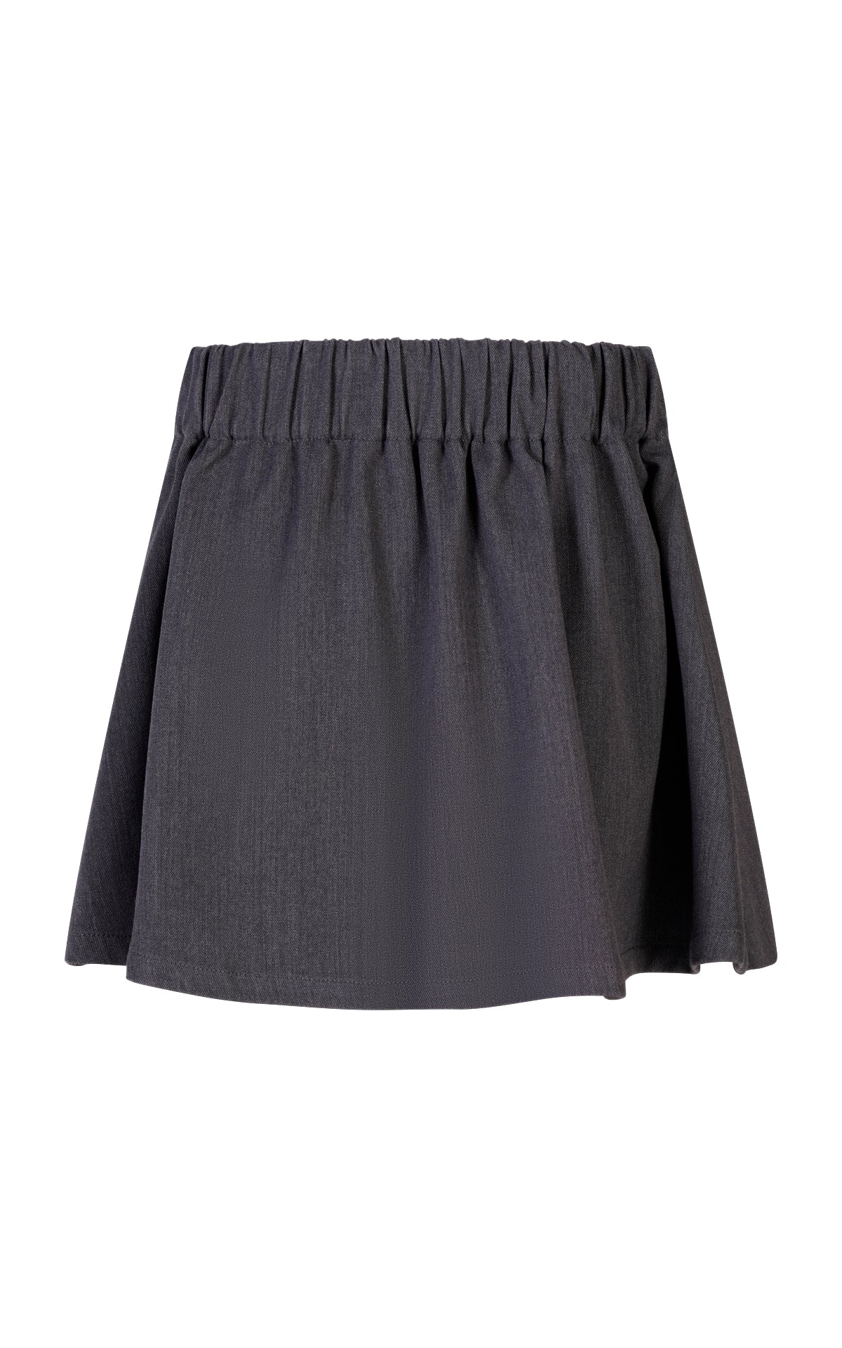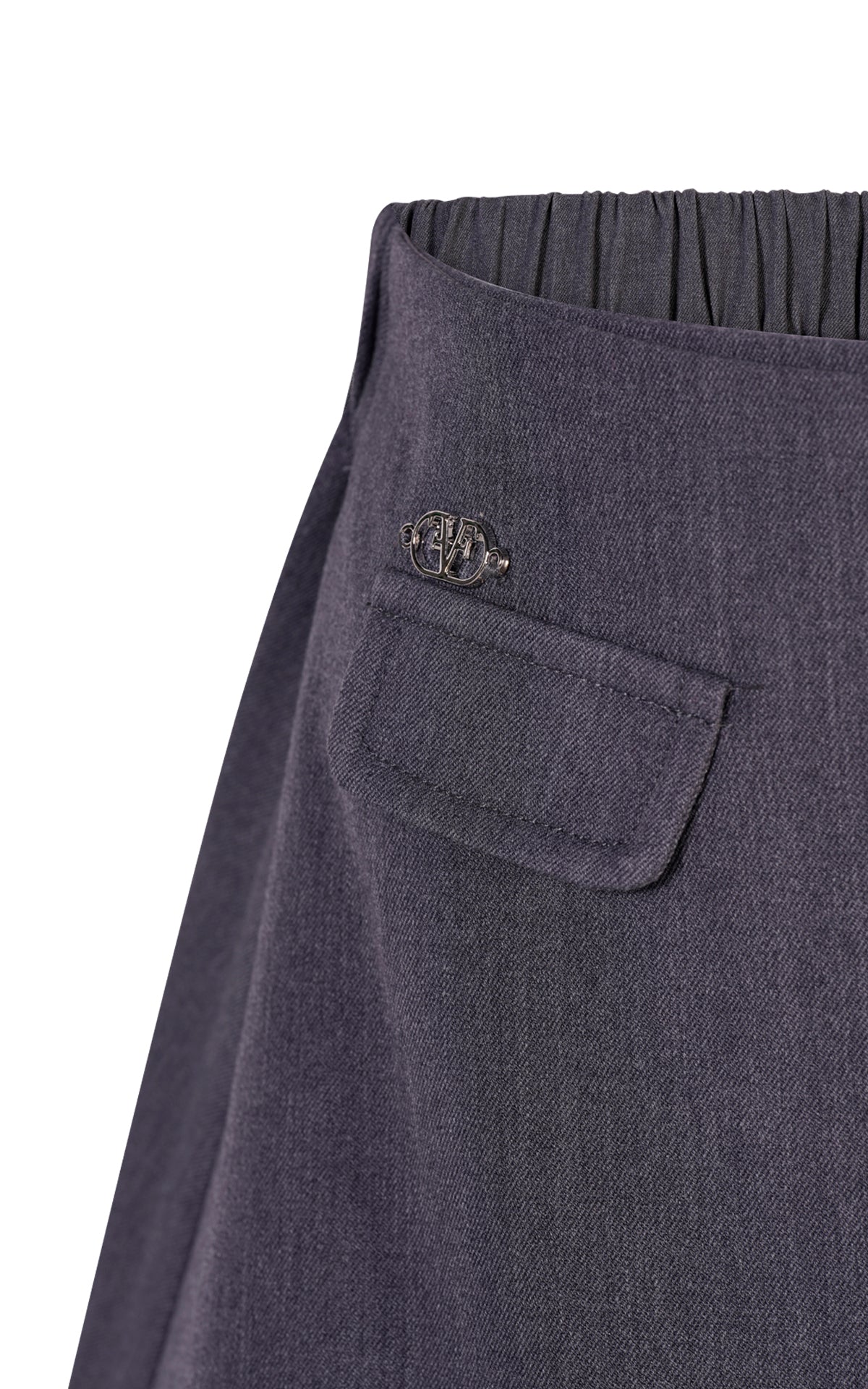 SKIRT IN WOOL-LOOK FABRIC. STRETCH BUSTIER WITH SHAPED BIB ON THE SIDE, MATCHING FABRIC BUTTONS. SIDE PLISSÉ EFFECT FOLDS DECORATIVE FLAP WITH LOGO PLATE ON THE SIDE.