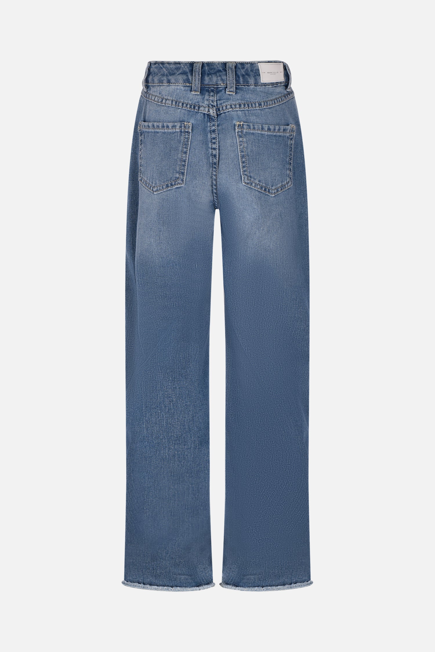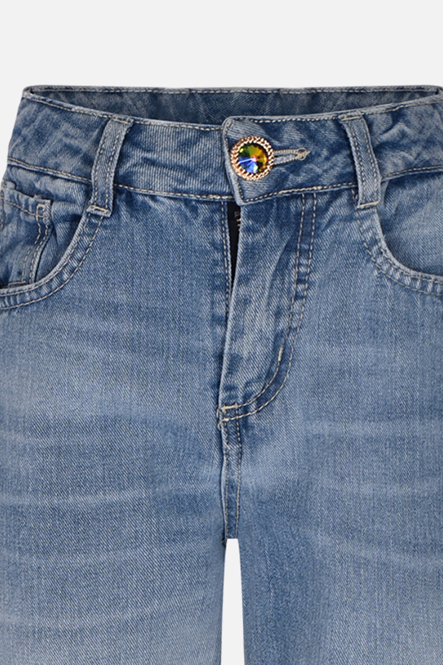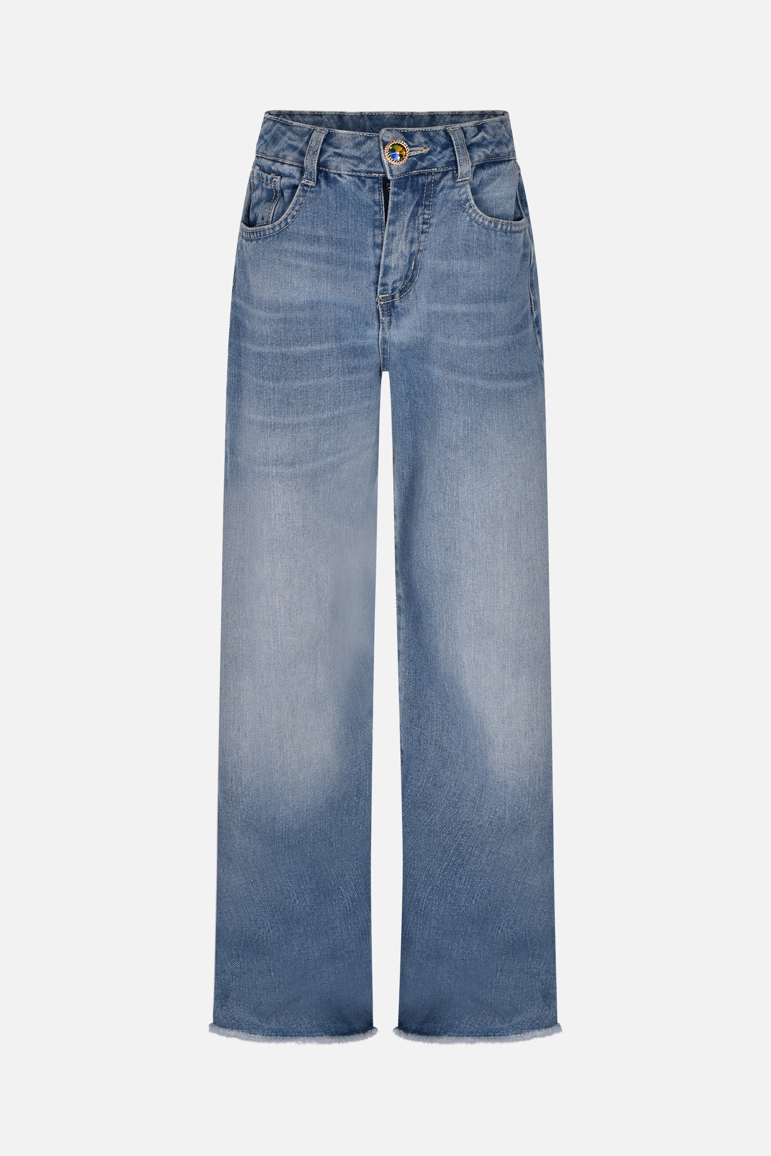 These wide-leg trousers with frayed hems are perfect for those seeking a mix of elegance and comfort. The boreal-effect jewel button and logo tab add a unique detail that elevates the look.