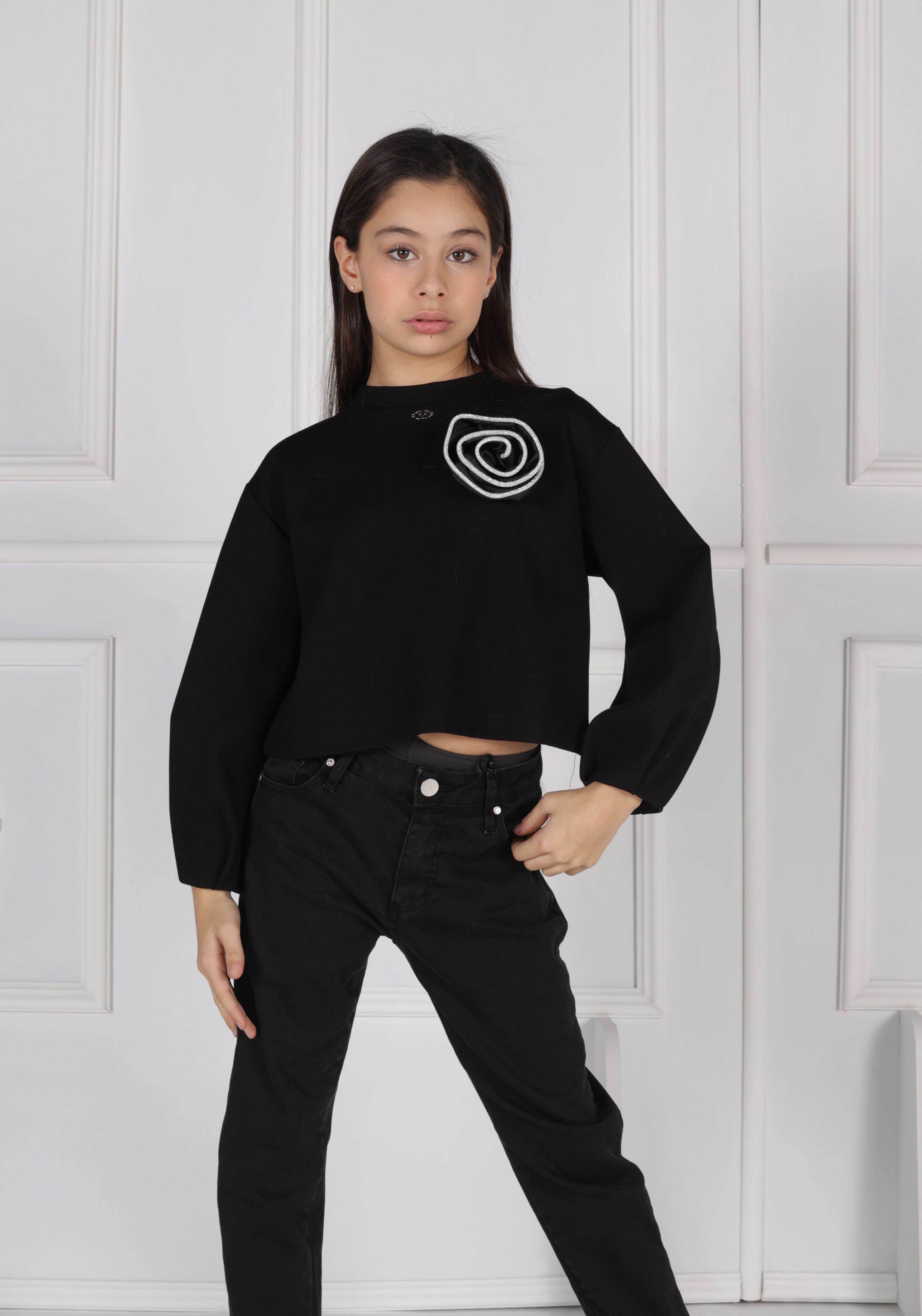 Elegant flower-shaped brooch crafted from taffeta fabric, embellished with a refined rhinestone trim detail that adds a touch of sparkle and class. Perfect for enhancing any outfit with a sophisticated accessory.
