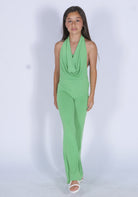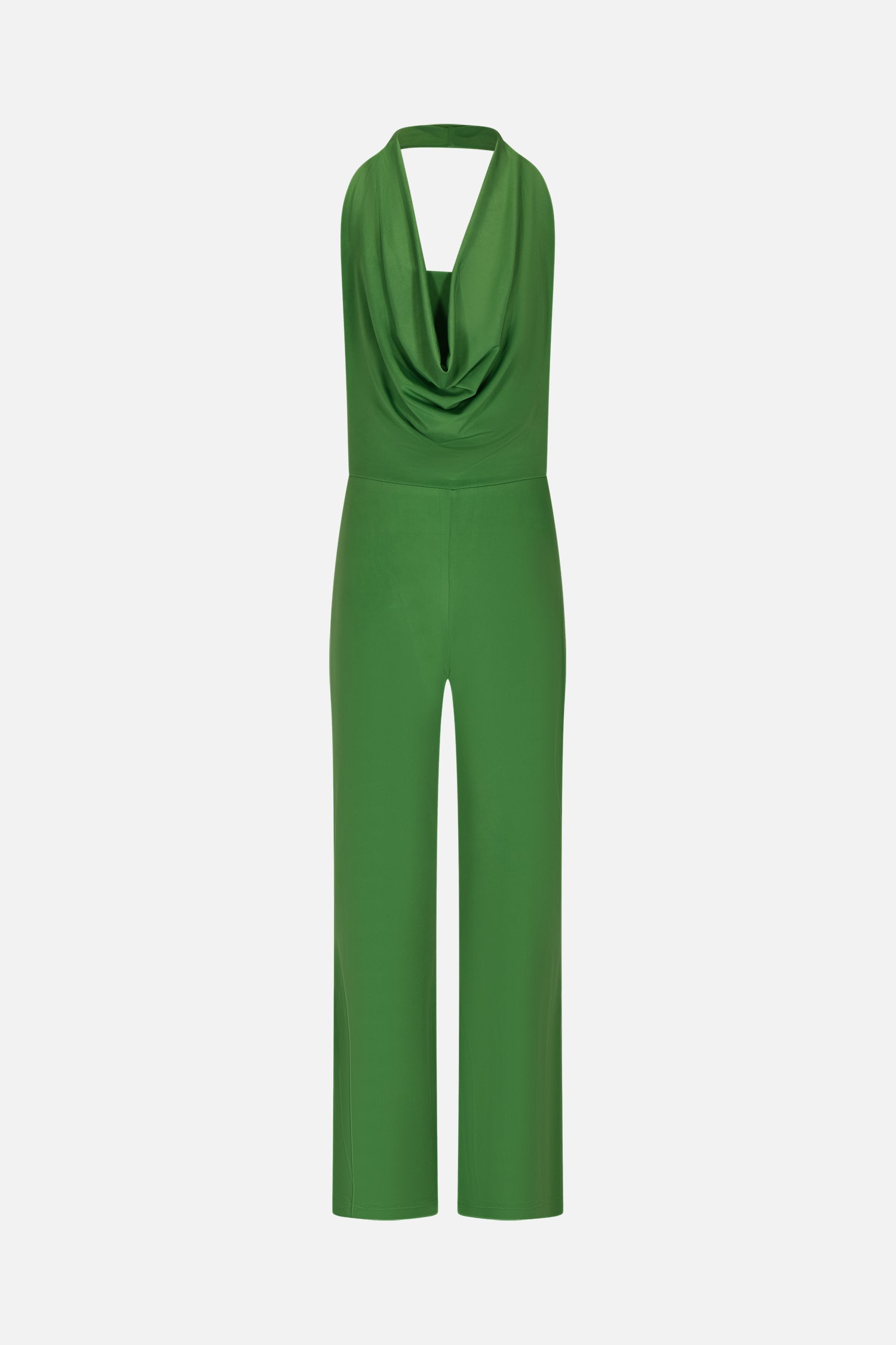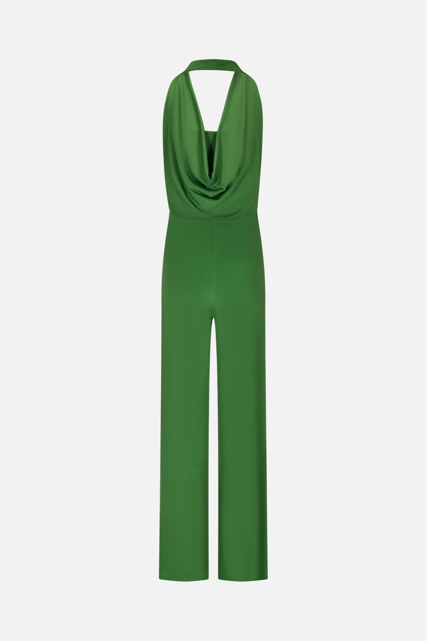 Elegant and versatile jumpsuit made of stretch fabric, with a halter neckline that highlights the shoulders and a refined soft neckline on the front. The bottom of the trousers is bell-shaped, giving a touch of glamour to the garment. The open back adds a sensual and modern detail, perfect for special occasions or chic evenings.