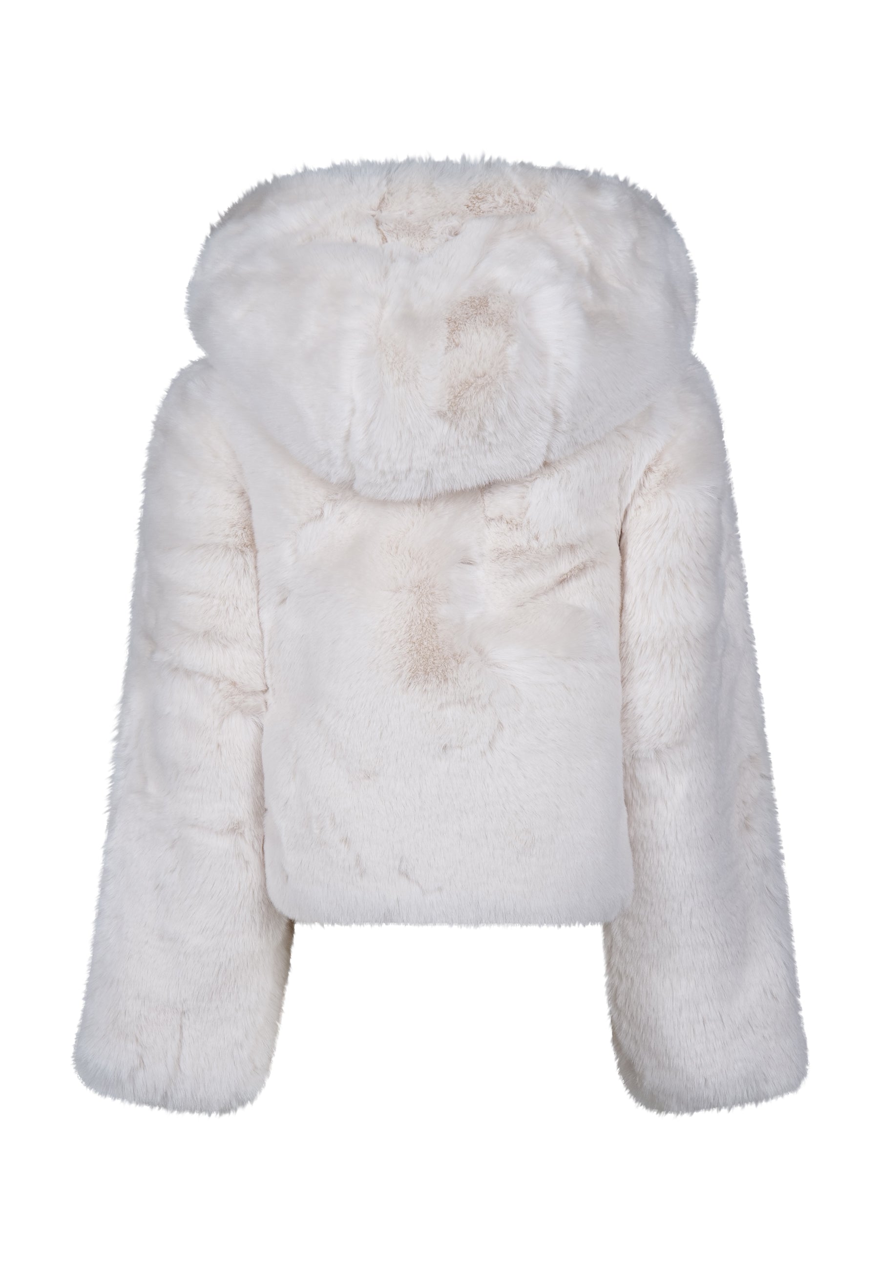 Chaqueta con capucha de pelo sintético y manga larga. Cierre frontal con cremallera.