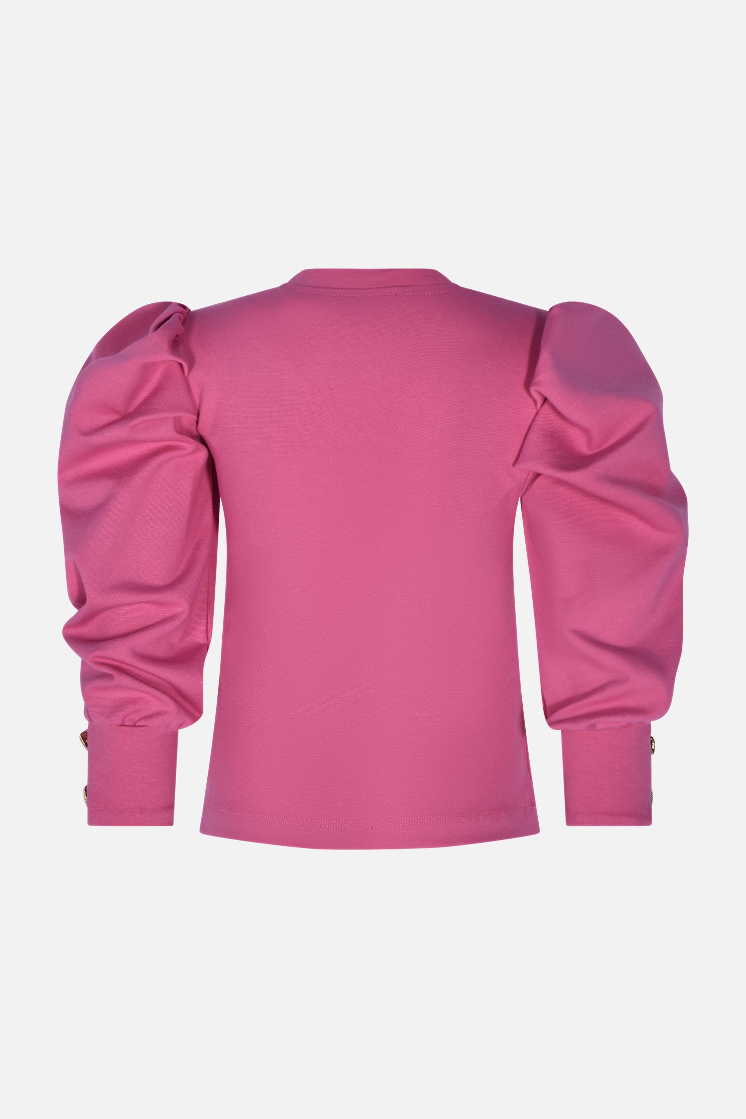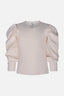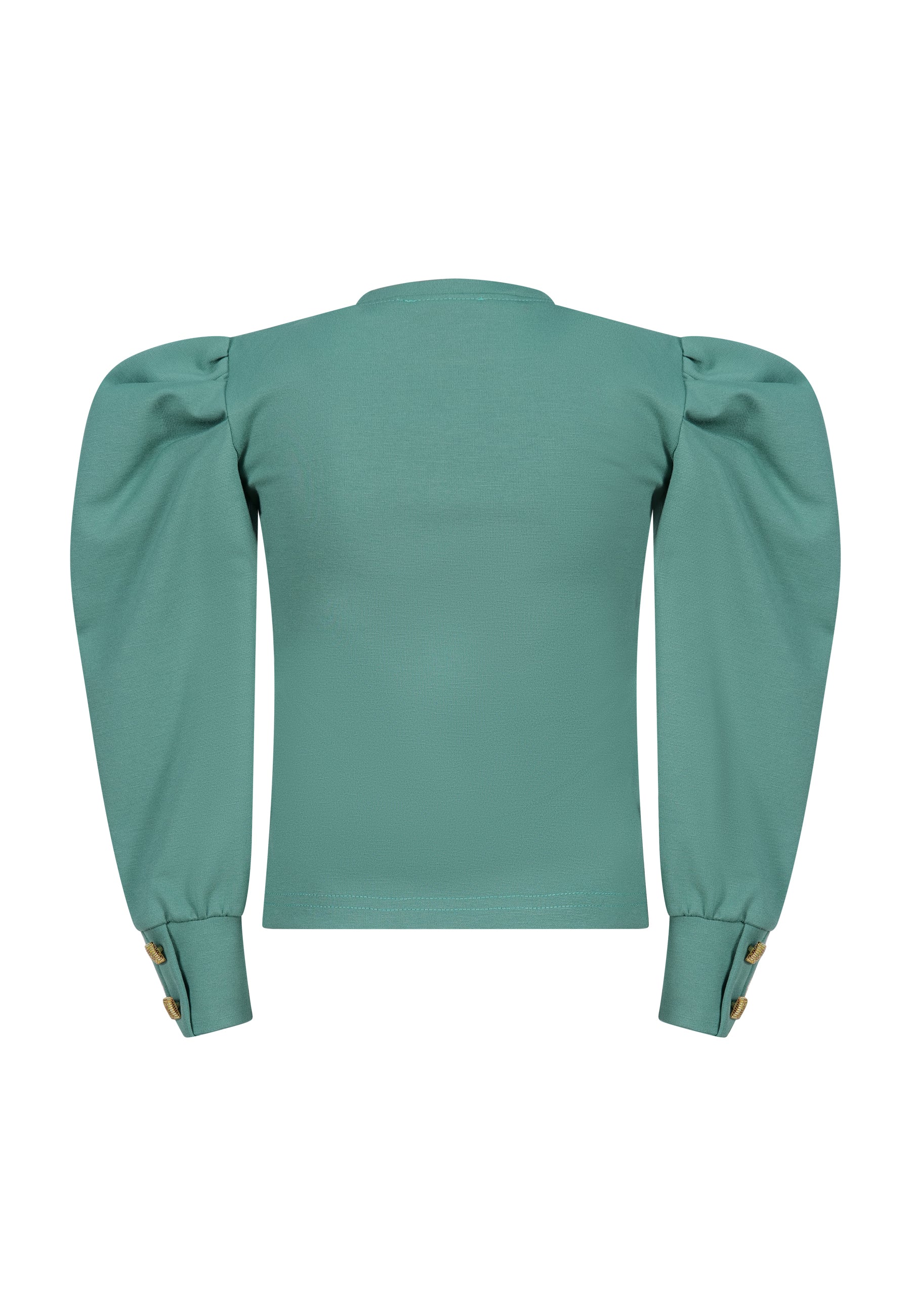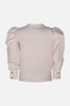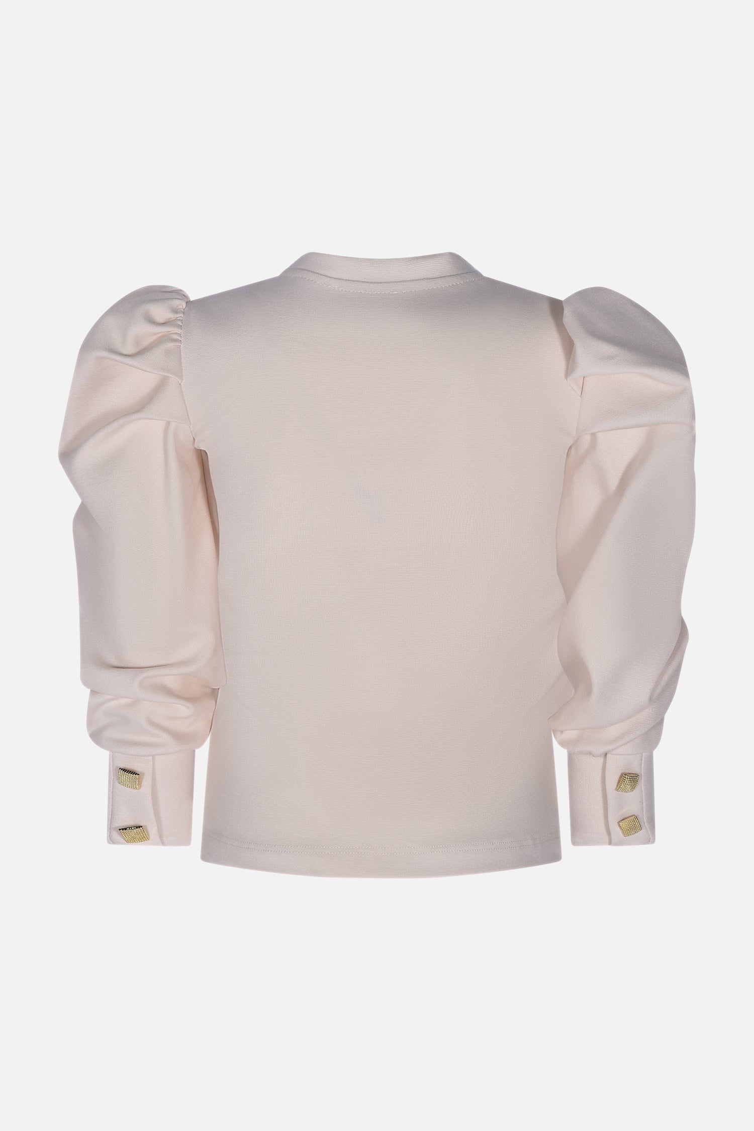 SUÉTER DE CUELLO REDONDO EN TEJIDO PUNTO MILANO, MANGA LARGA CON VOLANTES EN LOS HOMBROS, PUÑETA ALTA CON BOTONES DECORATIVOS CUADRADOS DORADOS