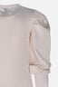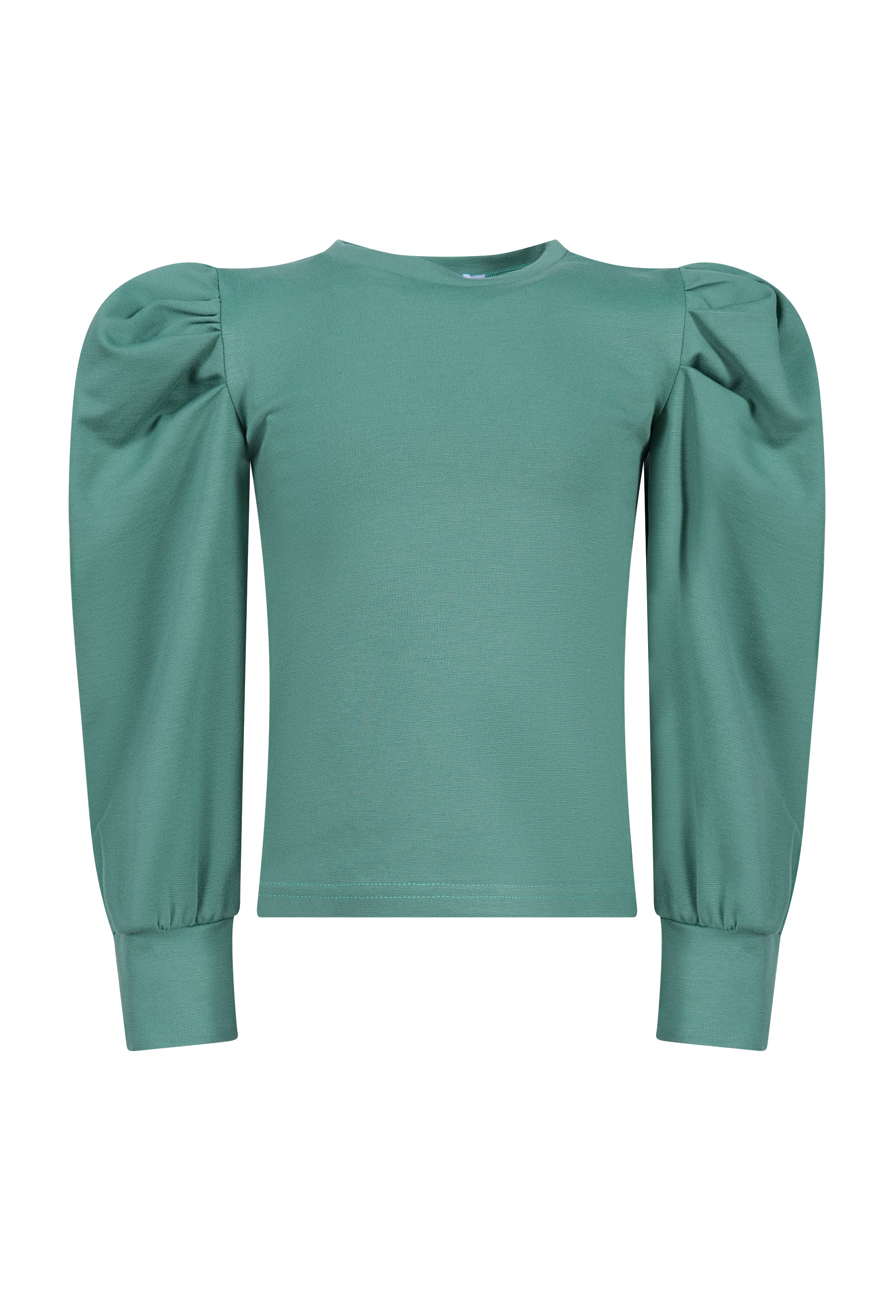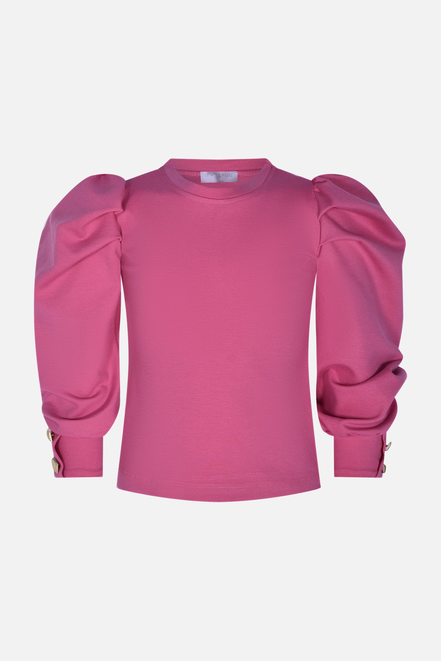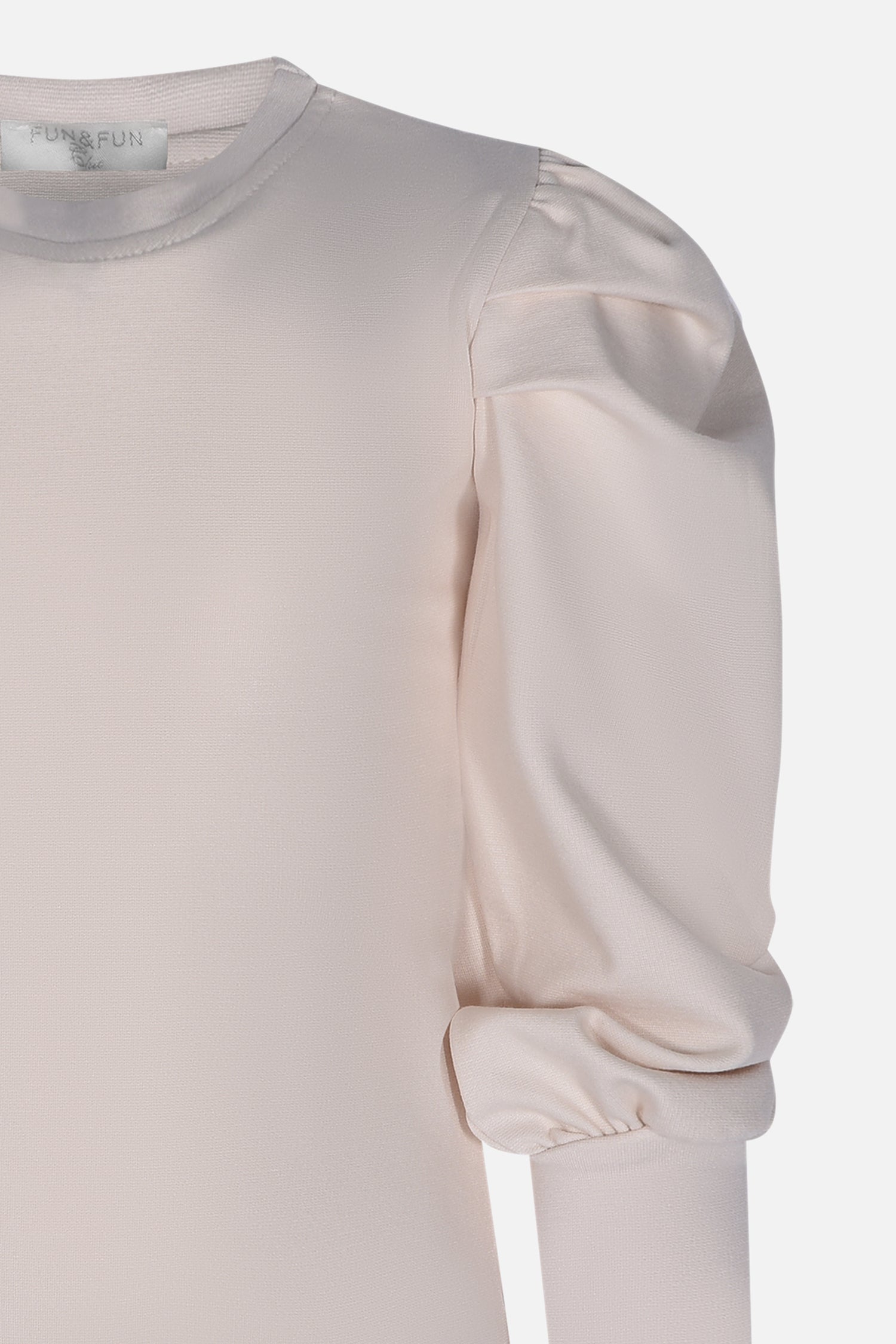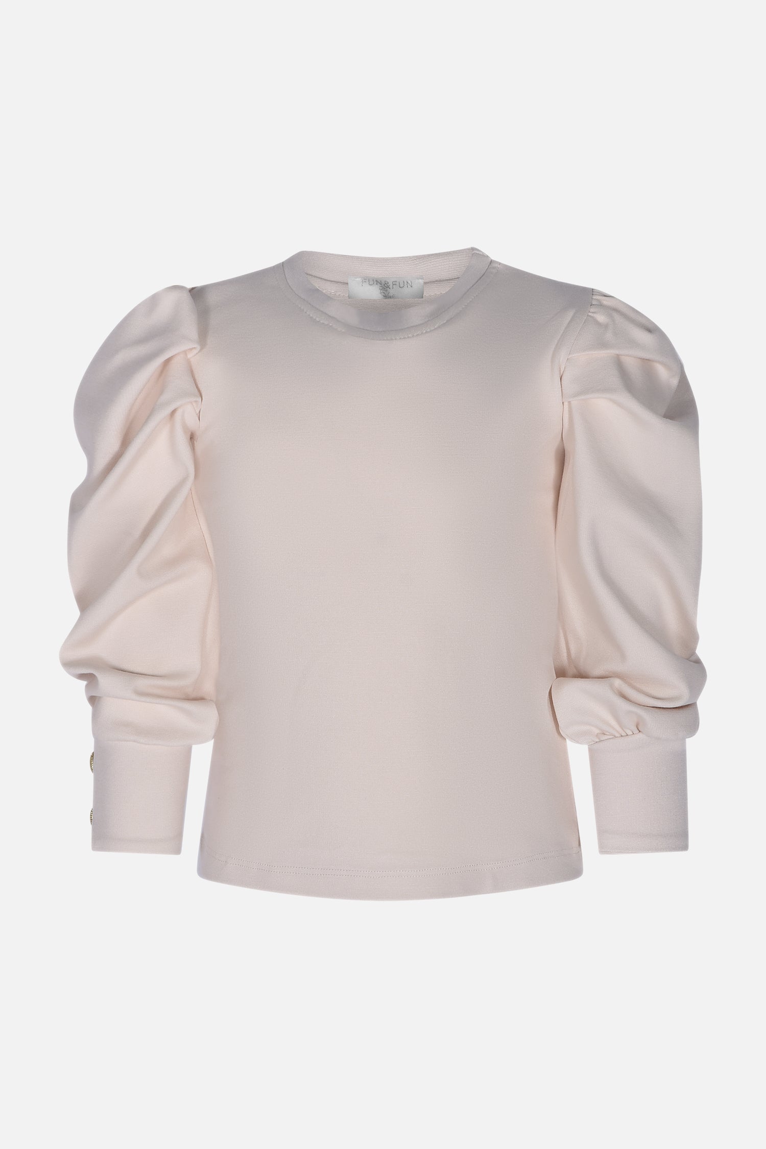 SUÉTER DE CUELLO REDONDO EN TEJIDO PUNTO MILANO, MANGA LARGA CON VOLANTES EN LOS HOMBROS, PUÑETA ALTA CON BOTONES DECORATIVOS CUADRADOS DORADOS
