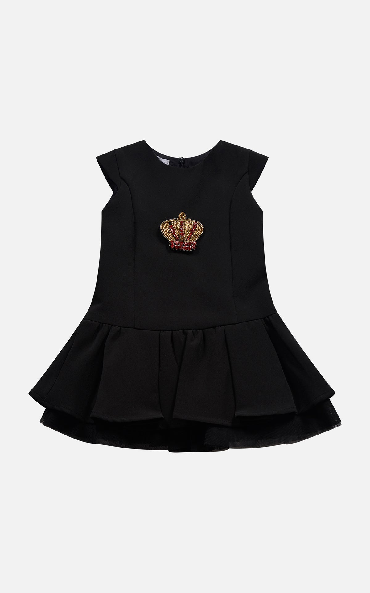 ABITINO ADERENTE IN TESSUTO TECNICO CON BALZA AL FONDO SVASATO + TULLE MORBIDO SOTTO E PATCH CORONA FRONTALE