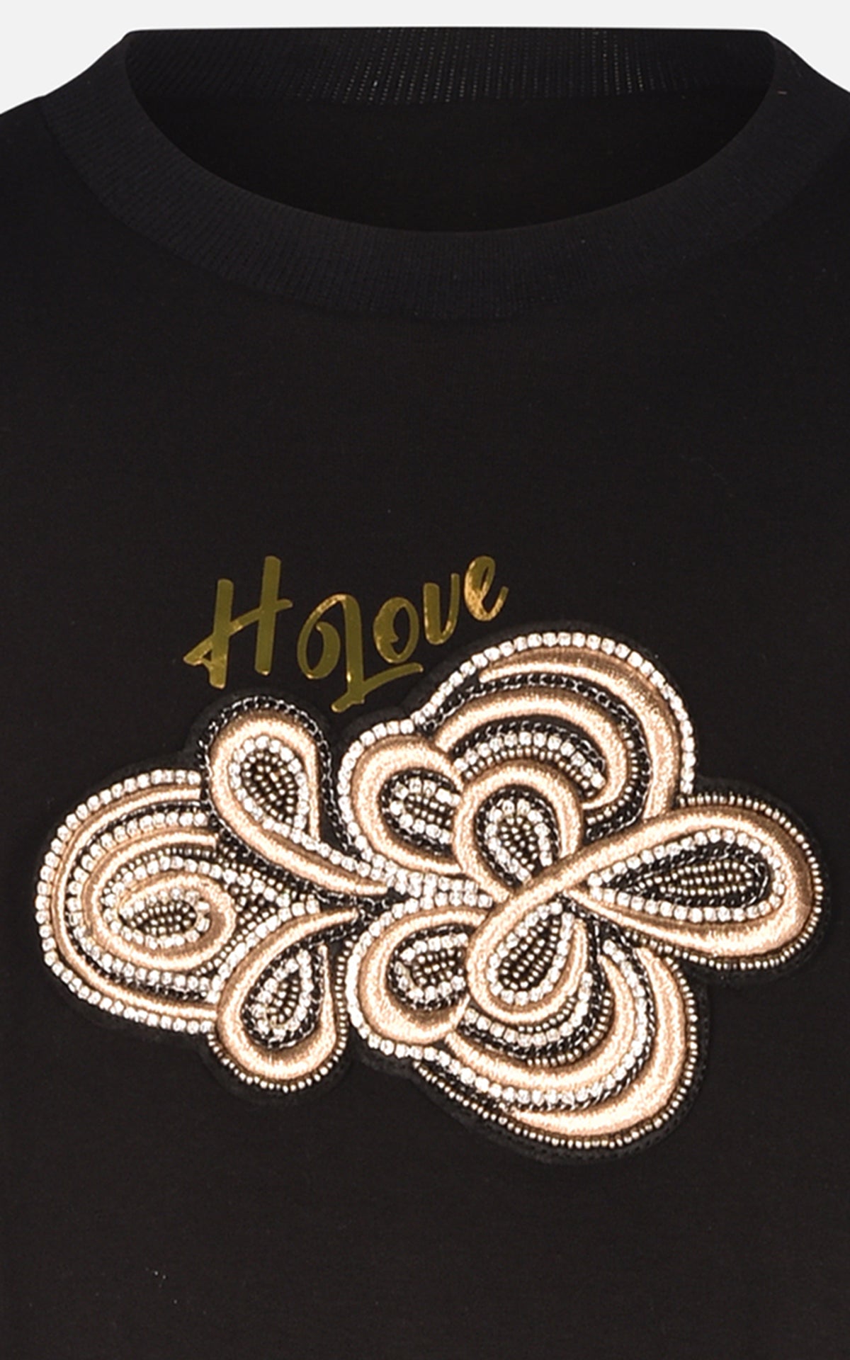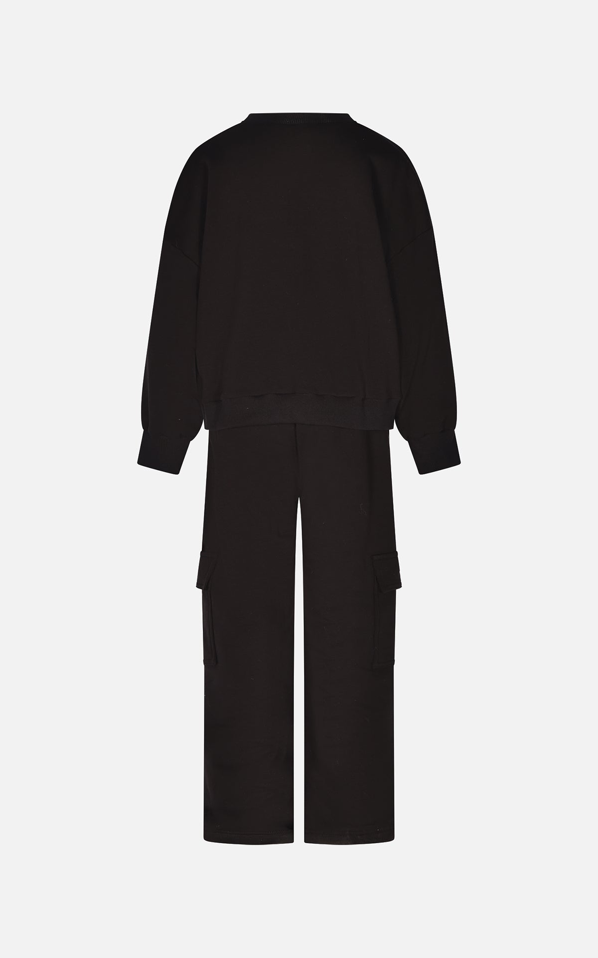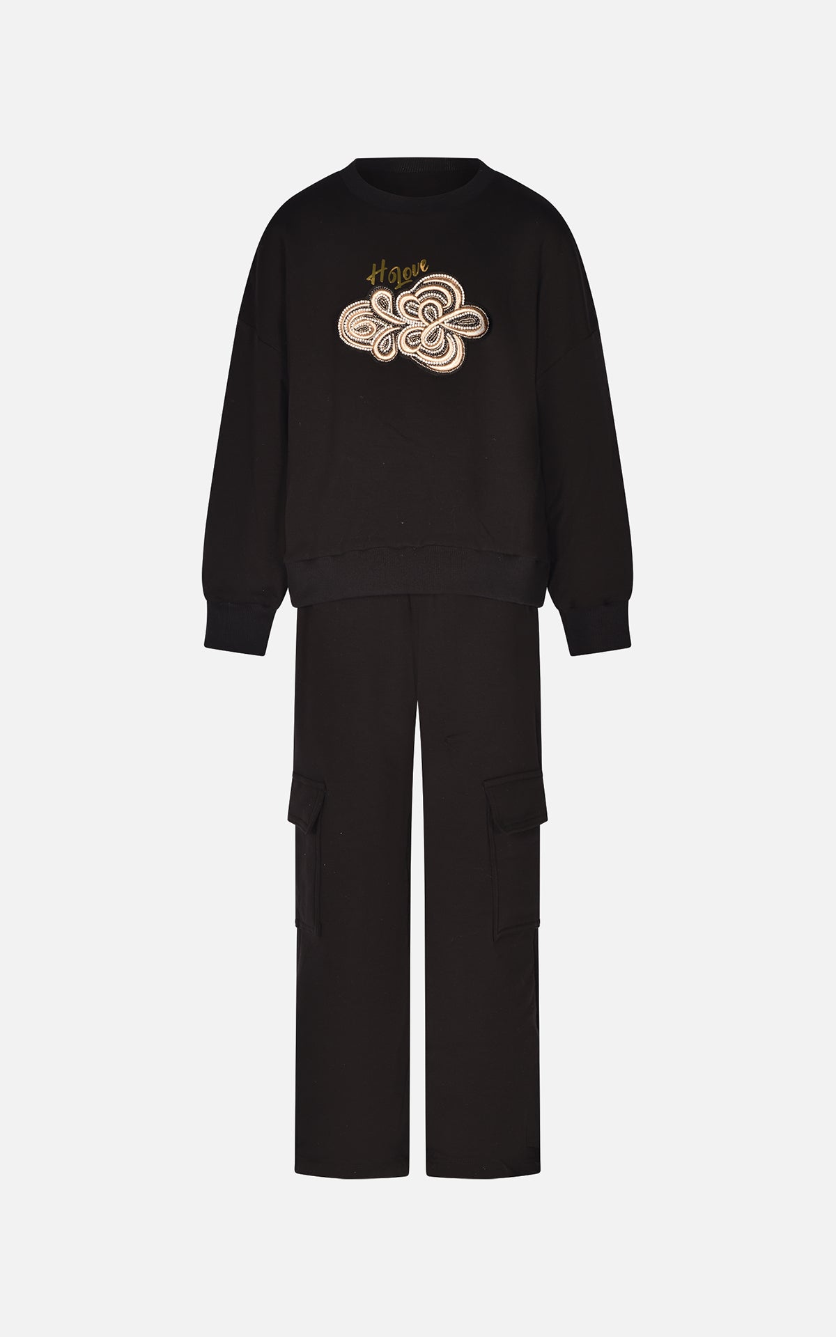 SET TUTA IN FELPA COTONE MODELLO FELPA OVER CON APPLICAZIONE PATCH GOLD CUCITA SUL DAVANTI + PANTALONI GAMBA AMPIA E TASCONI LATERALI