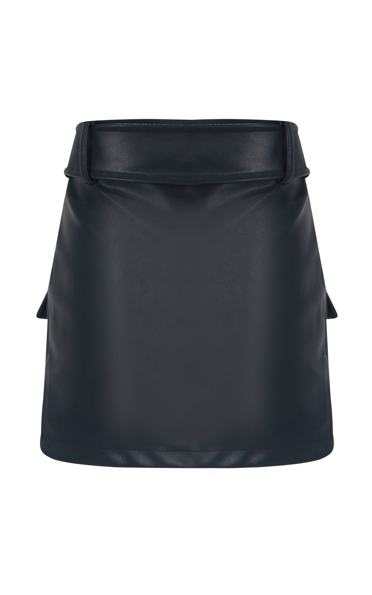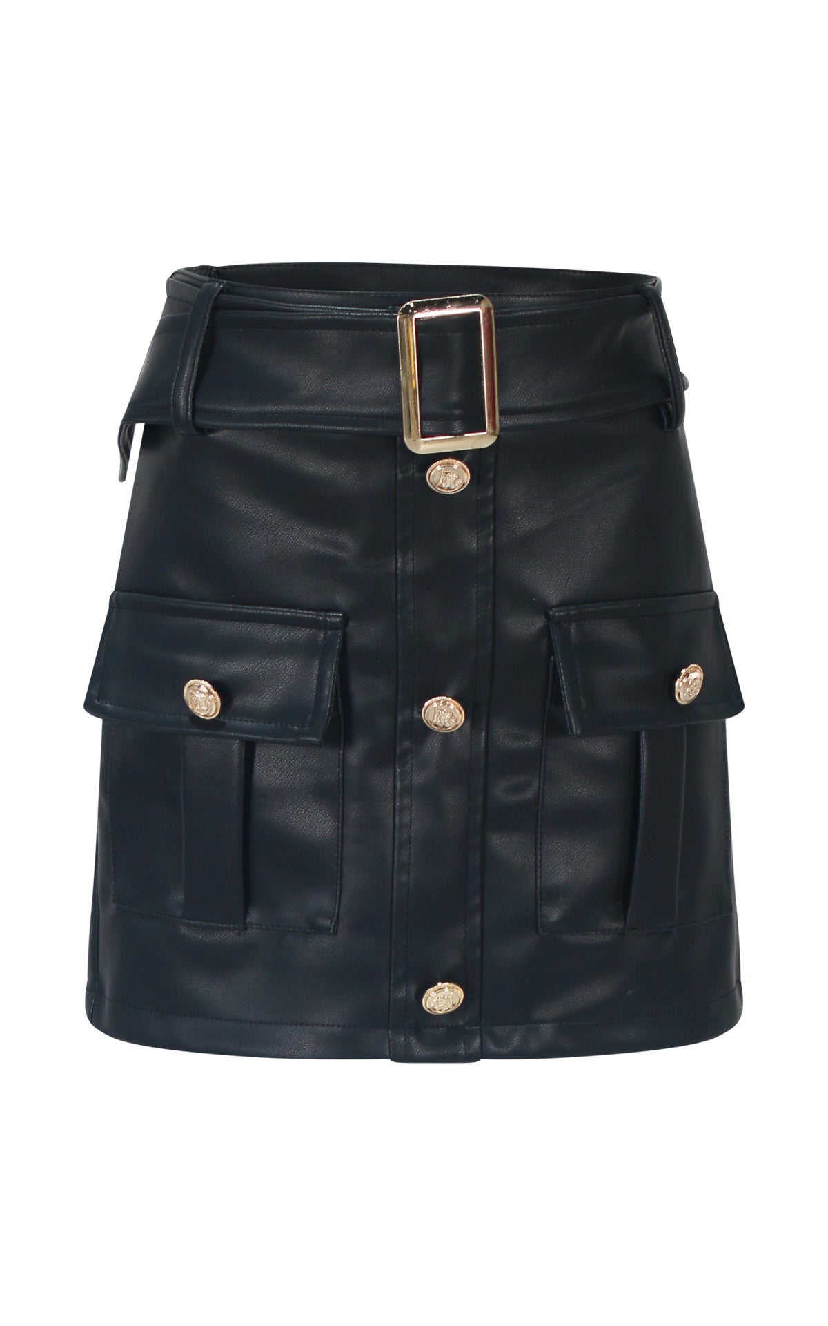 GONNA MINI IN ECOPELLE E CINTURA IN TESSUTO ABBINATO CON FIBBIA RETTANGOLARE GOLD E BOTTONI NAPOLEONICI GOLD DECORATIVI AL CENTRO DAVANTI