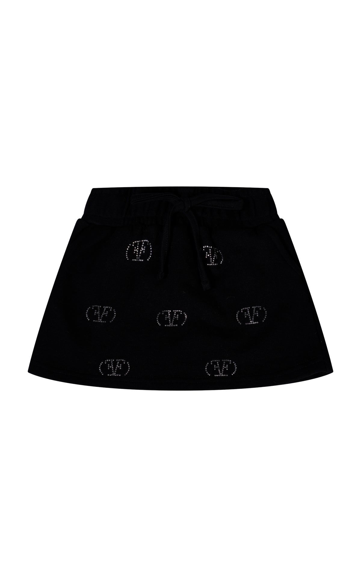 GONNA IN FELPA CON APPLICAZIONI STRASS LOGO FRONTALI . TASCHE AI LATI FUNZIONALI . BUSTINO ELASTICIZZATO CON CON LACCETTO PER FIOCCHETTO DECORATIVO.