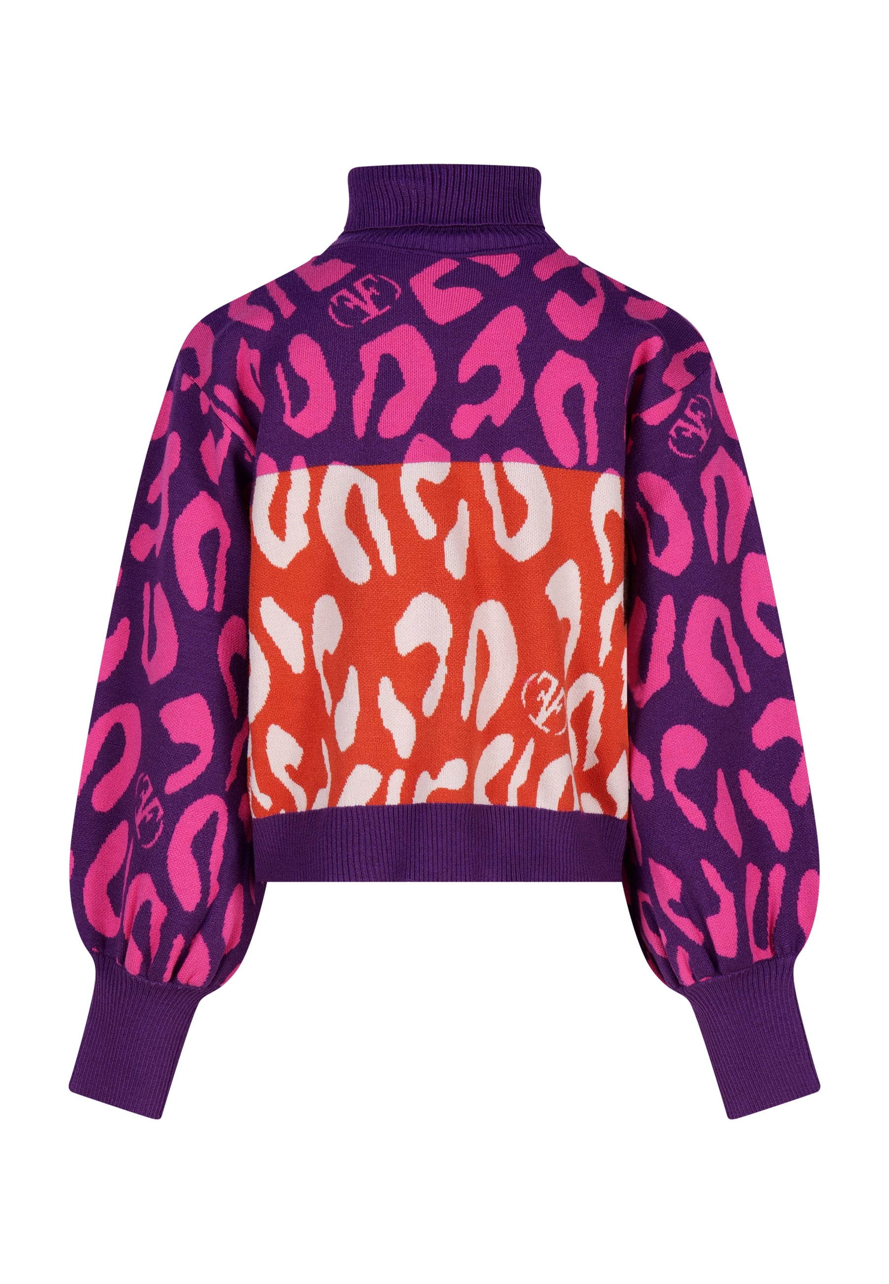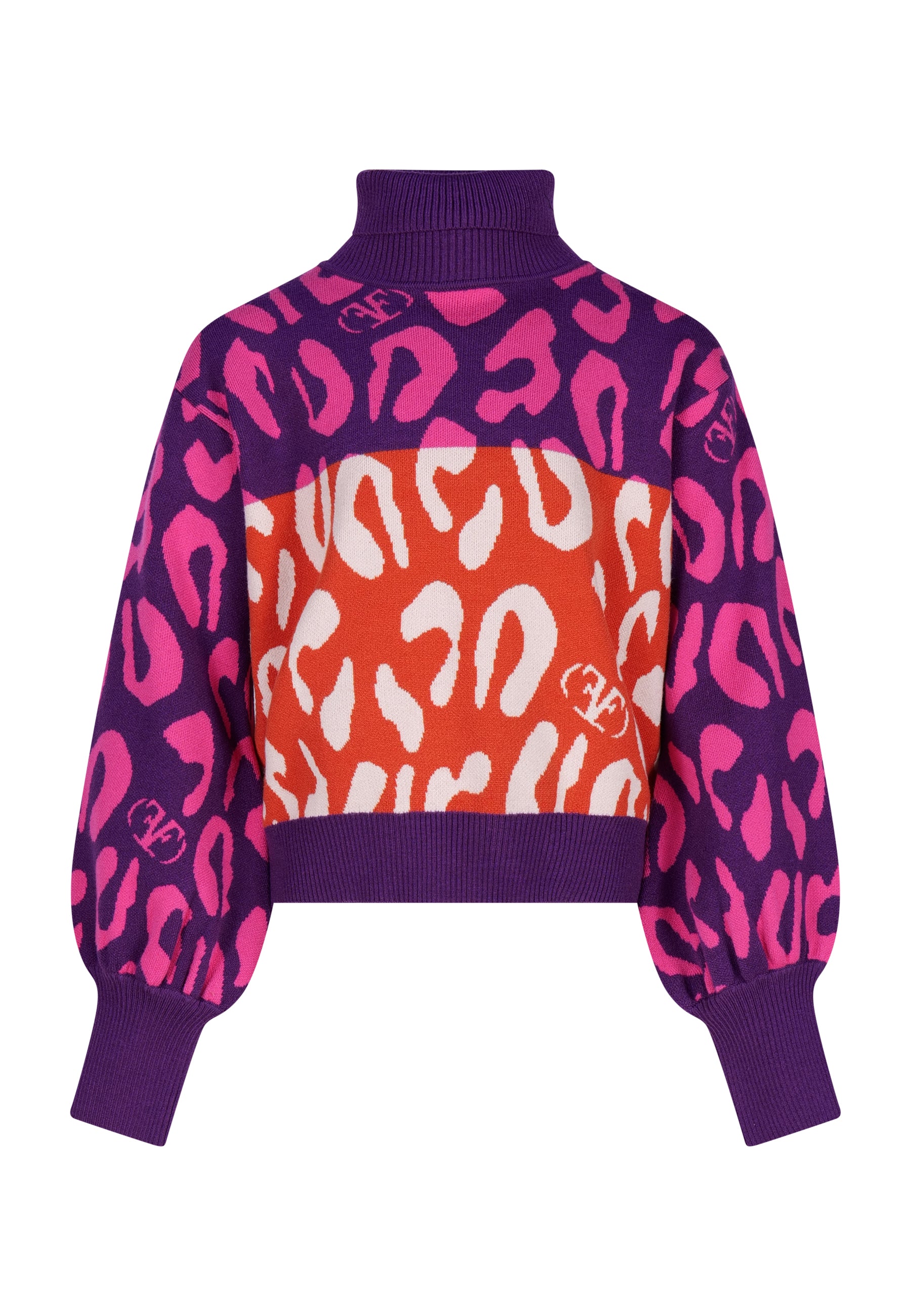 Pullover in maglia con lavorazione jacquard Collo alto e maniche lunghe con leggero sbuffo al fondo . Finiture a costa.