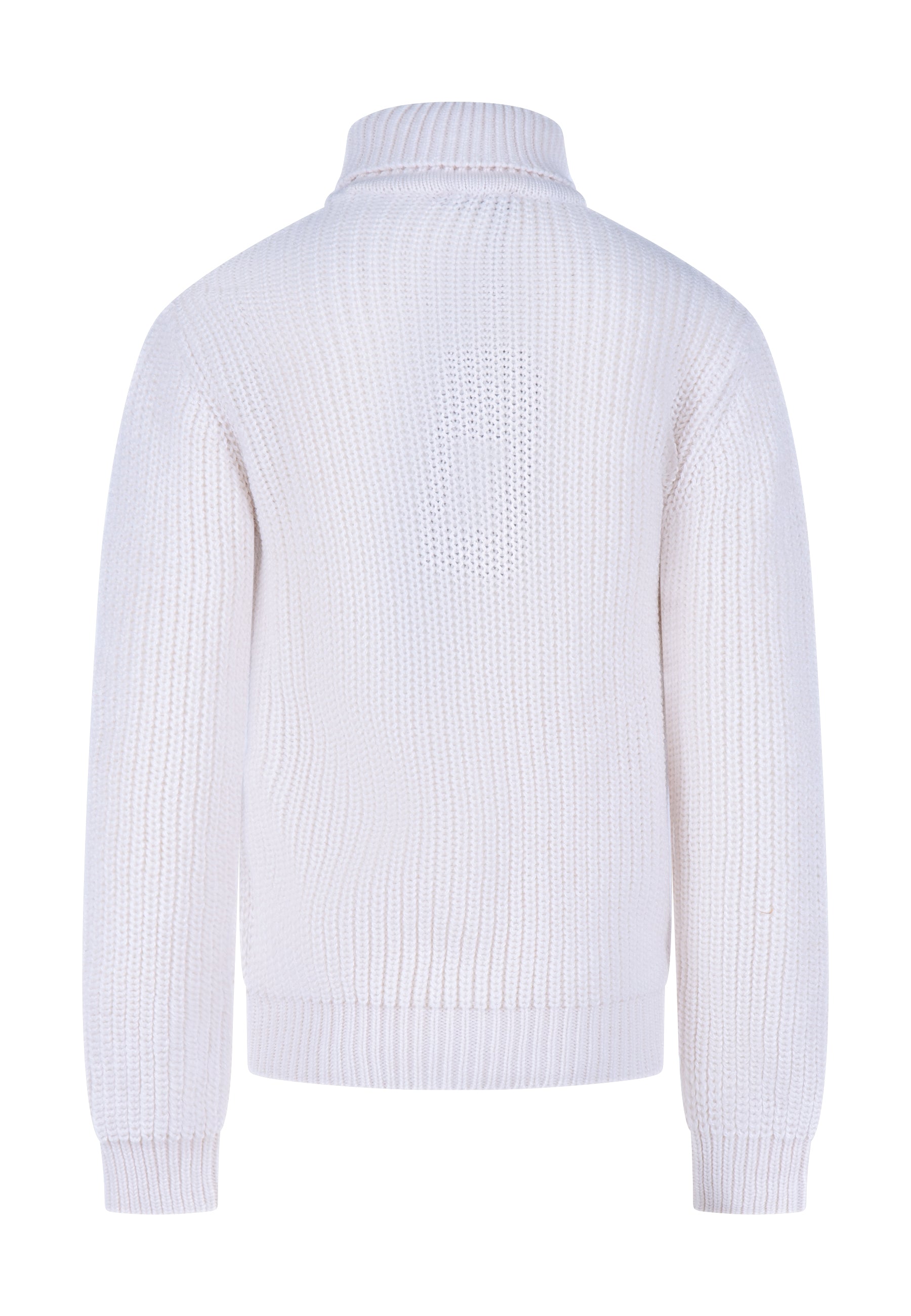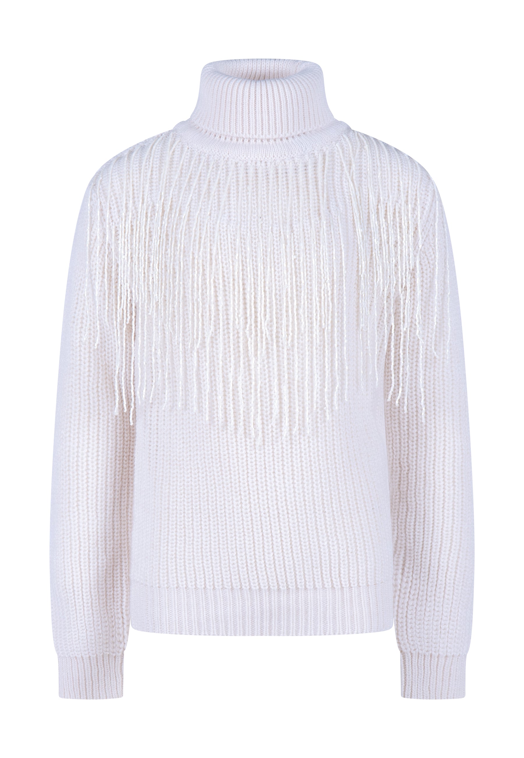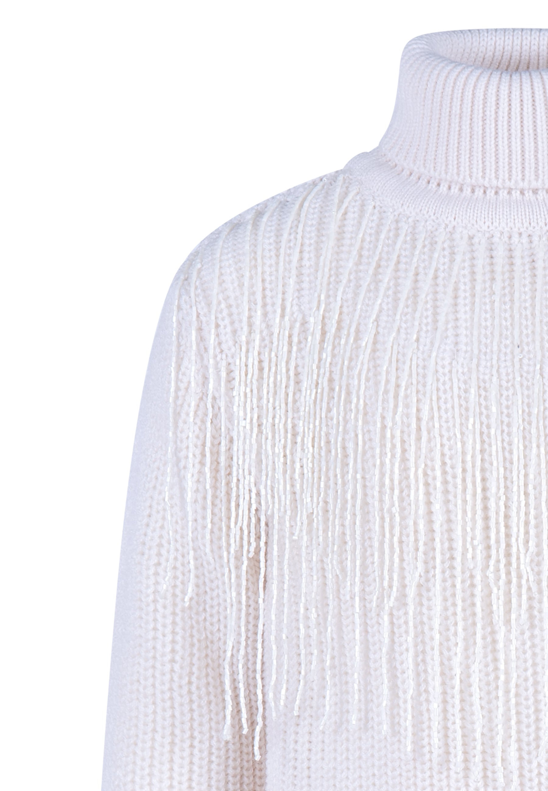 PULLOVER IN LANA SMACCHINATA COLLO ALTO, APPLICAZIONE DI MICRO FRANGE CON CANOTTIGLIE IN TONO CUCITE SUL GIRO DAVANTI.