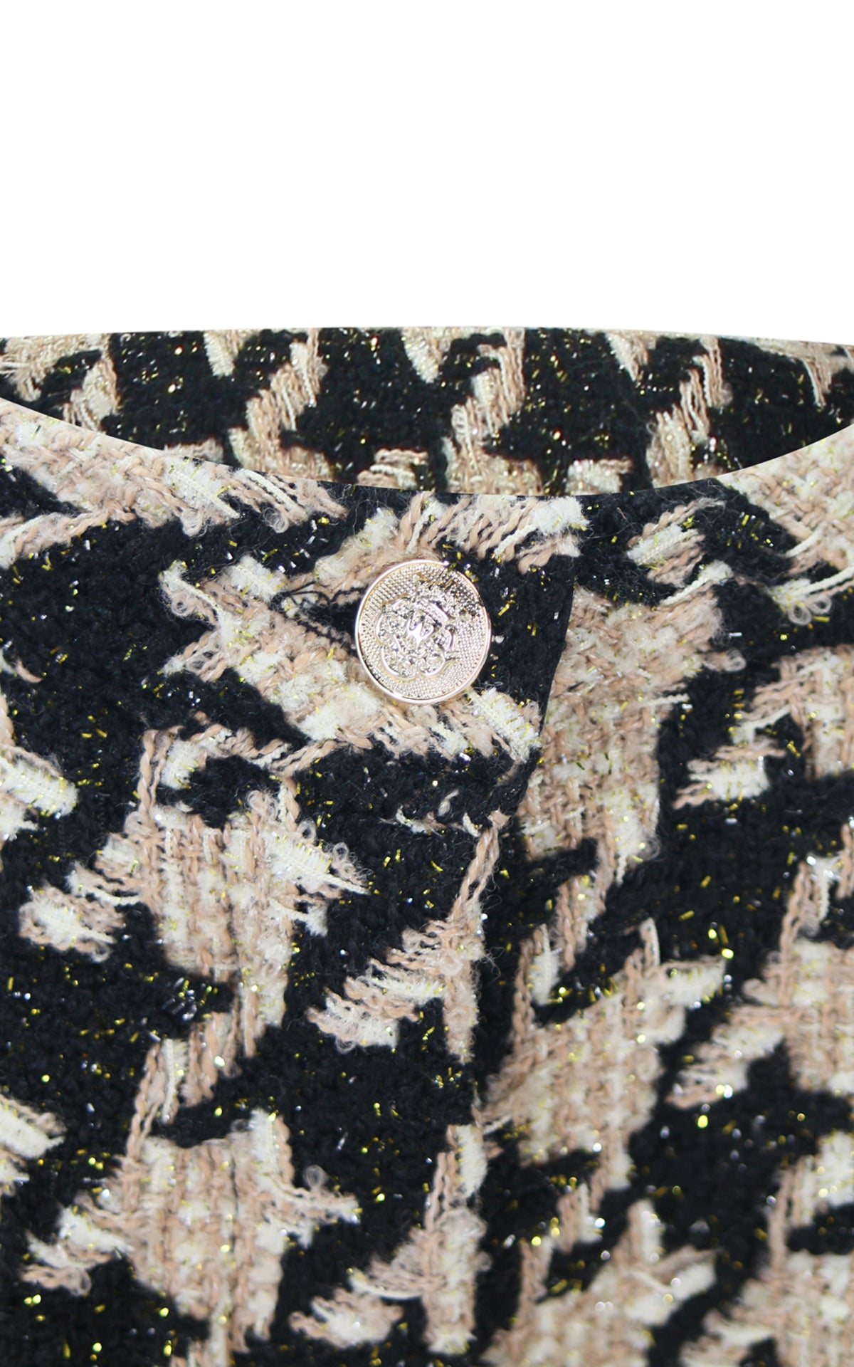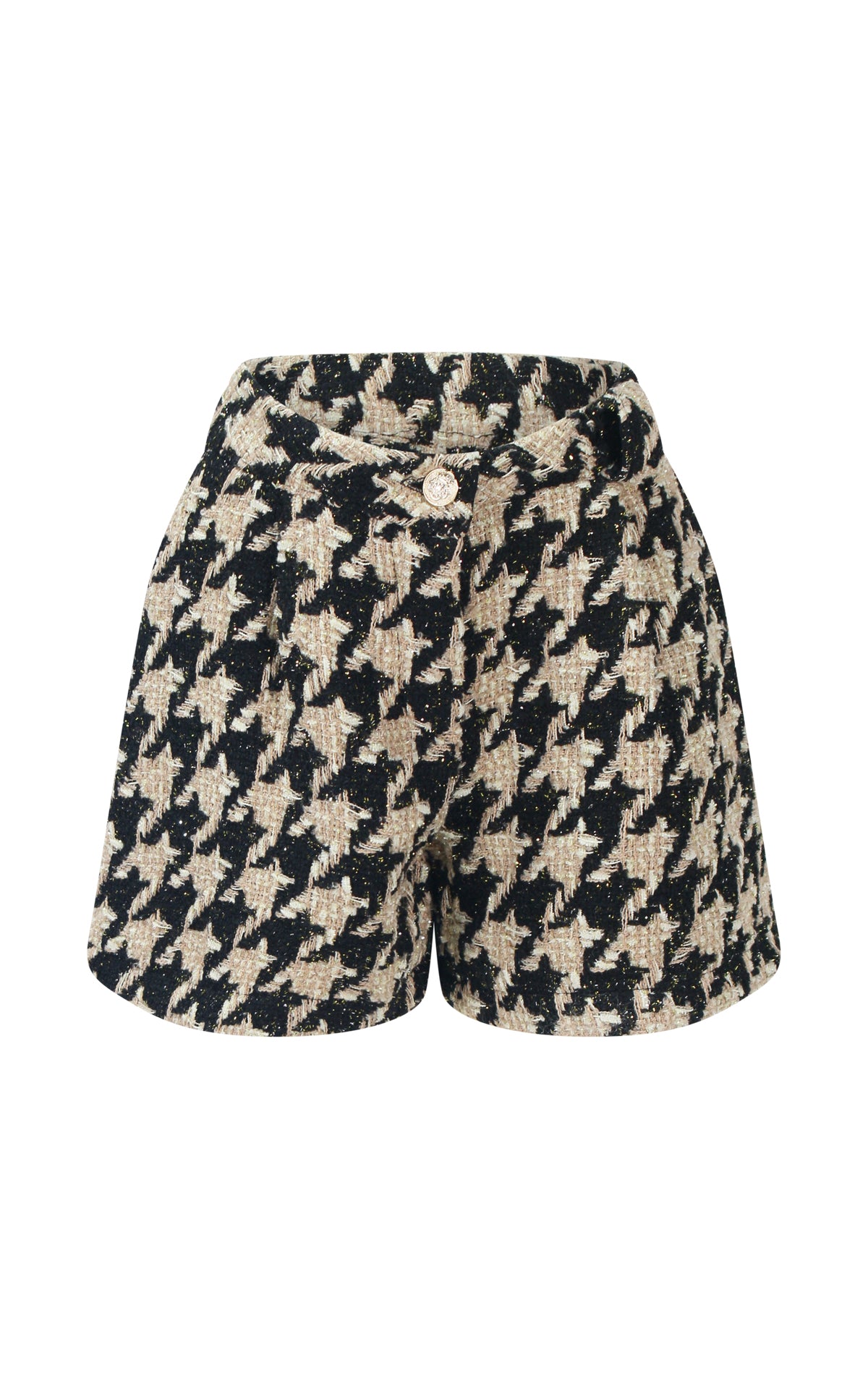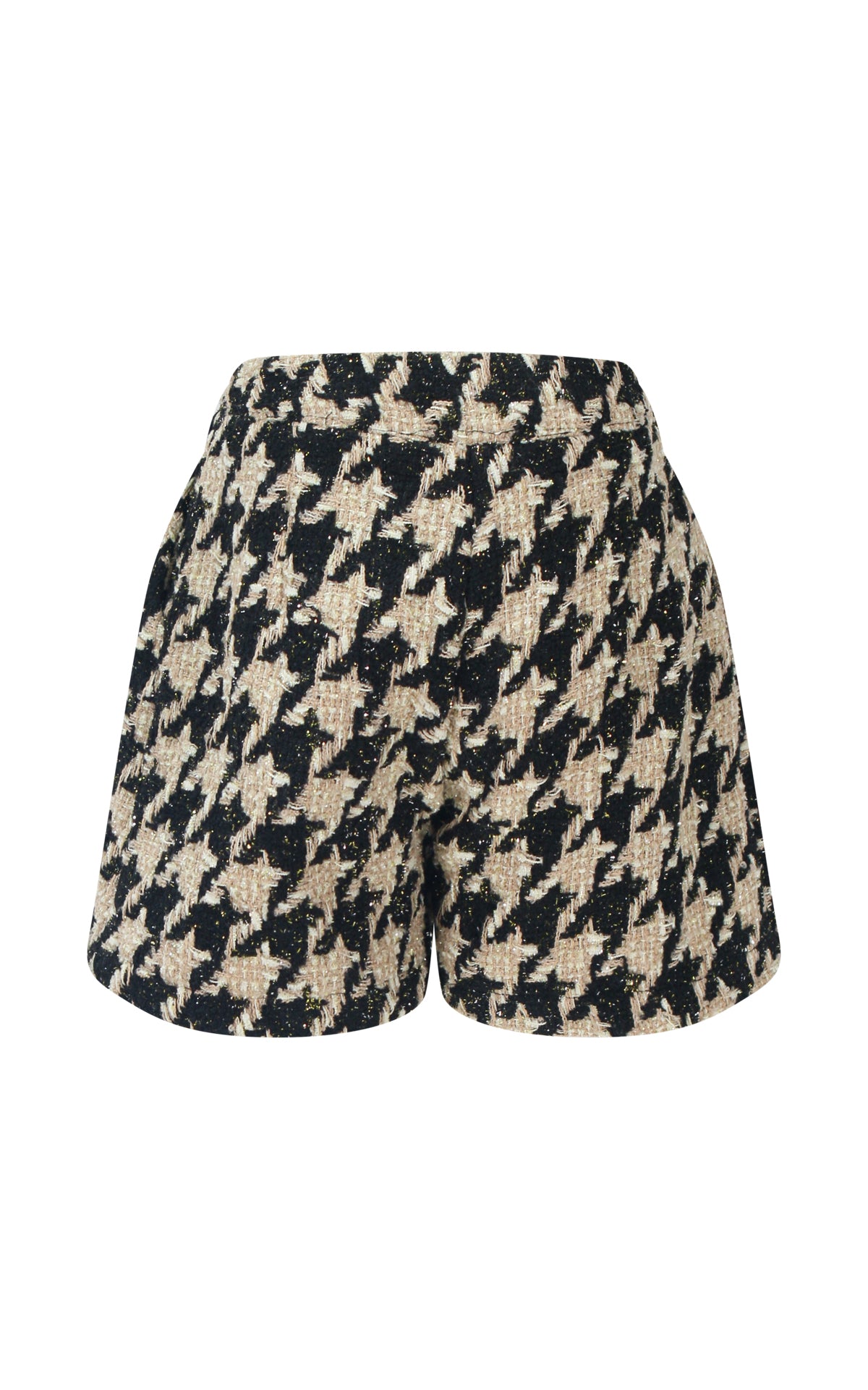 BERMUDA IN TESSUTO JAQUARD DISEGNO PIED DE POUL CON PINCES DAVANTI E PASSANTI FUNZIONALI LUNGO IL BUSTINO, APERTURA FUNZIONALE CENTRO DAVANTI MEDIANTE ZIP E BOTTONE NAPOLEONICO GOLD
