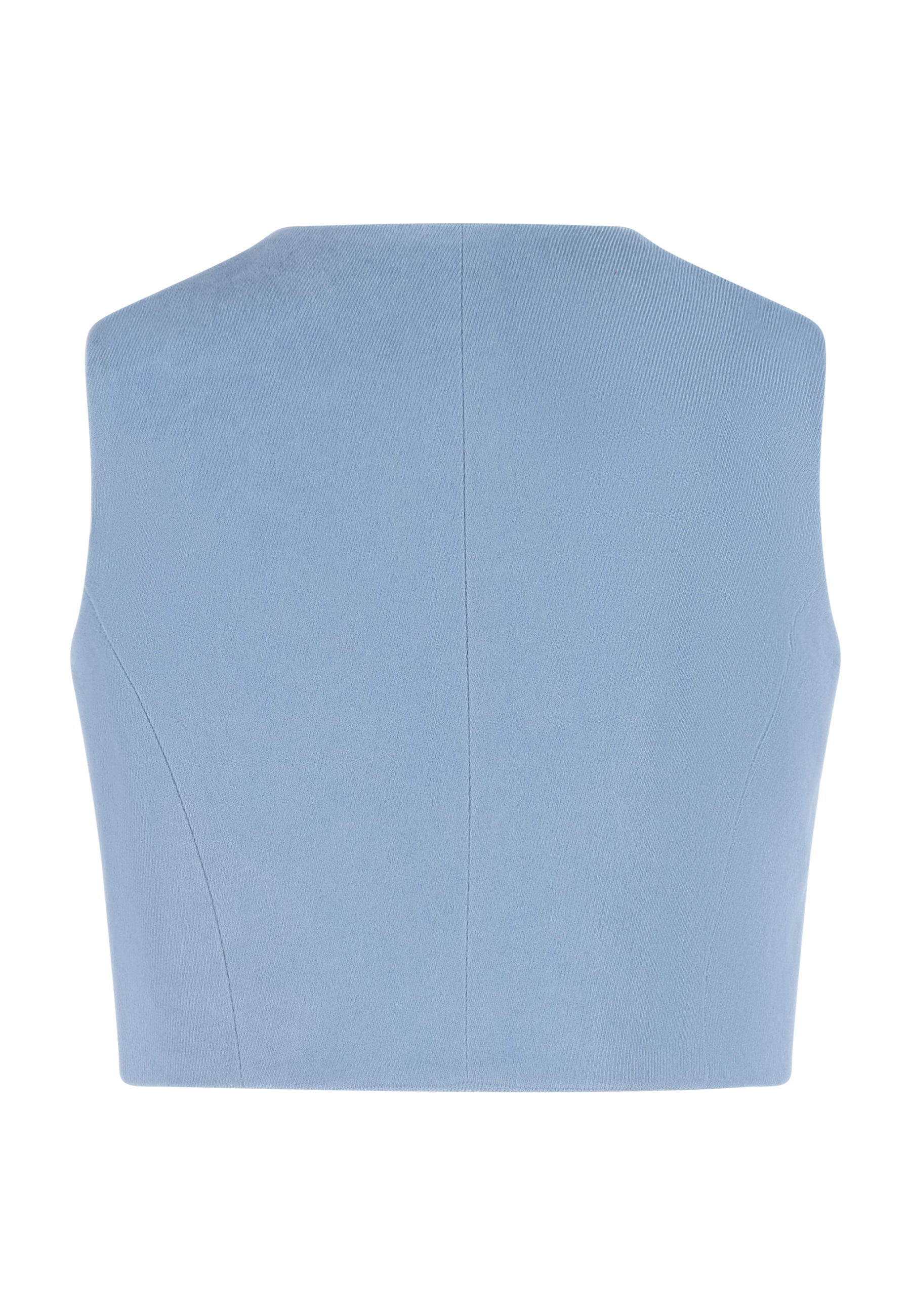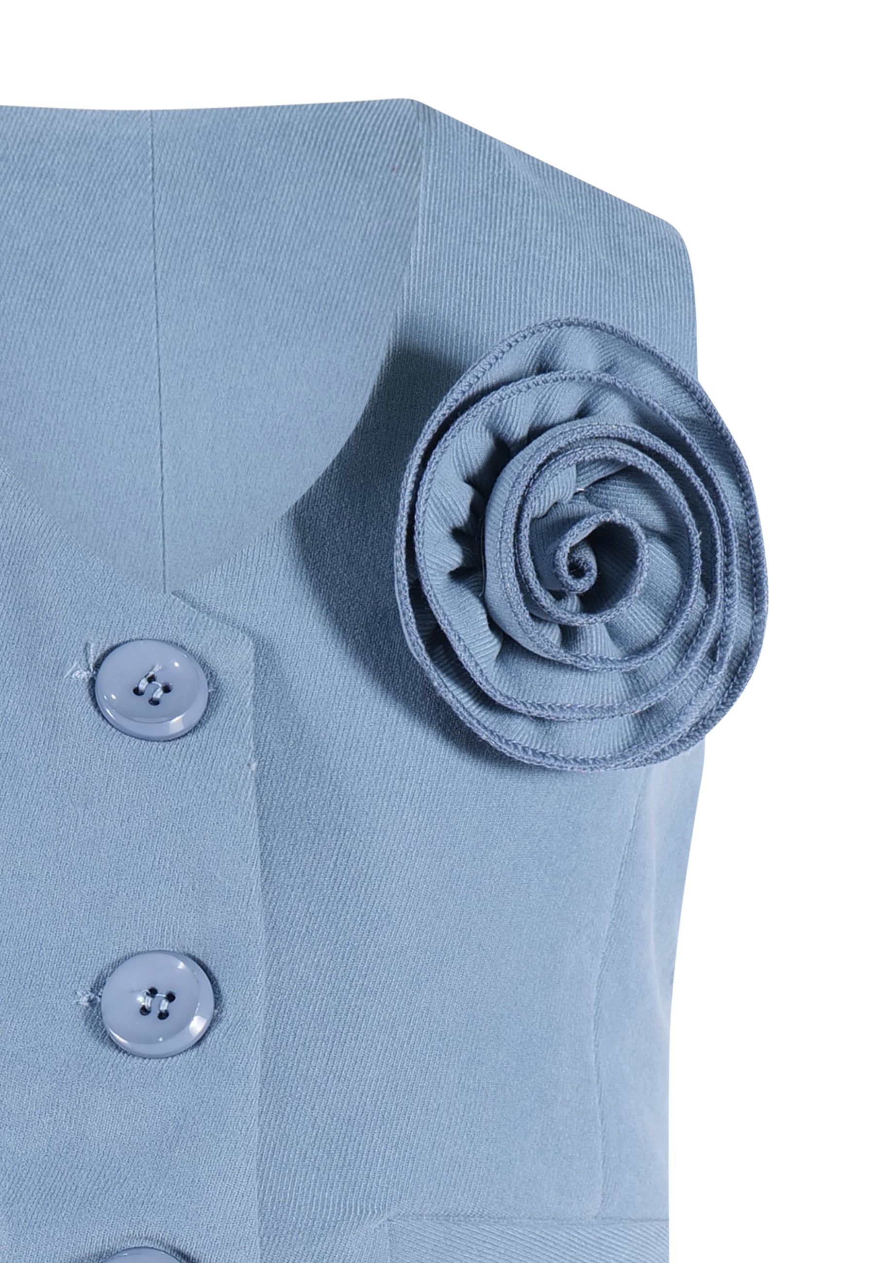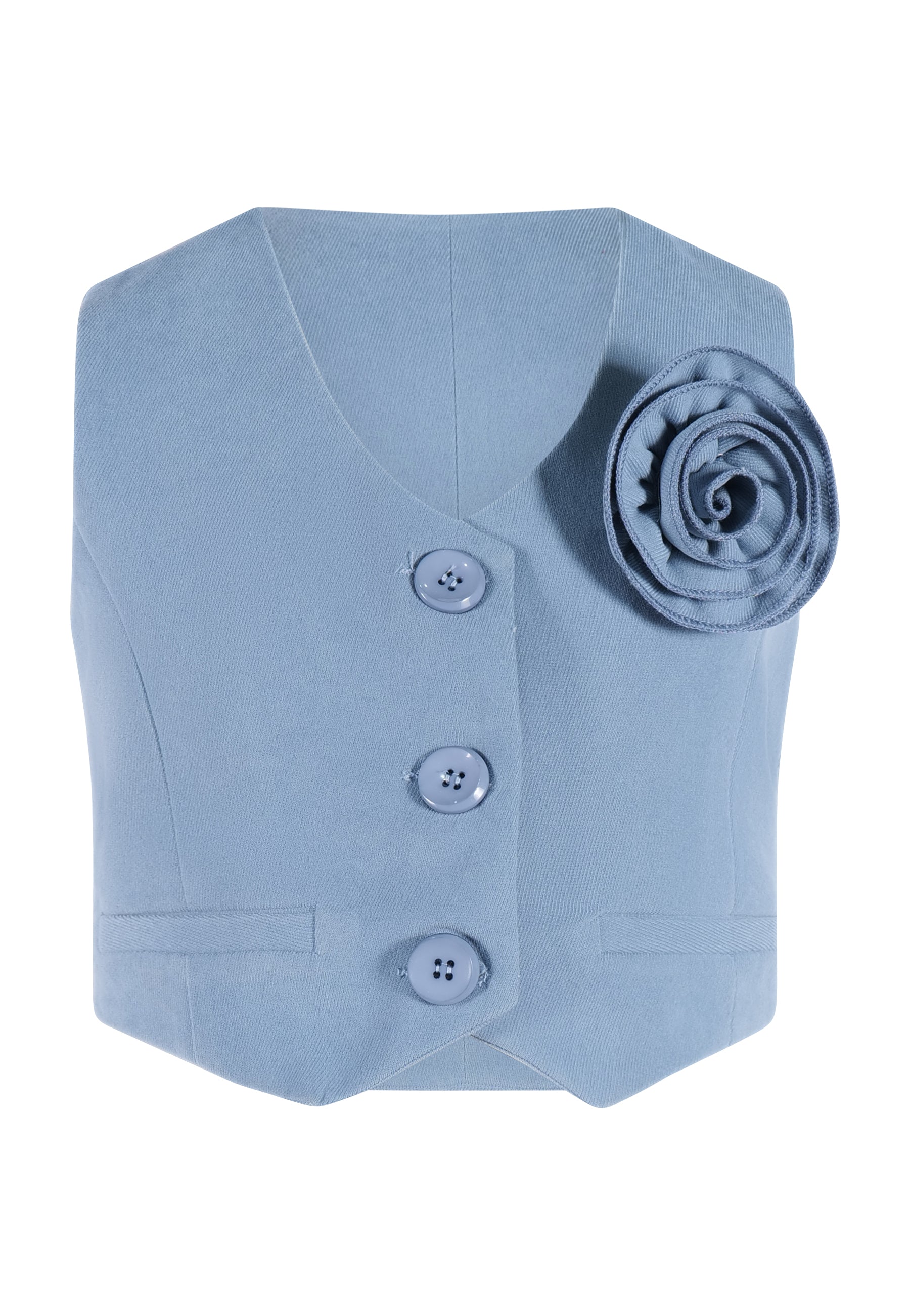 GILET CORTO IN TESSUTO VELLUTO A COSTE STRETTE, FODERA IN TONO E CHIUSURA CENTRALE CON BOTTONI INTONO, FIORE DECORATIVO LATERALE IN TESSUTO.