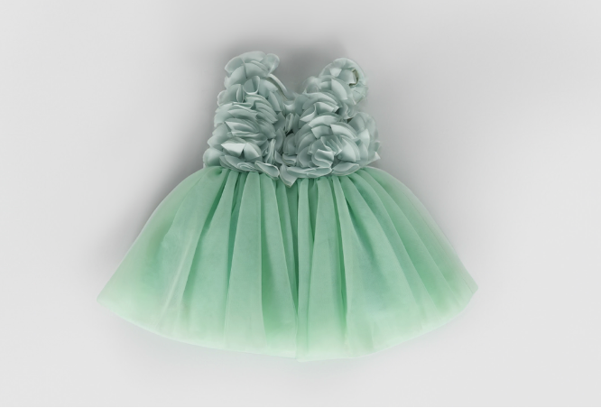 Questo dolce vestito a bambolina in tulle è impreziosito da un corpetto con applicazioni di fiori a rilievo in tessuto, che aggiungono un tocco di raffinatezza e delicatezza. La chiusura posteriore con zip garantisce una vestibilità perfetta. Un abito ideale per eventi eleganti, che farà sentire ogni bambina speciale.