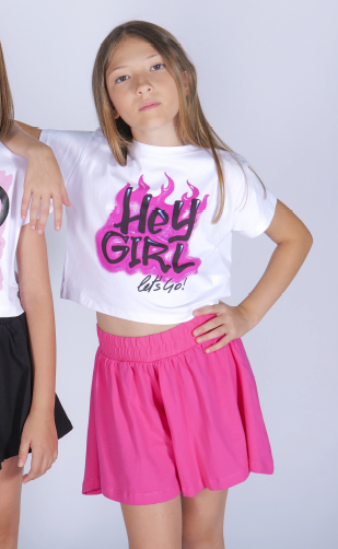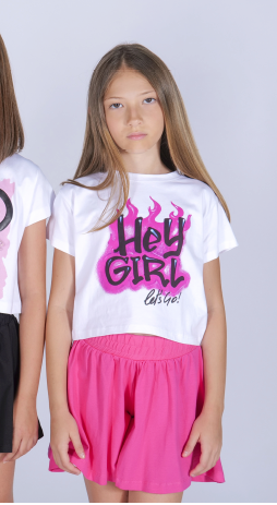 Maglietta: realizzata in tessuto leggero con scollo rotondo e maniche corte, impreziosita da una stampa frontale per un tocco moderno e vivace.