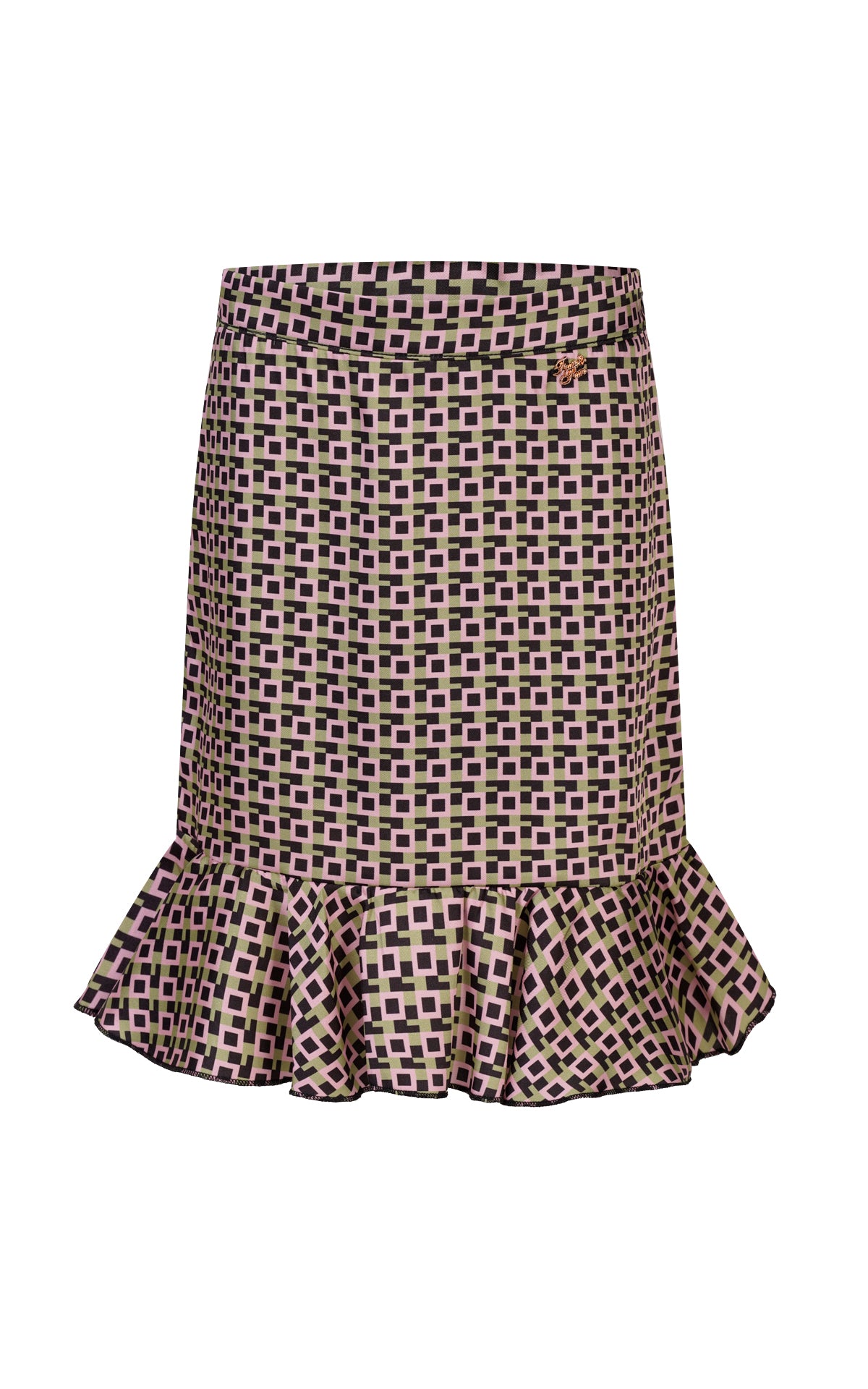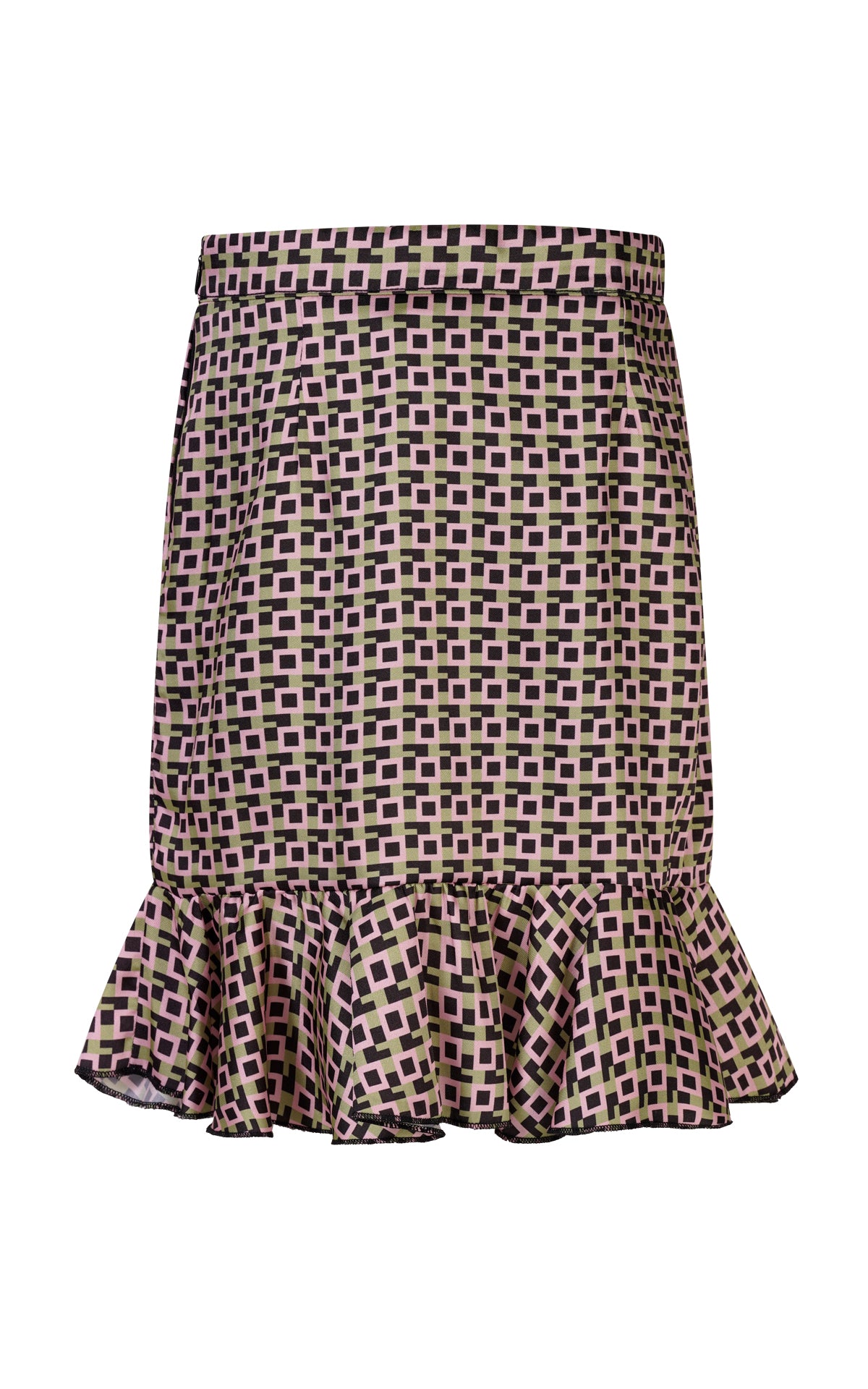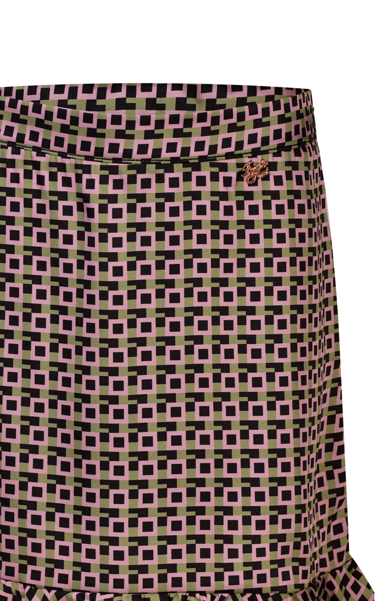 GONNA DRITTA CORTA IN RASO FANTASIA GEOMETRICA MULTICOLOR CON ZIP FIANCO INVISIBILE E FONDO CON ROUCHES RIFINITO CON ORLINO A CONTRASTO
