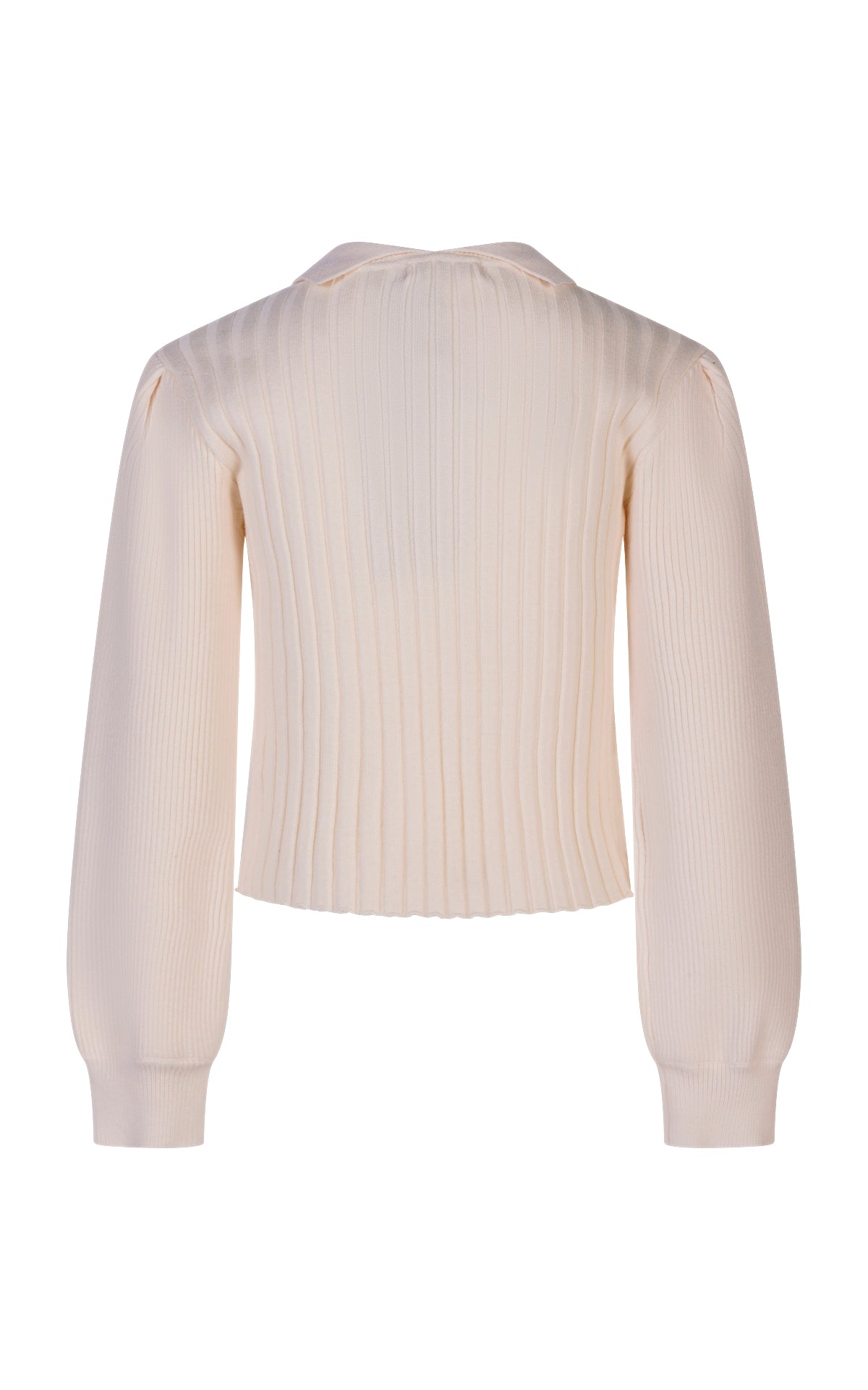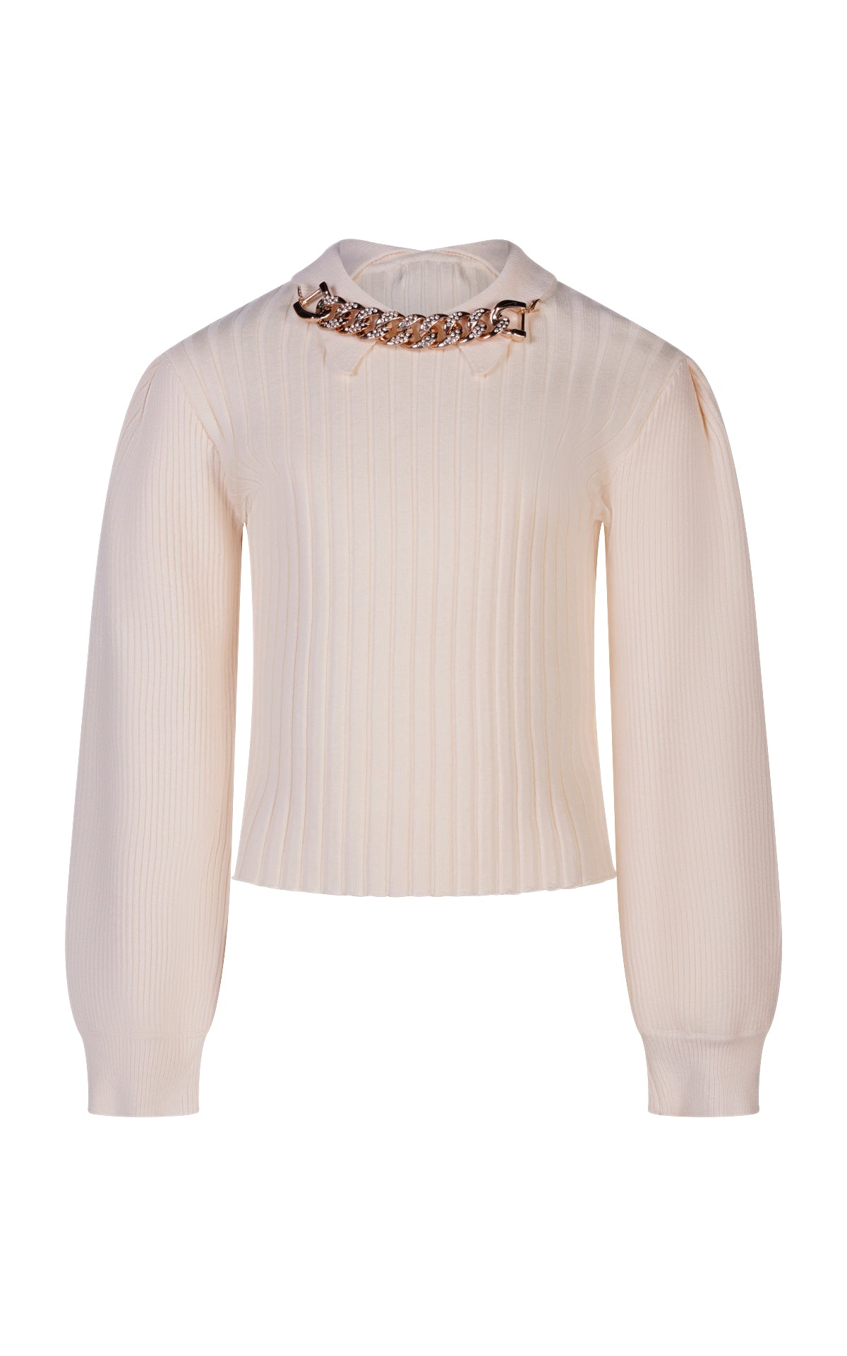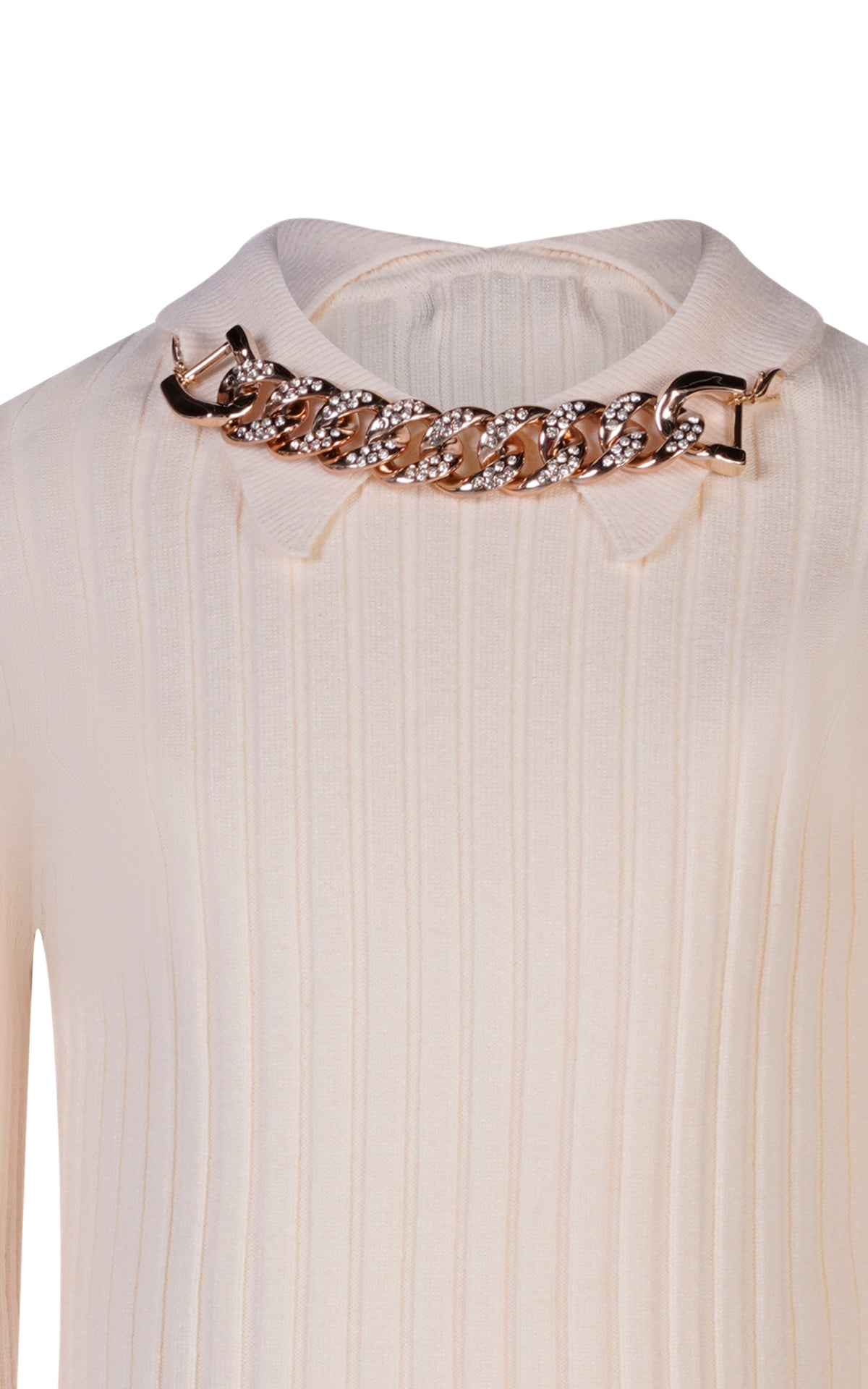 MAGLIA IN LANA CON COLLO A CAMICIA CON APPLICAZIONE DI CATENA SOTTO IL GIRO COLLO DAVANTI, MANICHE AMPIE CON SBUFFO SPALLA E POLSI, LANA SMACCHINATA A COSTE