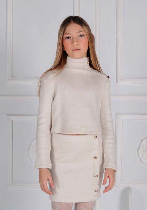 MAGLIA COLLO VULCANO IN LANA TAGLIATA SOFT CON BOTTONI MEZZA SFERA COLORE GOLD DECORATIVI SU SPALLA.