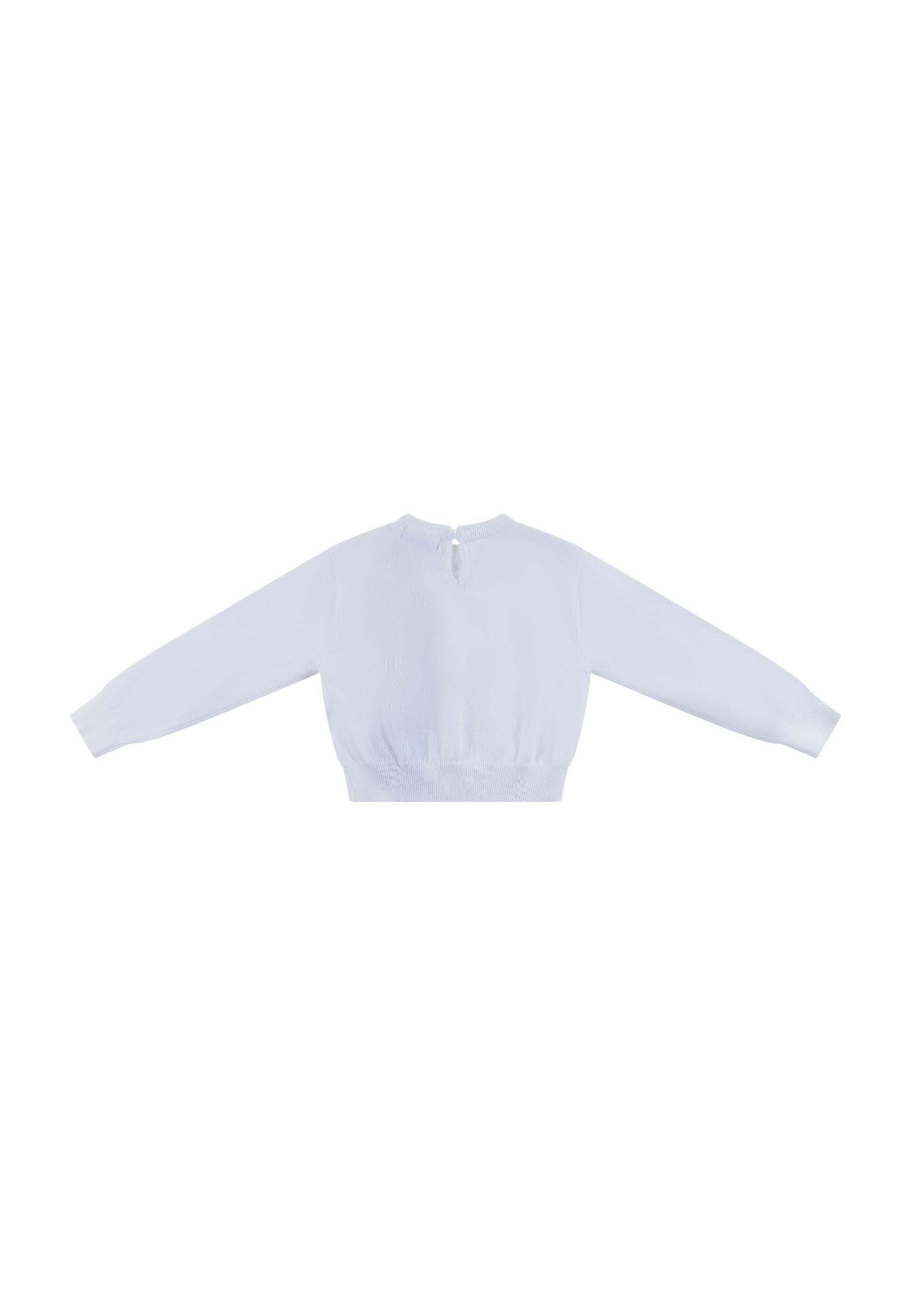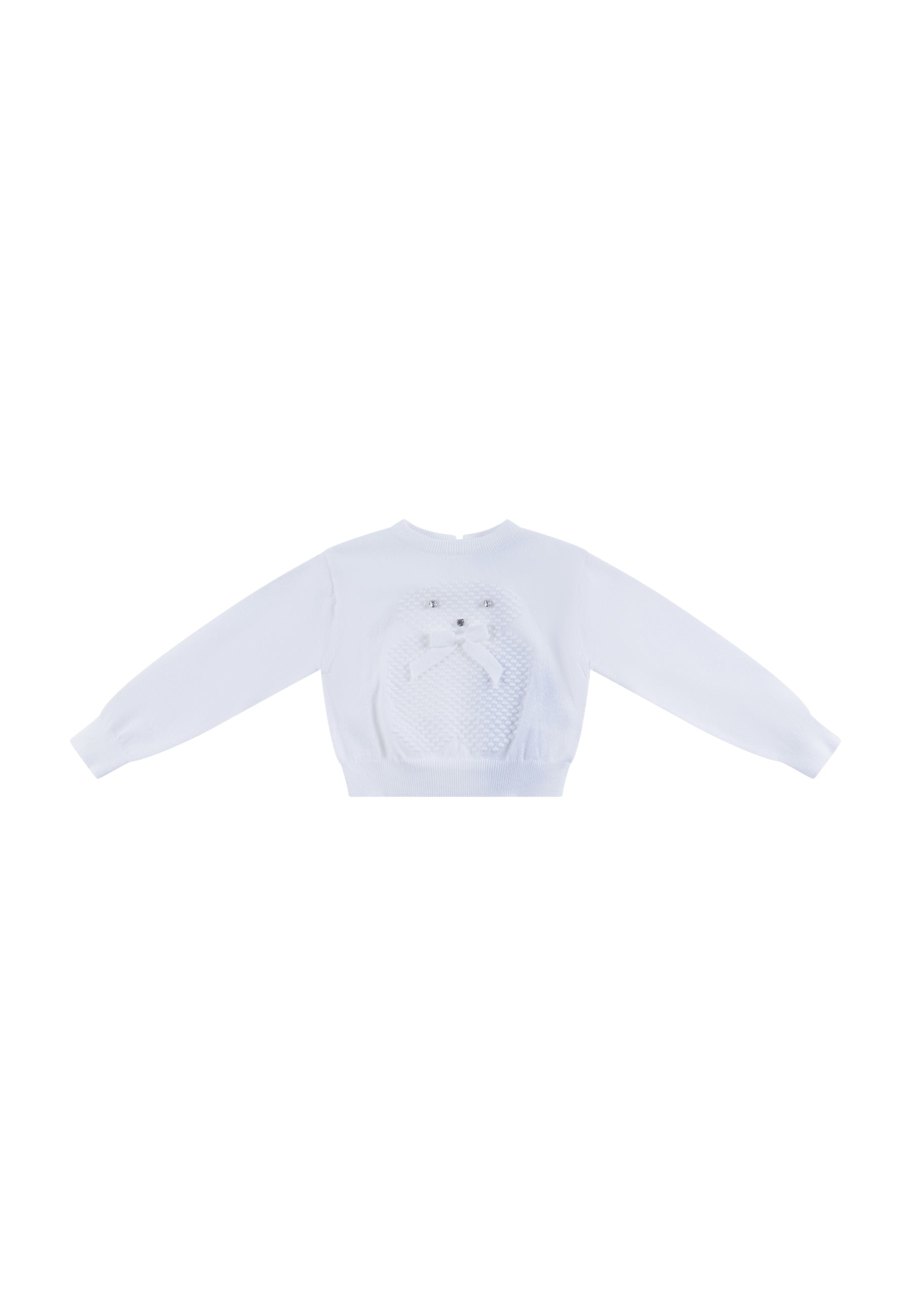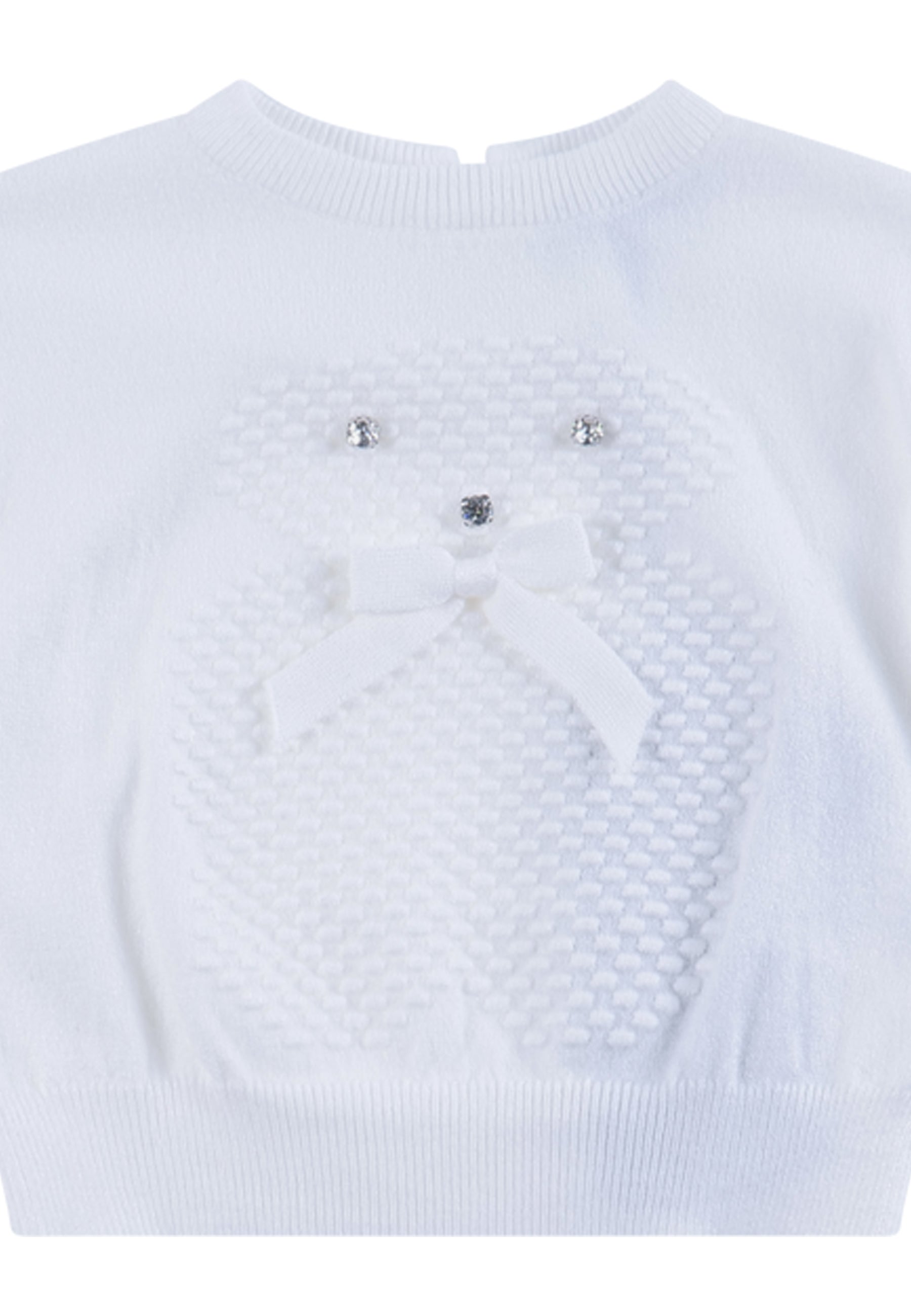 MAGLIONCINO IN LANA SMACCHINATA GIROCOLLO E MANICHE LUNGHE . LAVORAZIONE LANA FRONTALE CON INTERSIO TEDDY IN TONO CON FIOCCHETTO E STRASS APPLICATI. CHIUSURA COLLO DIETRO CON BOTTONE IN TONO .