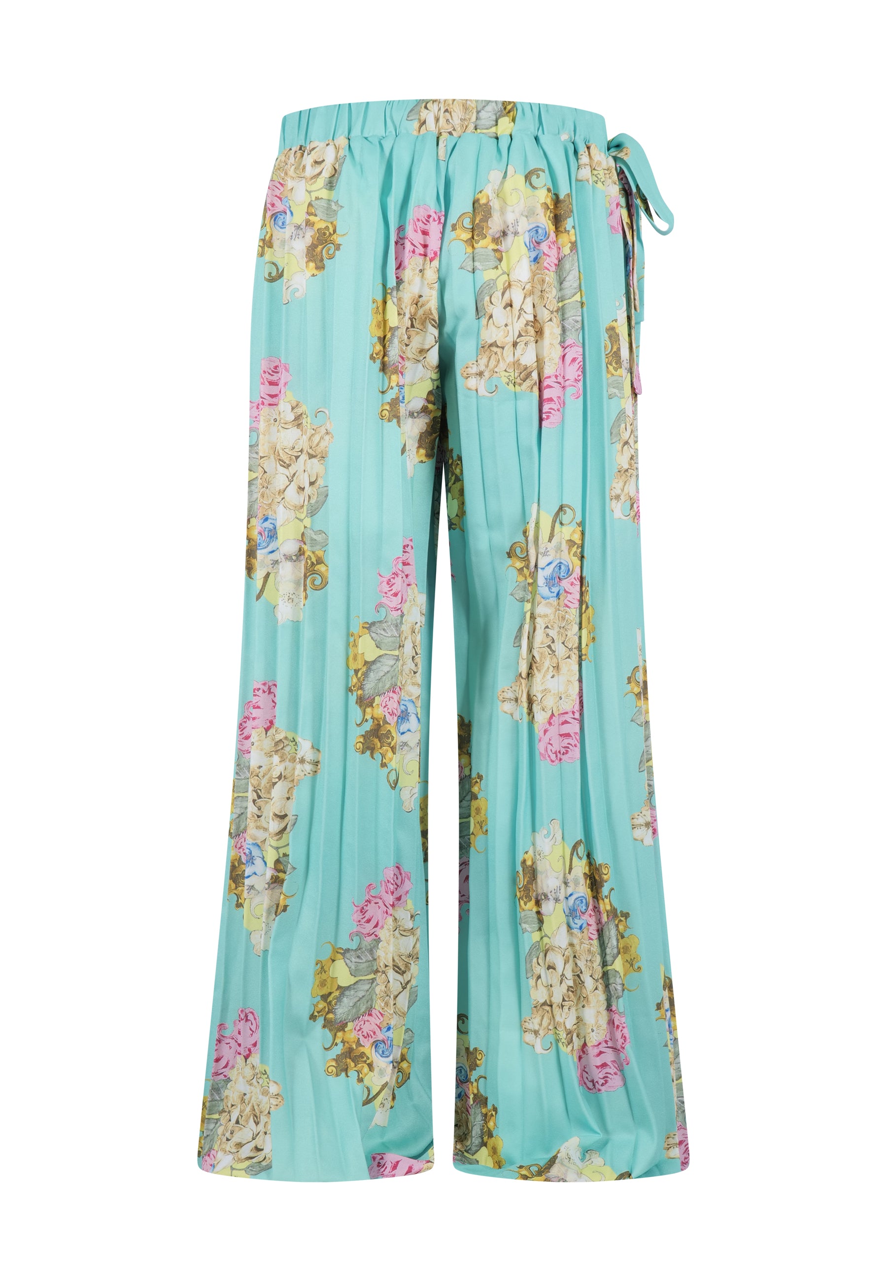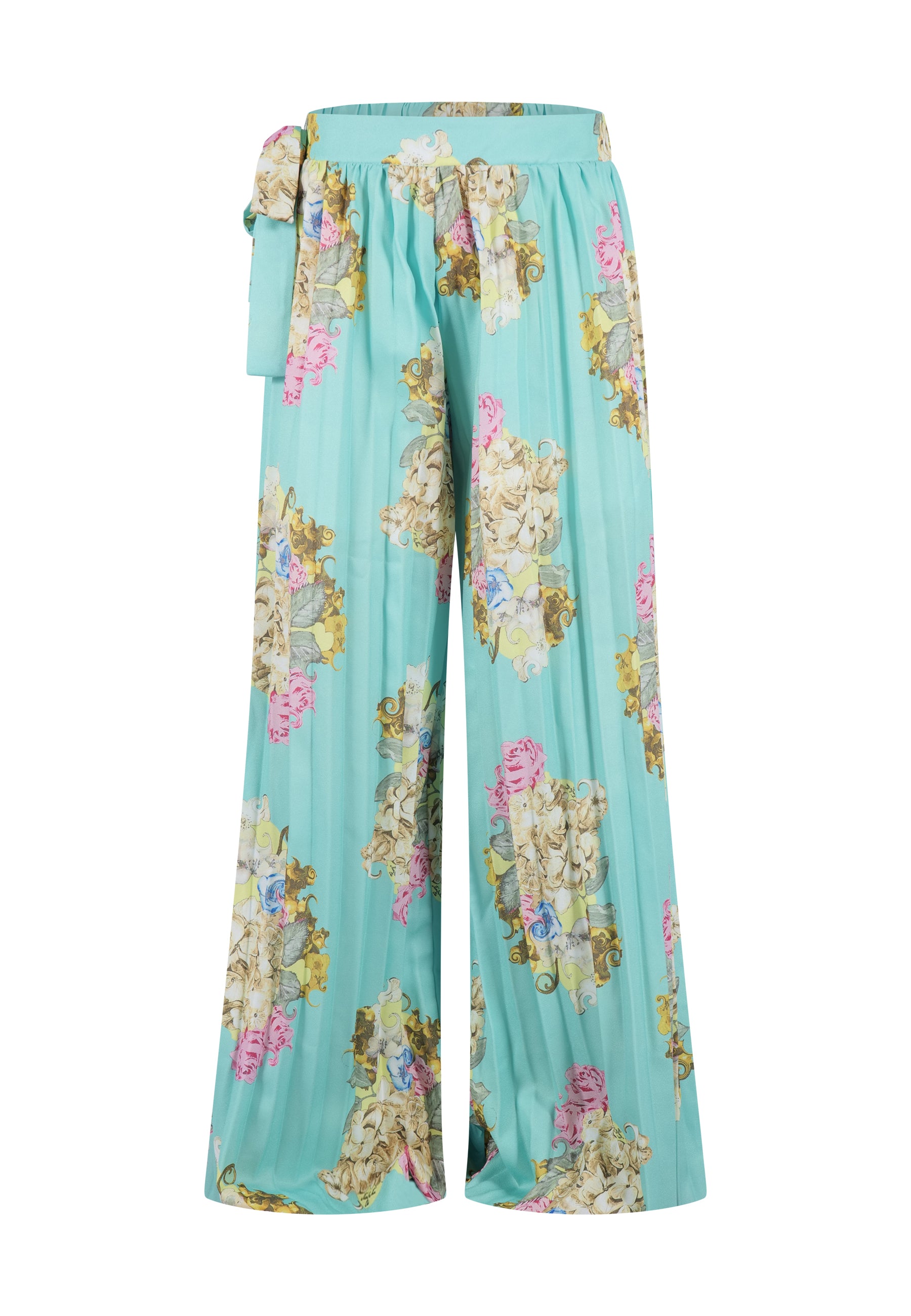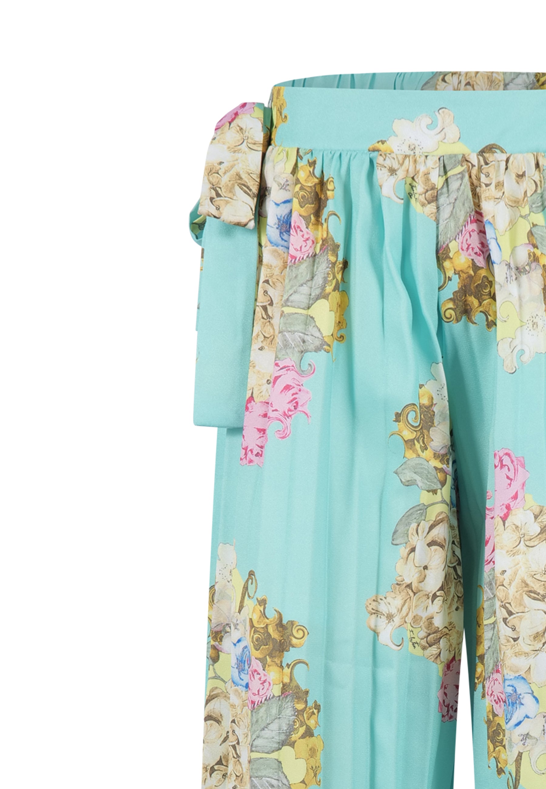 PANTALONI STAMPA FLOREALE MODELLO PALAZZO IN VISCOSA FLUIDO PLISSÈ CON BUSTINO E CINTURA AVVOLTA A FIOCCO
