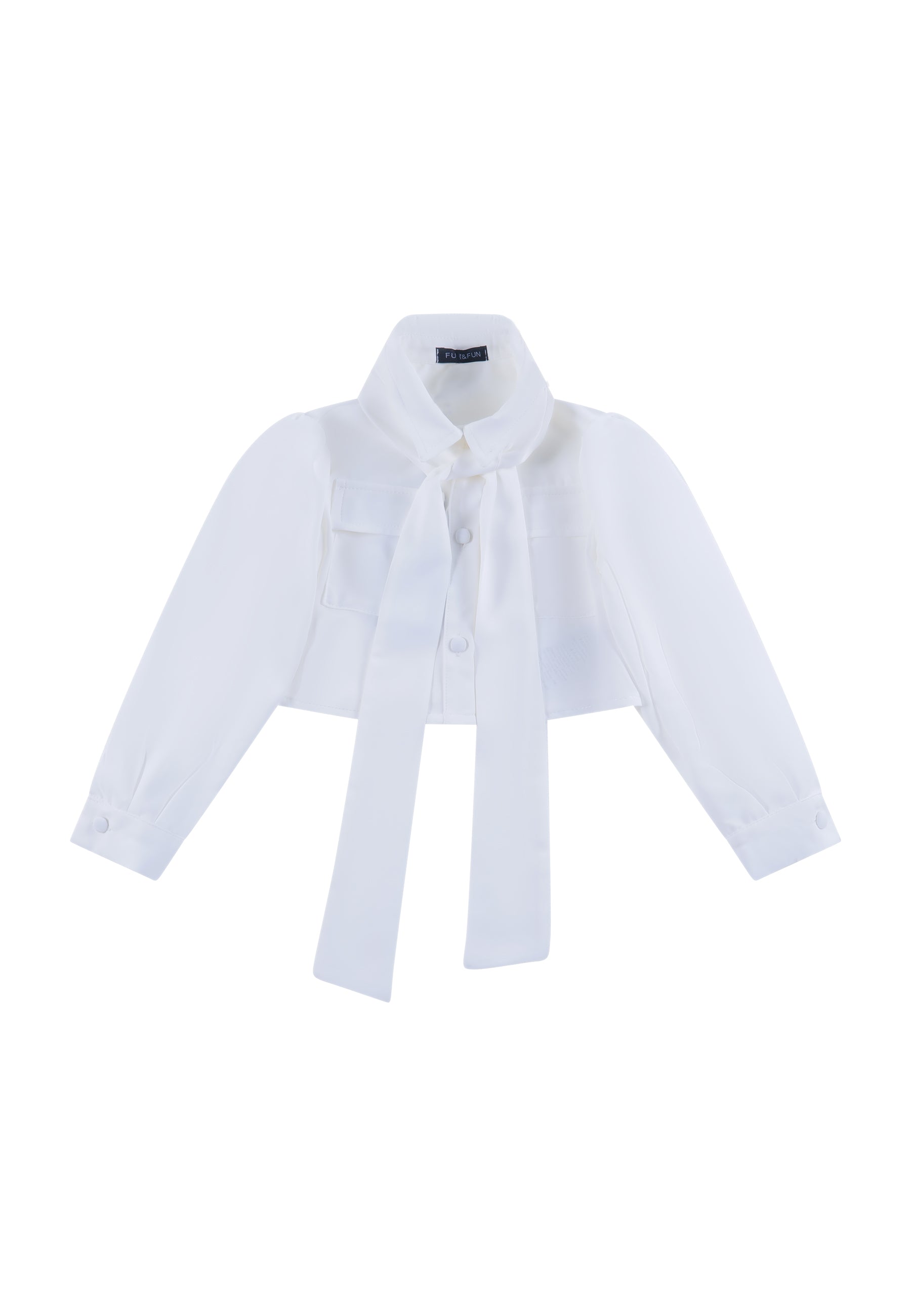 CAMICIA IN TESSUTO FLUIDO CON COLLETTO E MANICHE LUNGHE . ABBOTTONATURA CENTRO DAVANTI E POLSI FONDO MANICA CON BOTTONCINI RIVESTITI IN TESSUTO IN TONO. TASCHE CON PATTINE SUL PETTO . FUSCIACCA AL COLLO CON FIOCCO REGOLABILE.