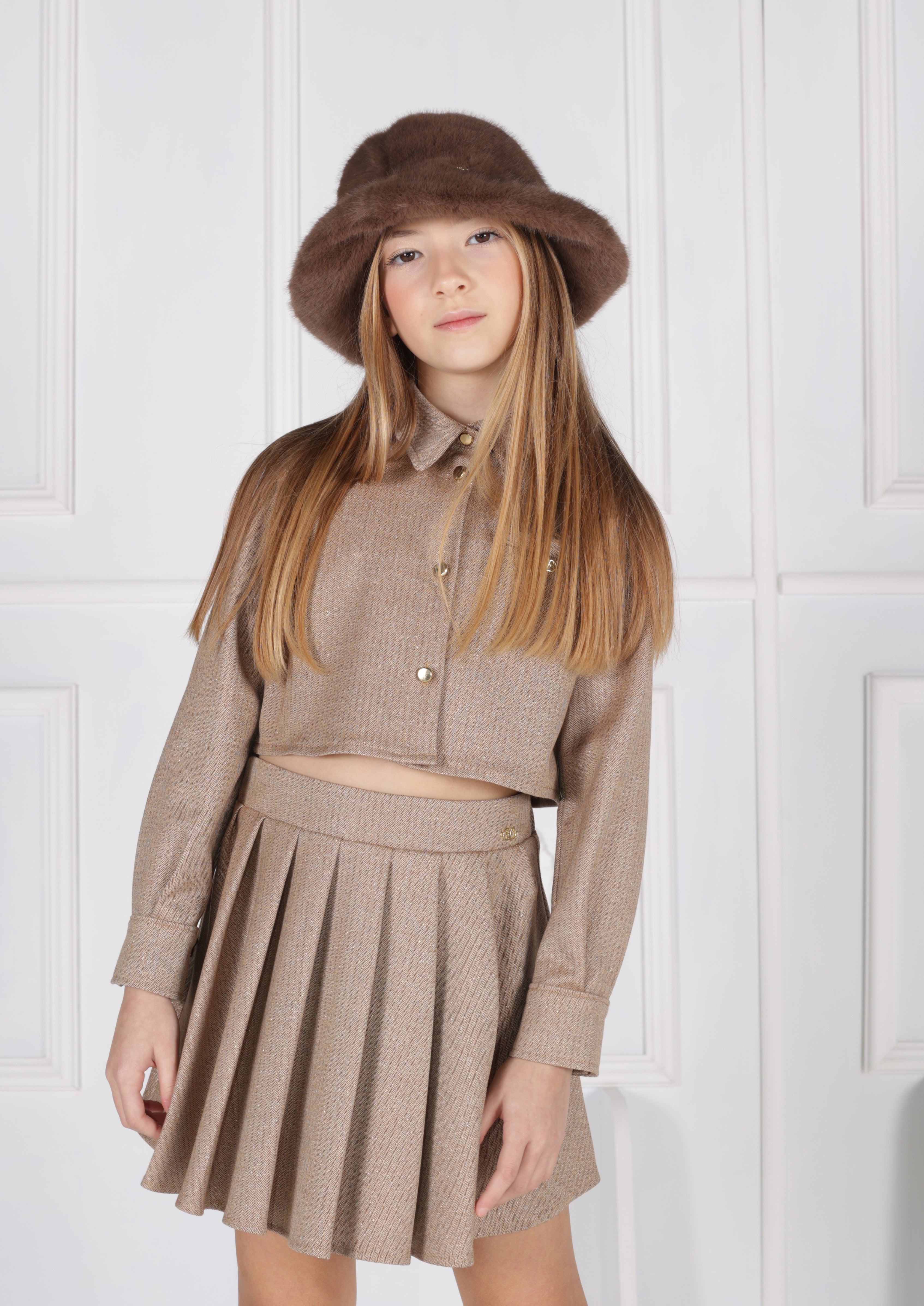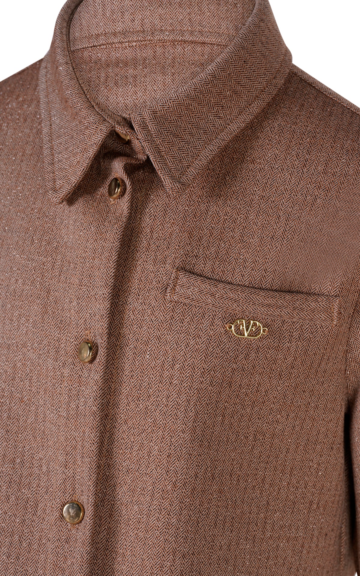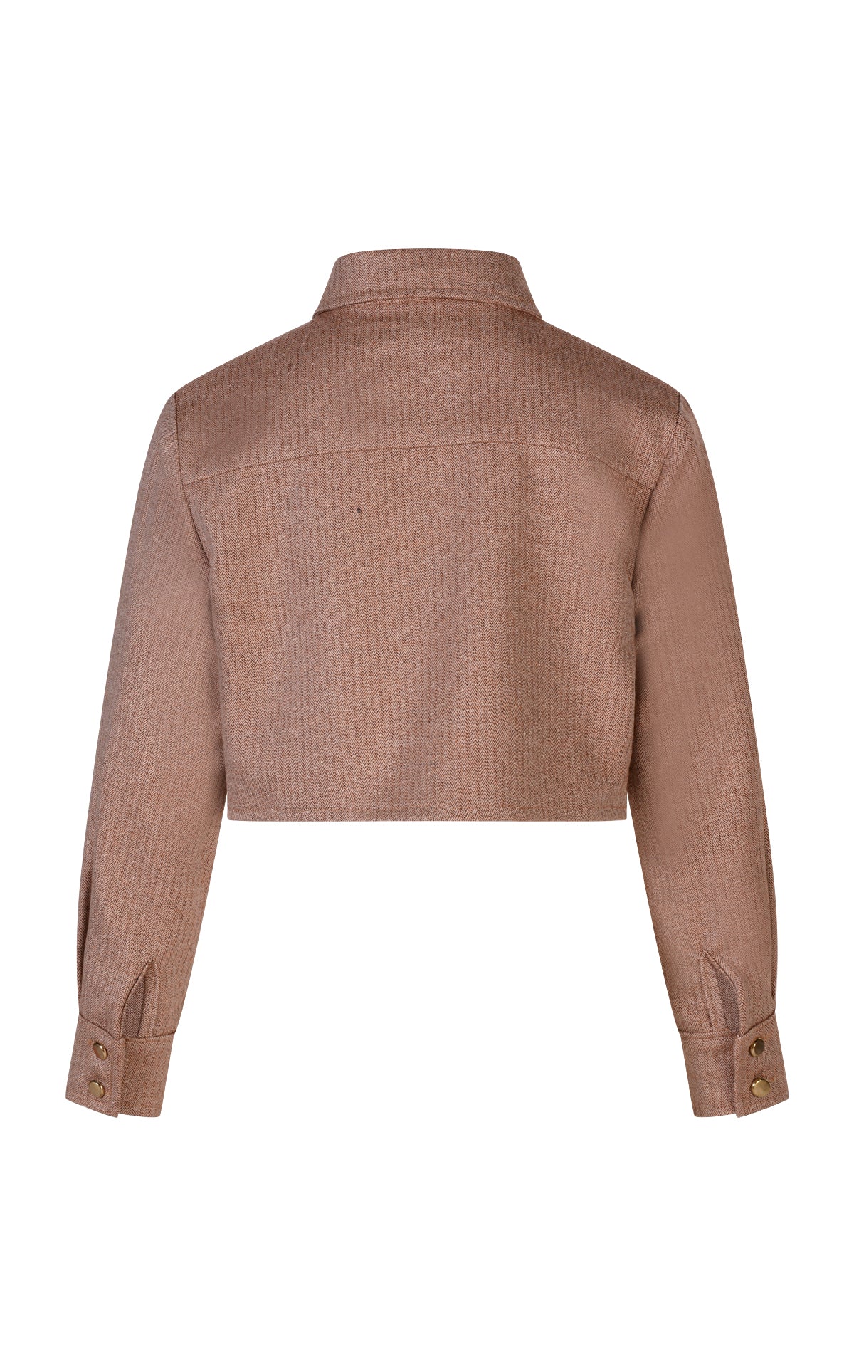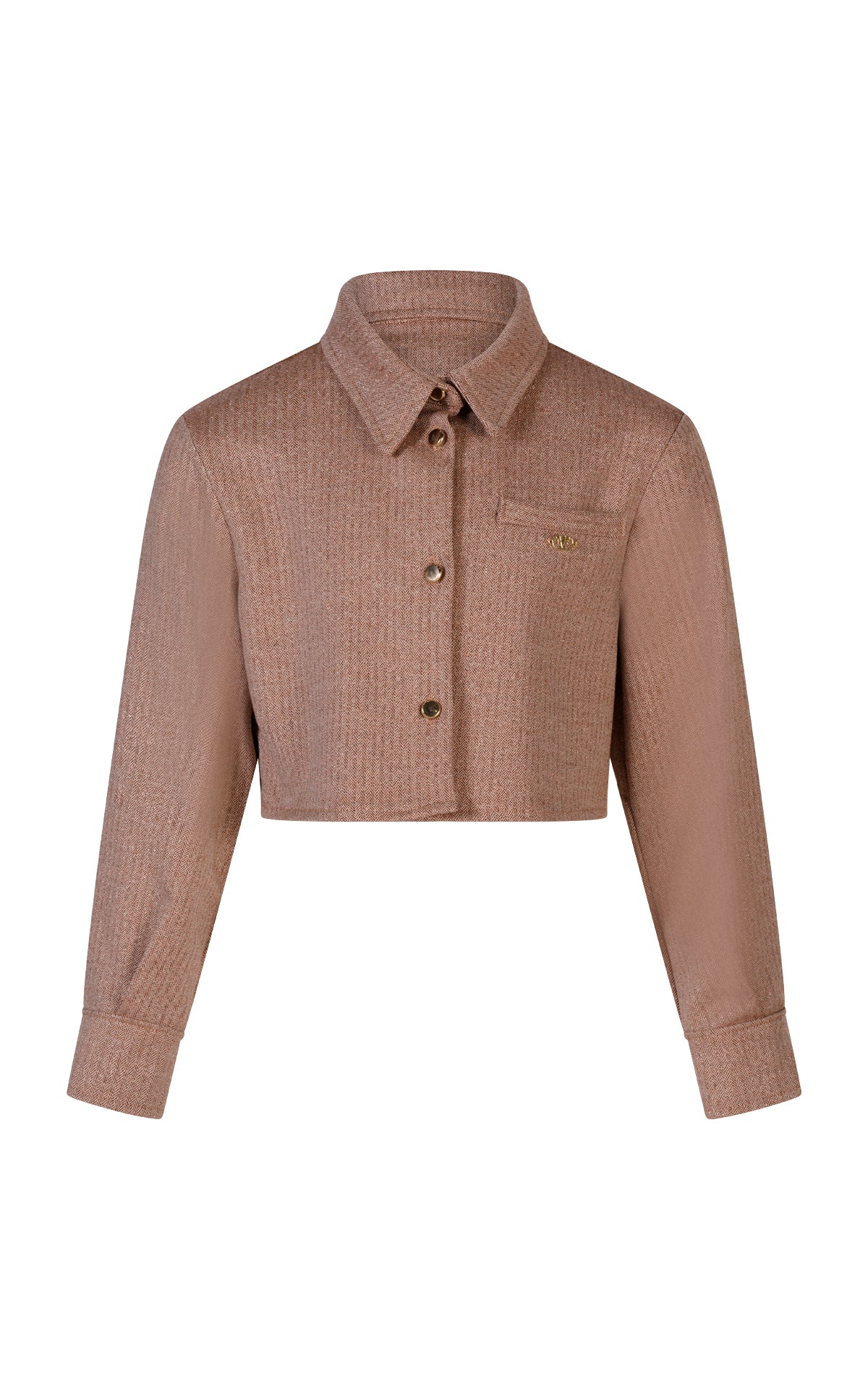 Camicia corta cropped con colletto classico e maniche lunghe terminate da polsi al fondo. Chiusura frontale con bottoni in metallo per un tocco moderno e deciso. Dettaglio sul petto con friso elegante e placchetta logo che valorizza il capo con stile distintivo.