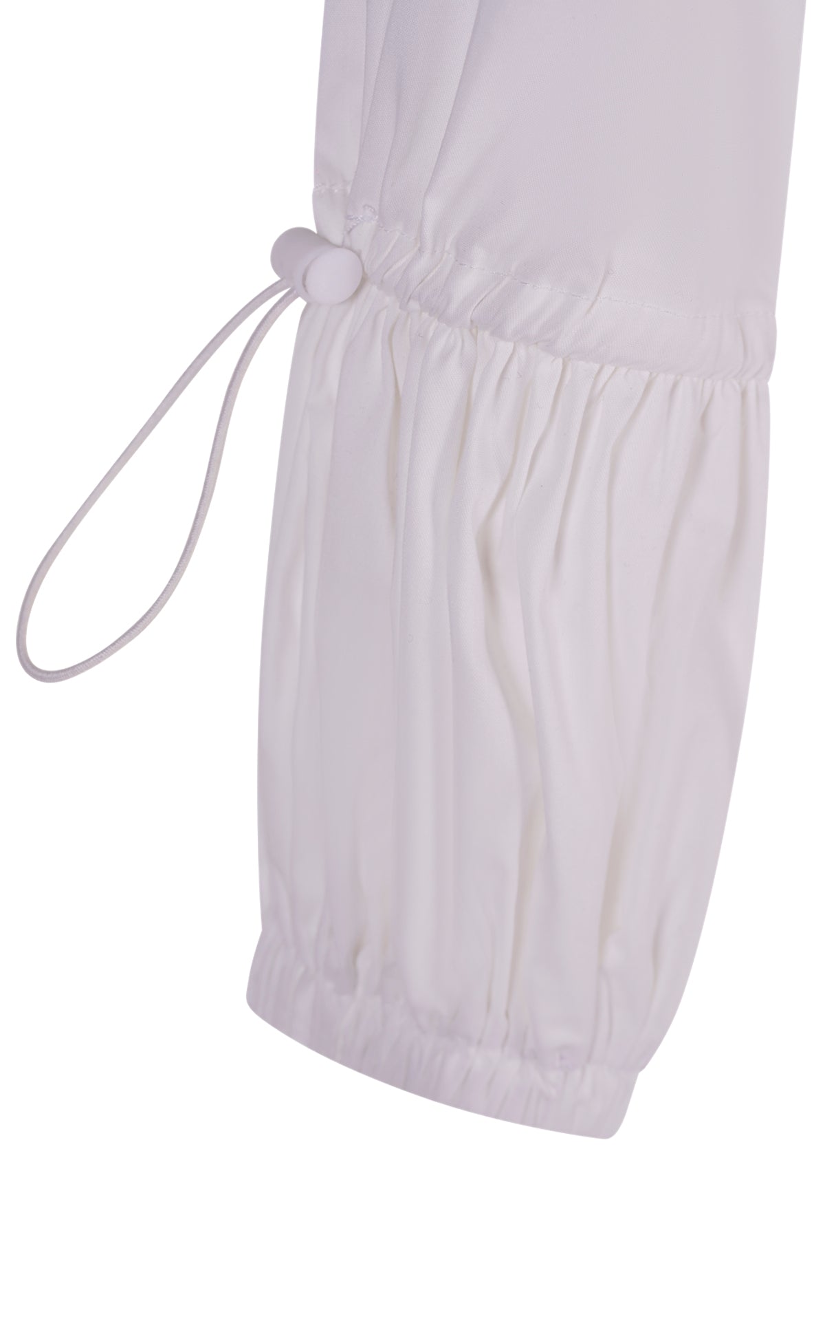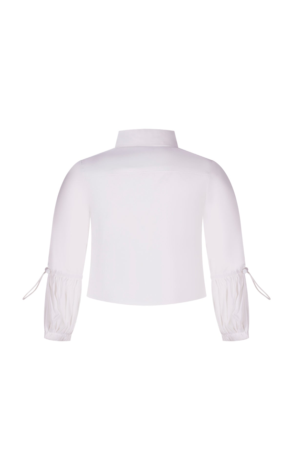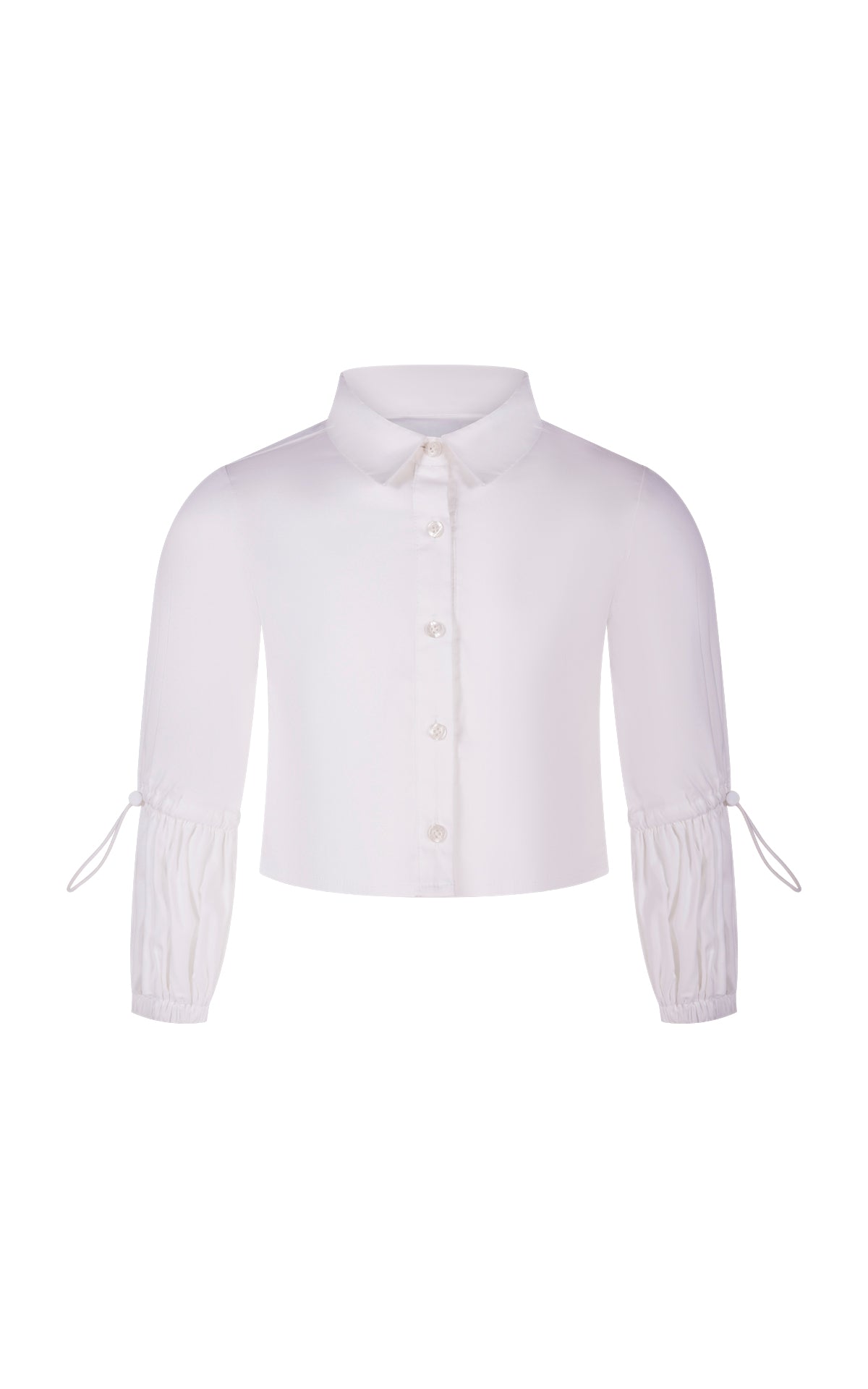 CAMICIA IN POPELINE DI COTONE CON COLLETTO E MANICHE LUNGHE. MANICHE A SBUFFO AL FONDO CON LACCETTO E REGOLATORR IN TONO . CHIUSURA FRONTALE CON BOTTONCINI IN TONO .